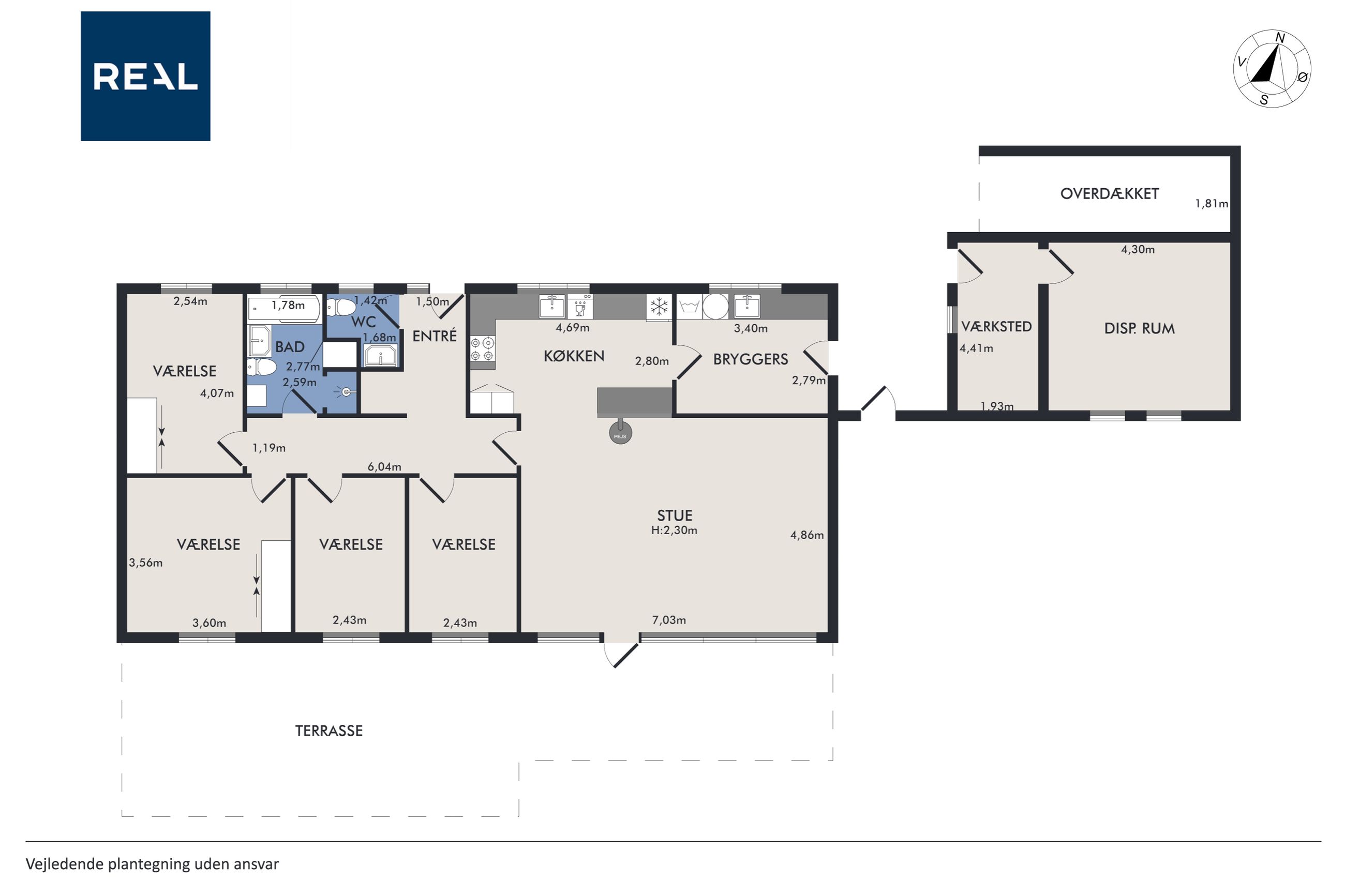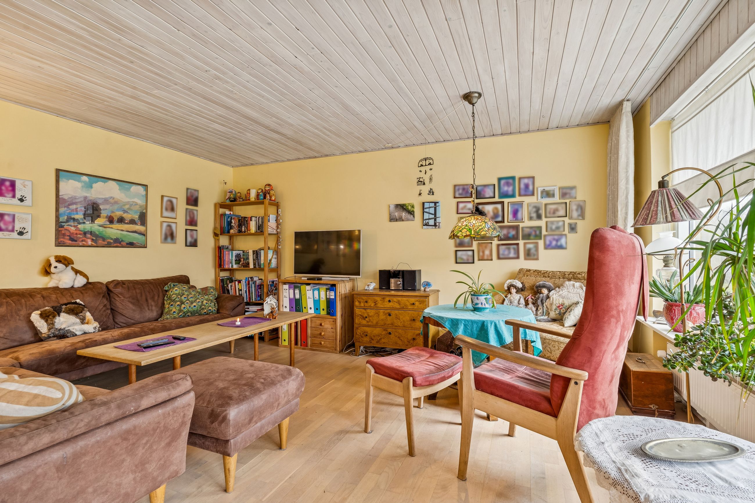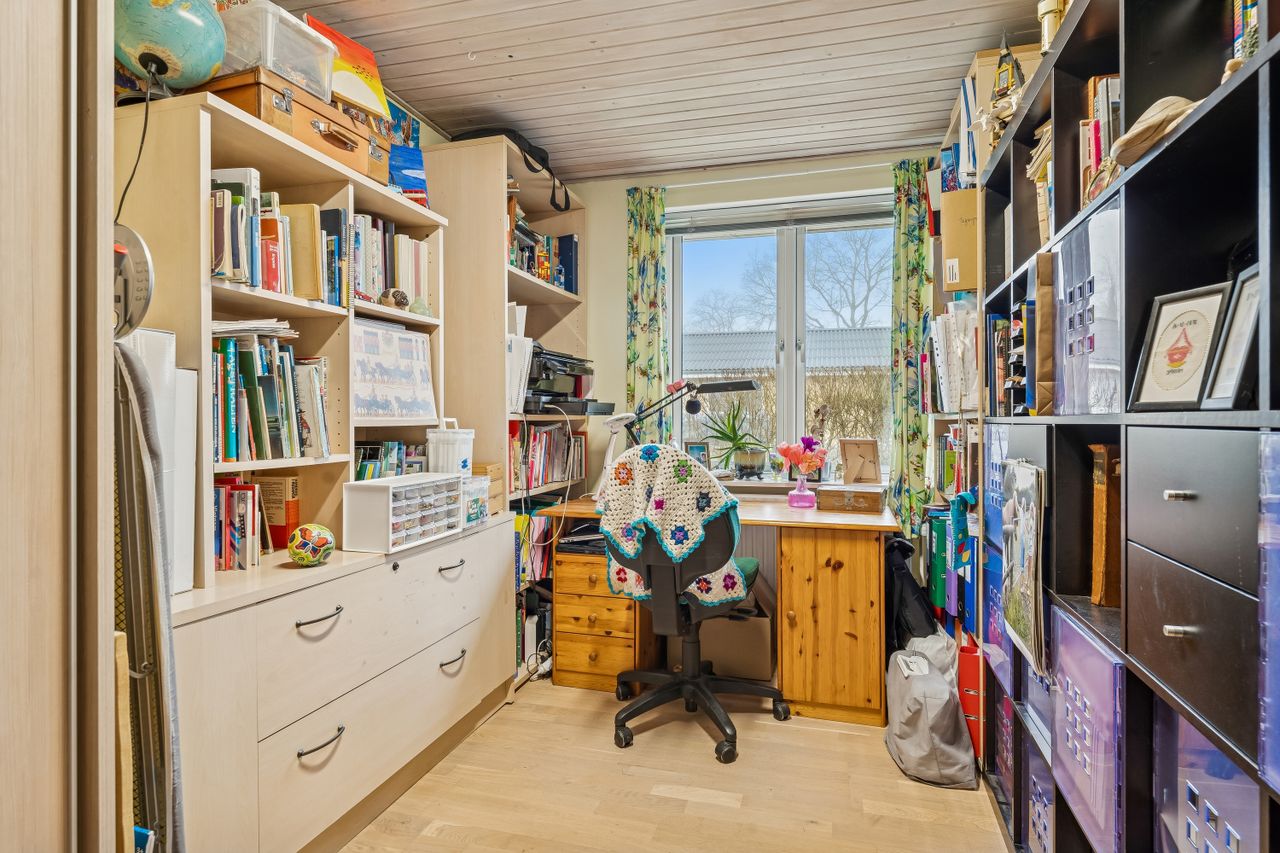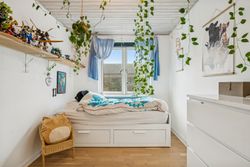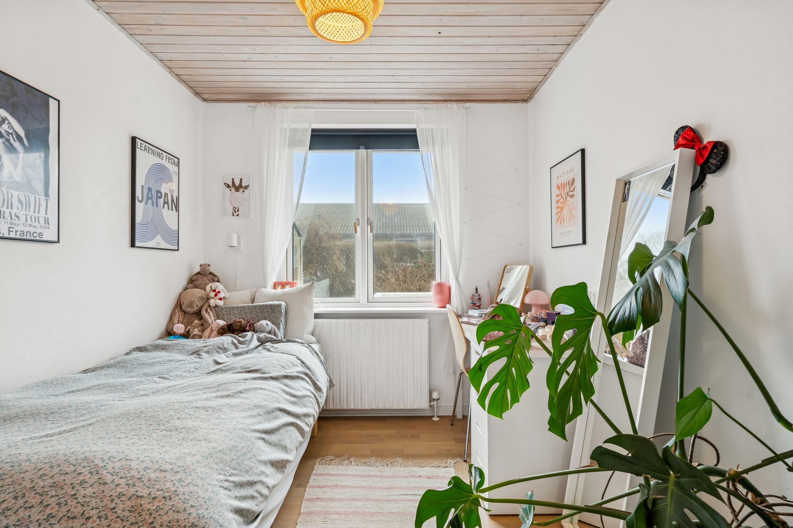 Boligen rummer et soveværelse samt tre værelser, alle med parketgulve. Soveværelset er rummeligt og lyst og med generøs skabsplads. To af værelserne er næsten ens i størrelse og velegnede som børneværelser, mens det tredje både kan bruges som ekstra værelse eller indrettes til kontor efter behov. Bryggerset har praktisk egen indgang, her er rigelig skabsplads, vask, bordplads og plads til vaskemaskine og tørretumbler.