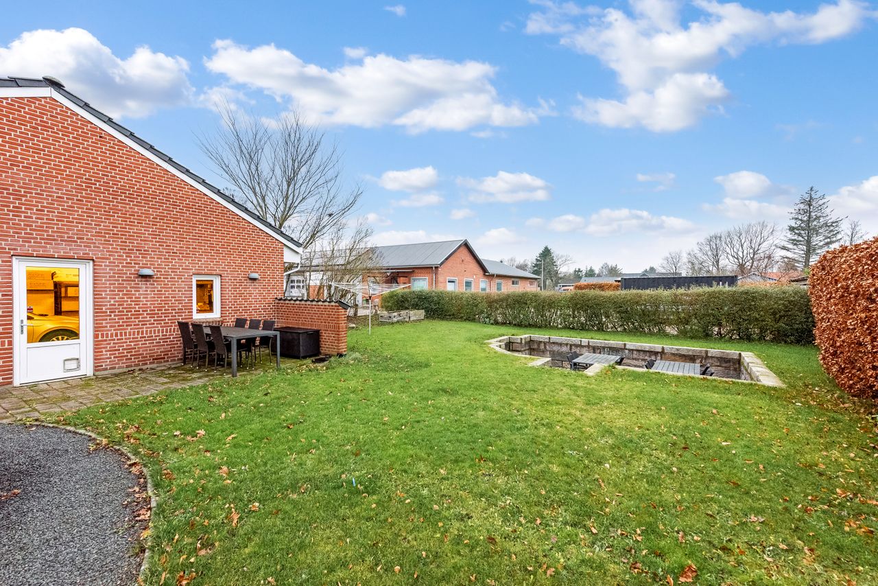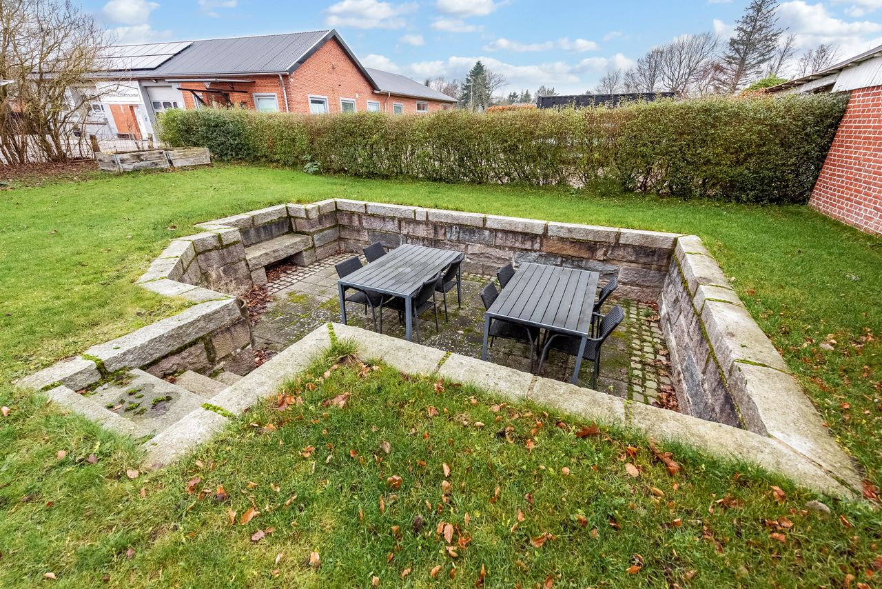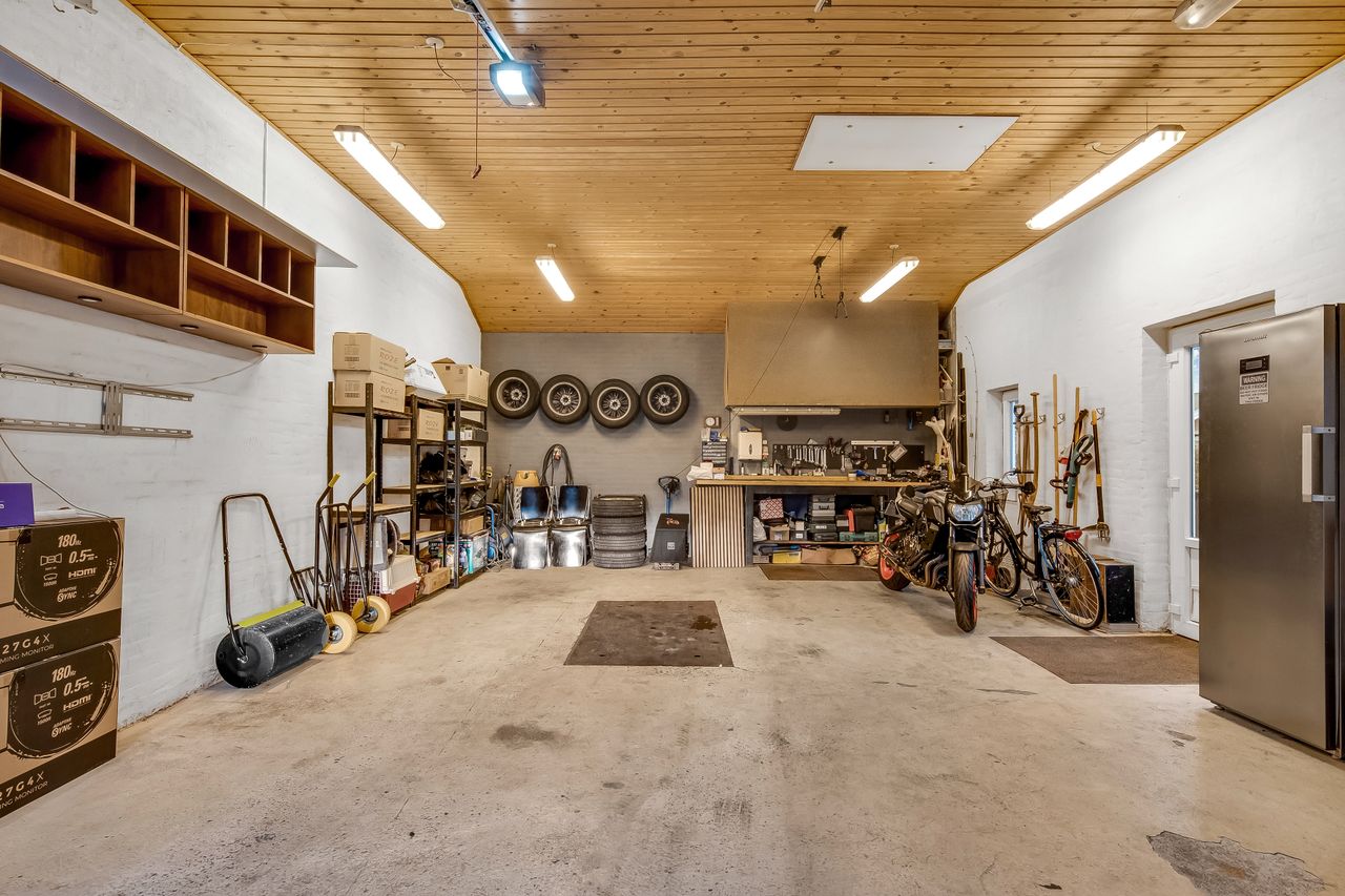 Som en ekstra bonus får du en rummelig, fuldmuret garage på hele 50 m2 med god loftshøjde. Her er der plads til både bil, værksted, opbevaring eller hobbyprojekter – en sjælden og meget brugbar detalje, som mange vil sætte stor pris på.
