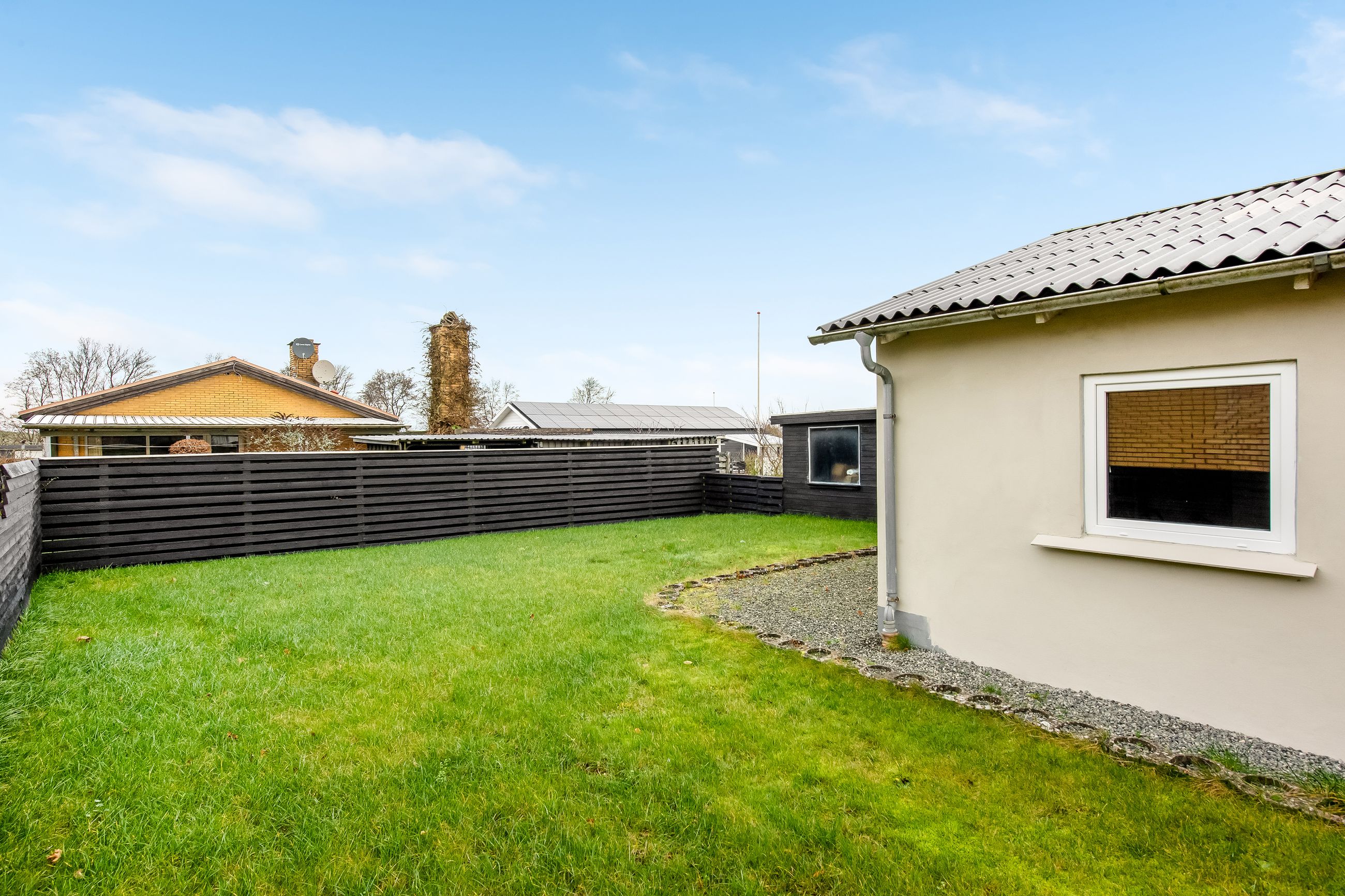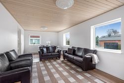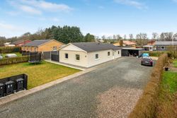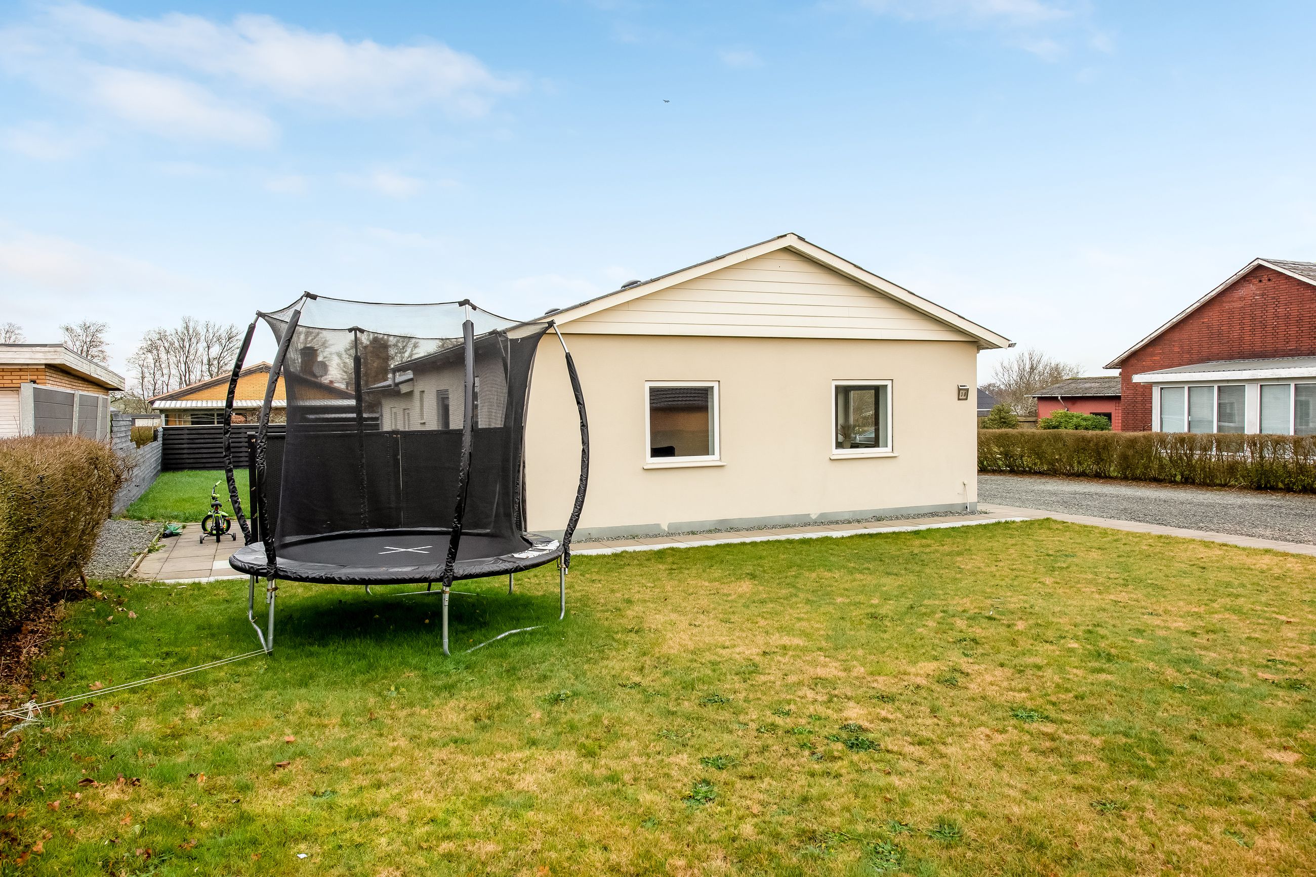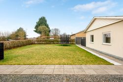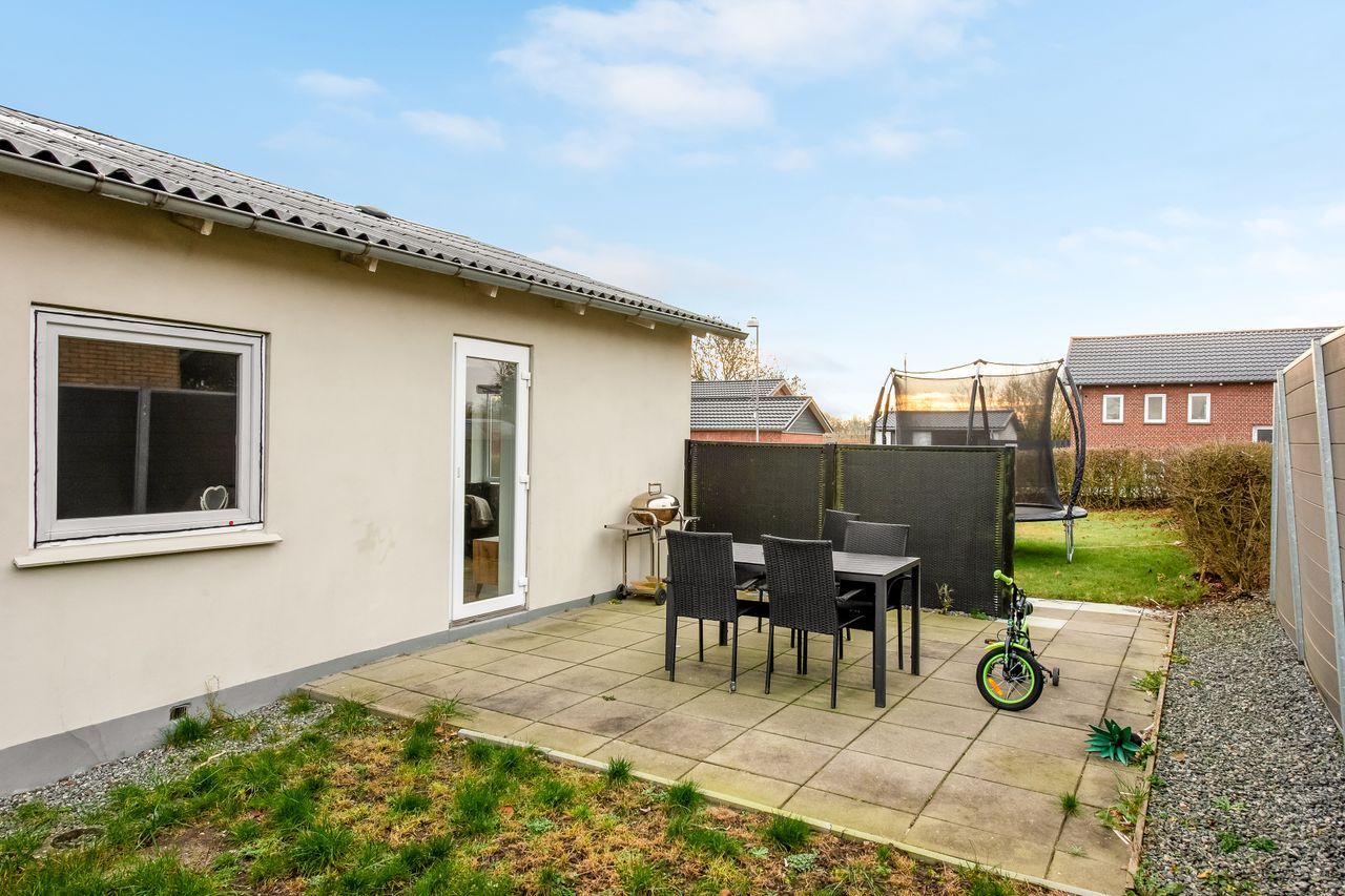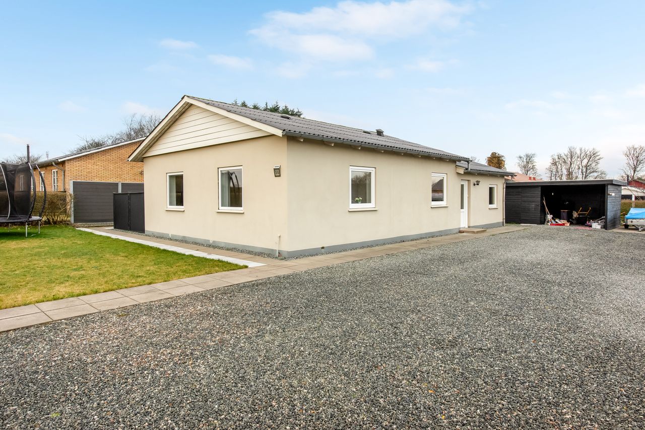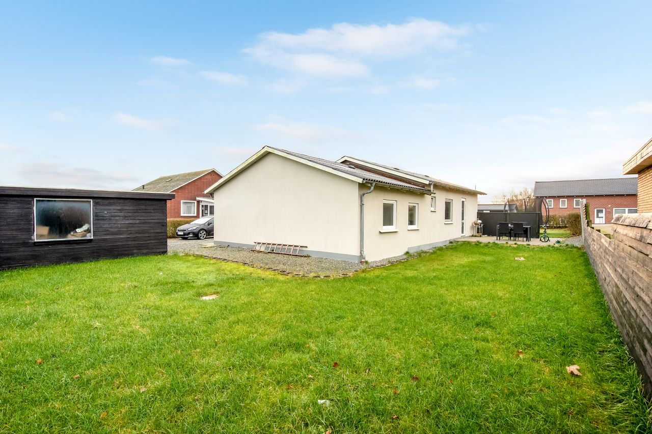 Ejendommen rummer desuden en god garage med tilhørende værksted – ideelt til hobby, opbevaring eller praktiske projekter. Huset fremstår flot med nyere vinduer og et solidt tag, og haven er lukket og primært anlagt med græs, hvilket gør den nem at holde og velegnet til både leg, afslapning og udeliv.