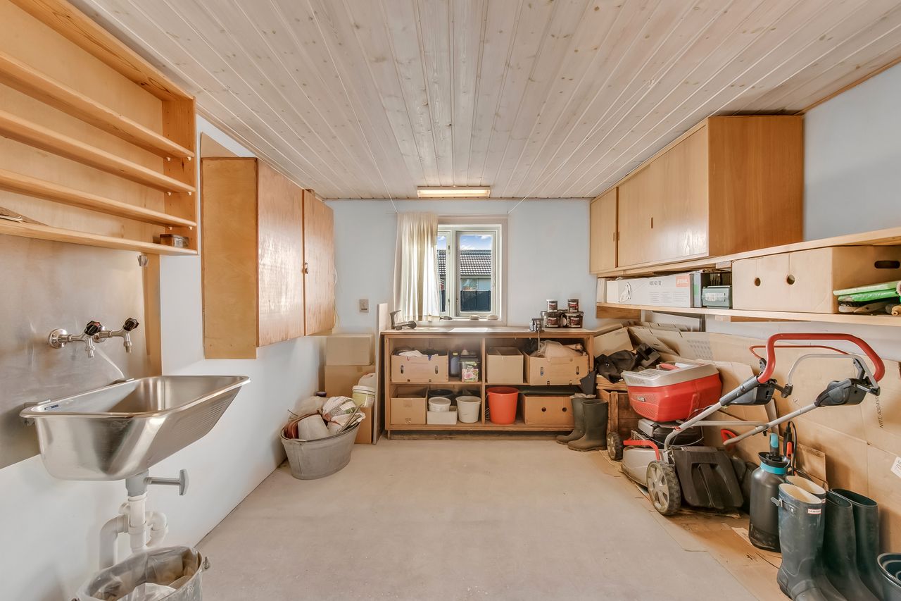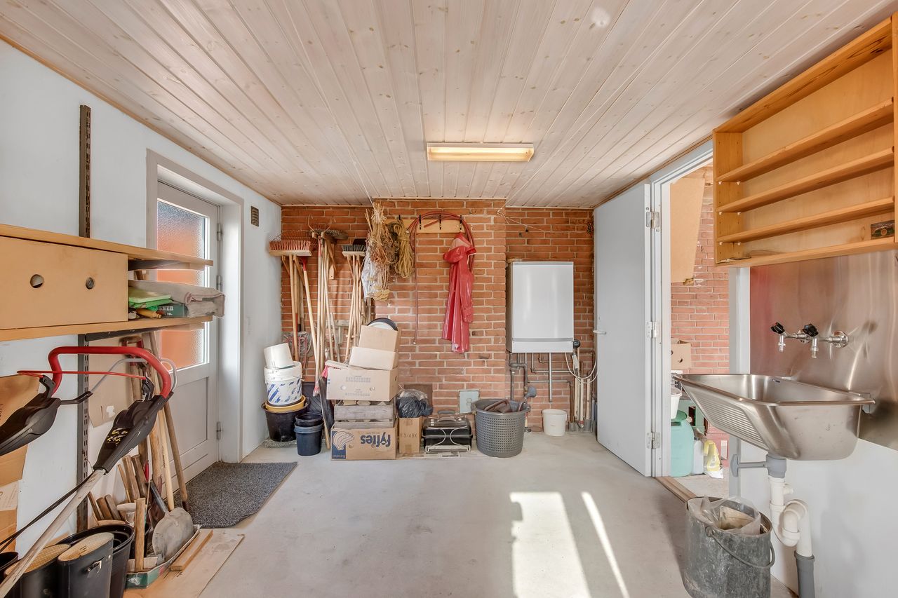 Ydermere er der en dobbelt garage og værksted, der også kan anvendes som ekstra opbevaringsplads eller til hobbyaktiviteter. Det giver mulighed for alsidig brug og tilpasning efter behov.