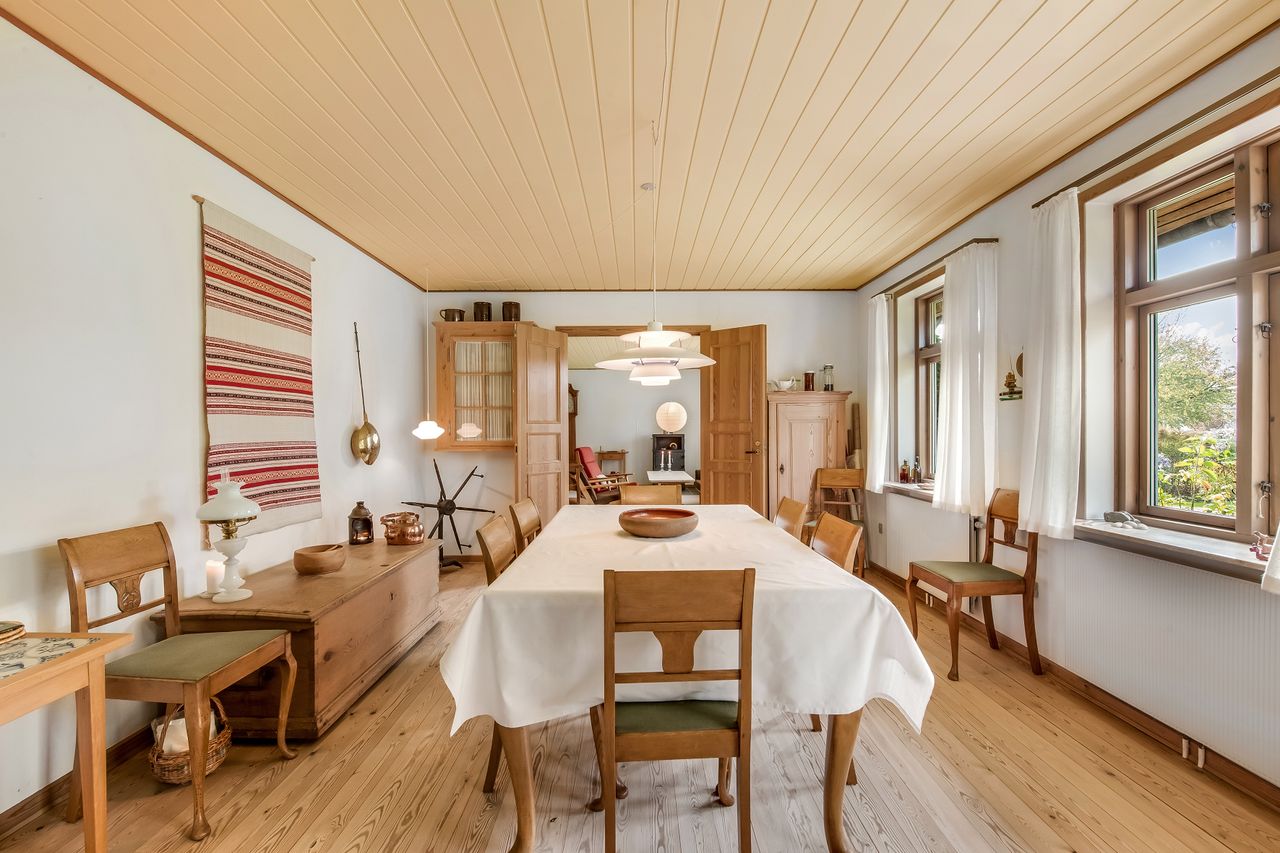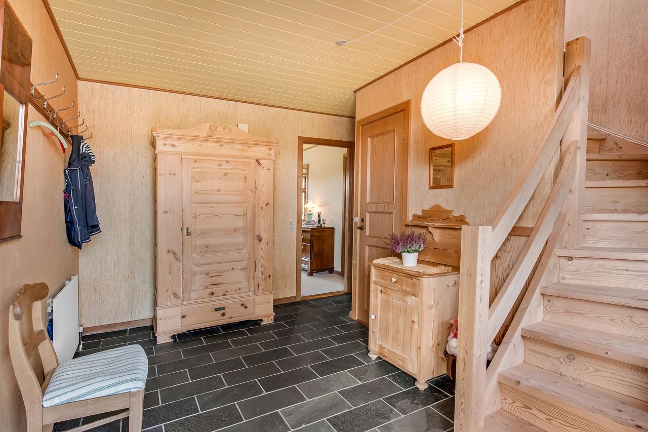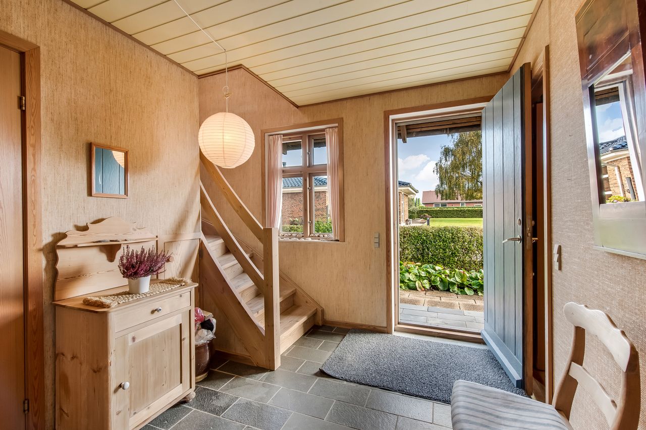 Hjemmet har en gennemtænkt planløsning med gode opholdsrum og store værelser. Du træder ind i en stor entre, hvor trappen går op til førstesalen. Her er 5 store værelser og badeværelse med bruseniche og badekar. Stueplan rummer et værelse, kontor, stue og spisestue, hvorfra der er direkte udgang til terrassen. Rummeligt spisekøkken med viktualierum, gæstetoilet og bryggers.