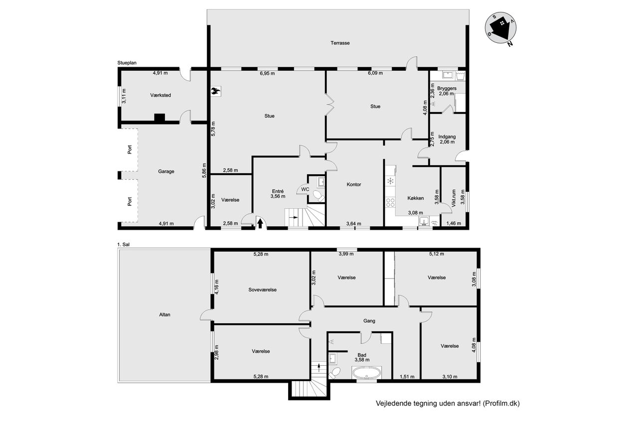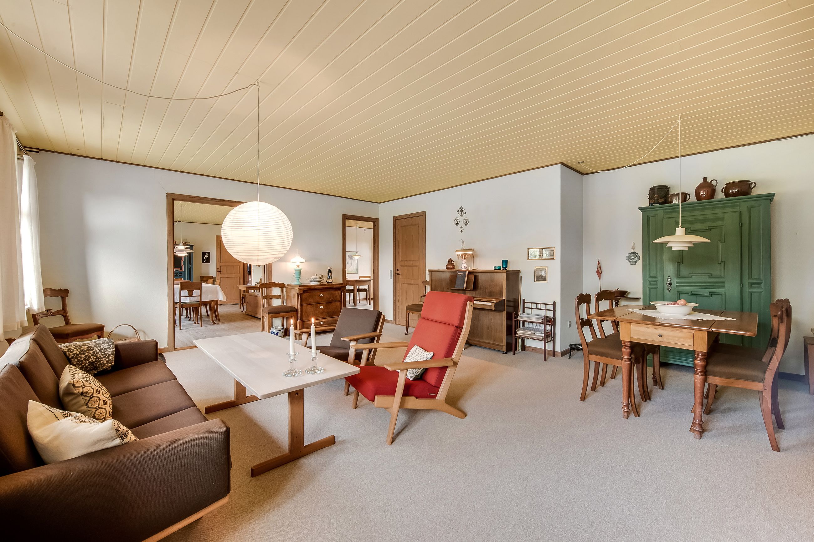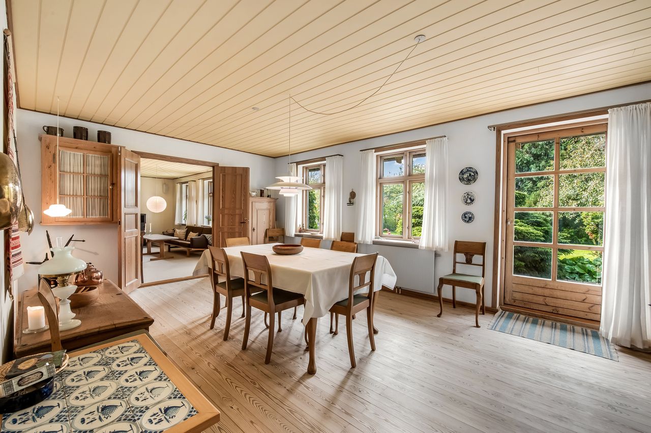 Hjemmet har en gennemtænkt planløsning med gode opholdsrum og store værelser. Du træder ind i en stor entre, hvor trappen går op til førstesalen. Her er 5 store værelser og badeværelse med bruseniche og badekar. Stueplan rummer et værelse, kontor, stue og spisestue, hvorfra der er direkte udgang til terrassen. Rummeligt spisekøkken med viktualierum, gæstetoilet og bryggers.