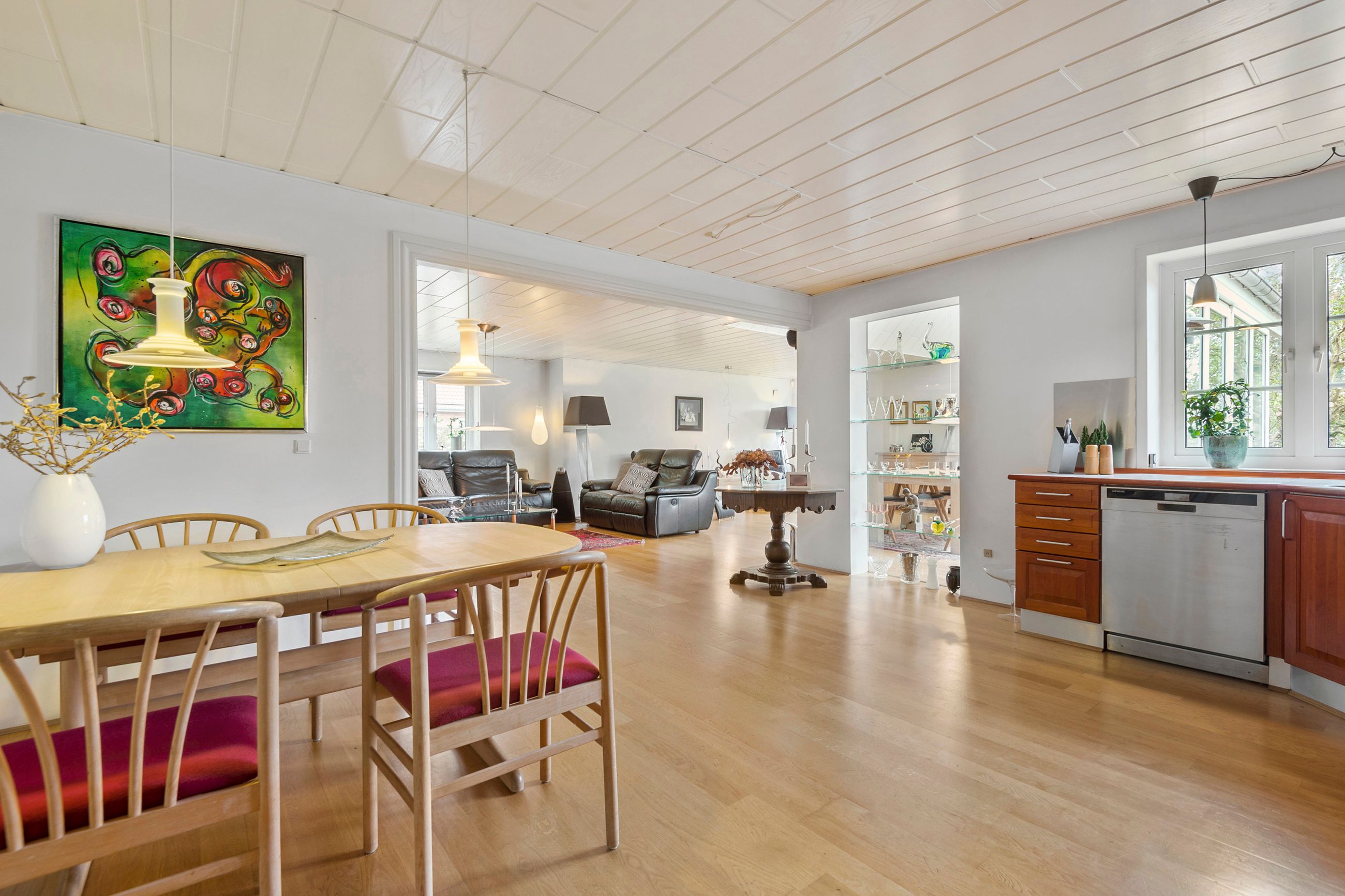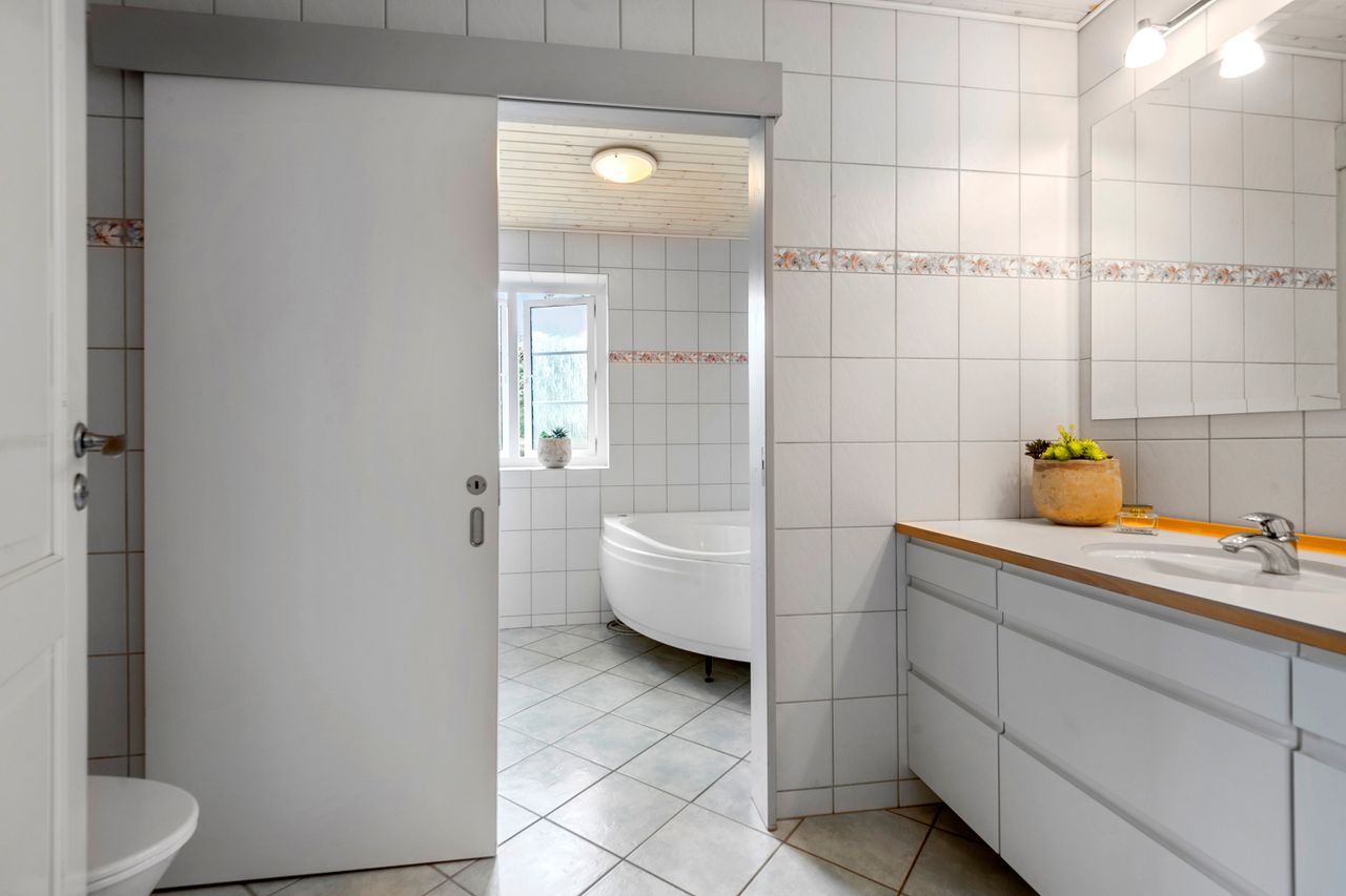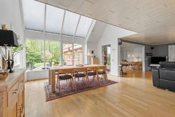 eller gæsteværelser. Husets hjerte er det store og åbne køkken/alrum og stue, hvor lys, luft og god plads