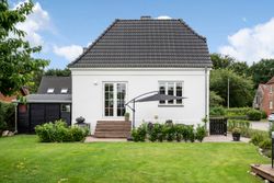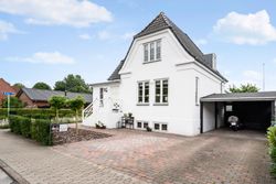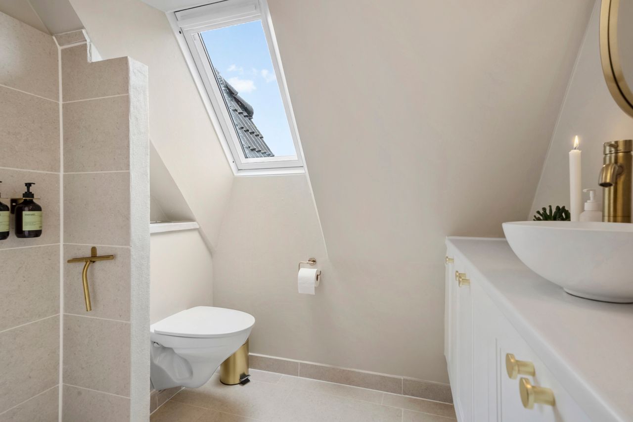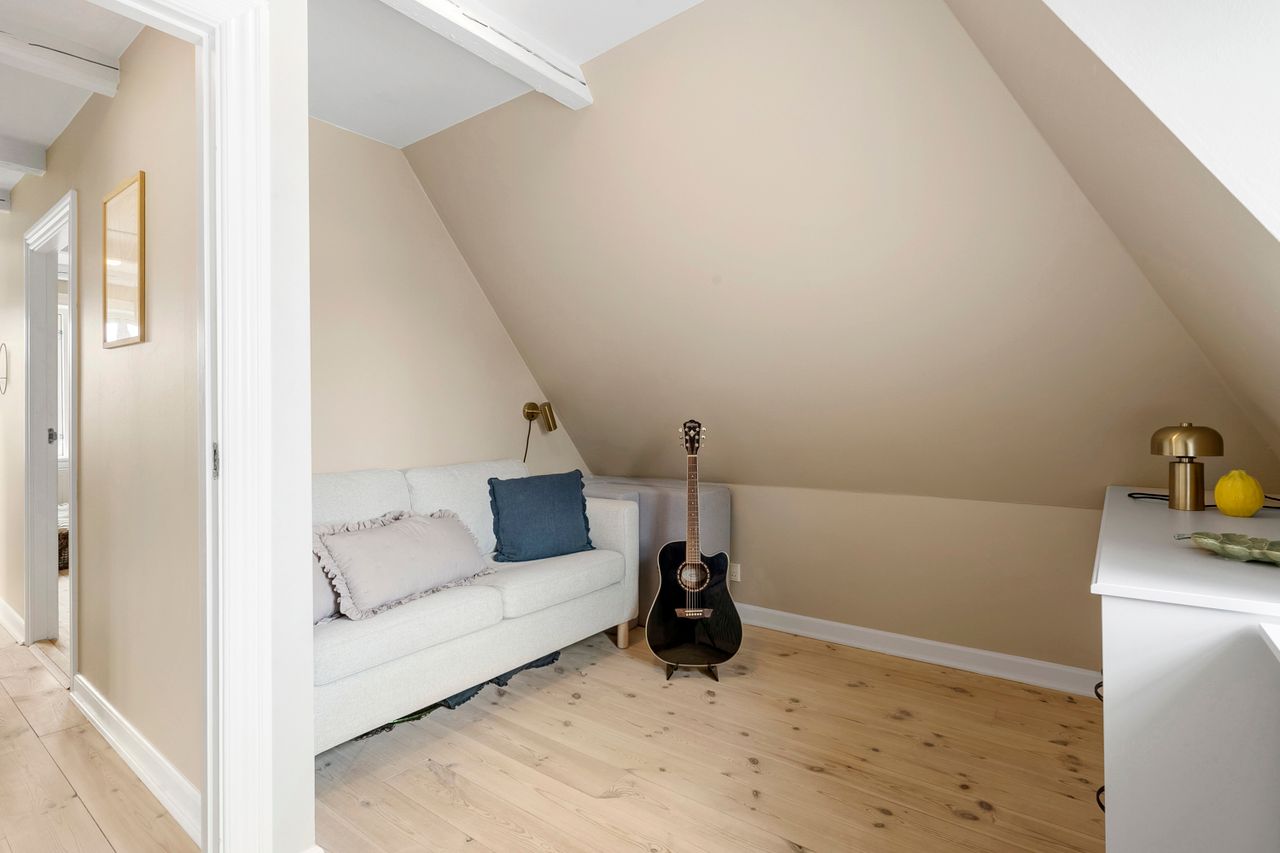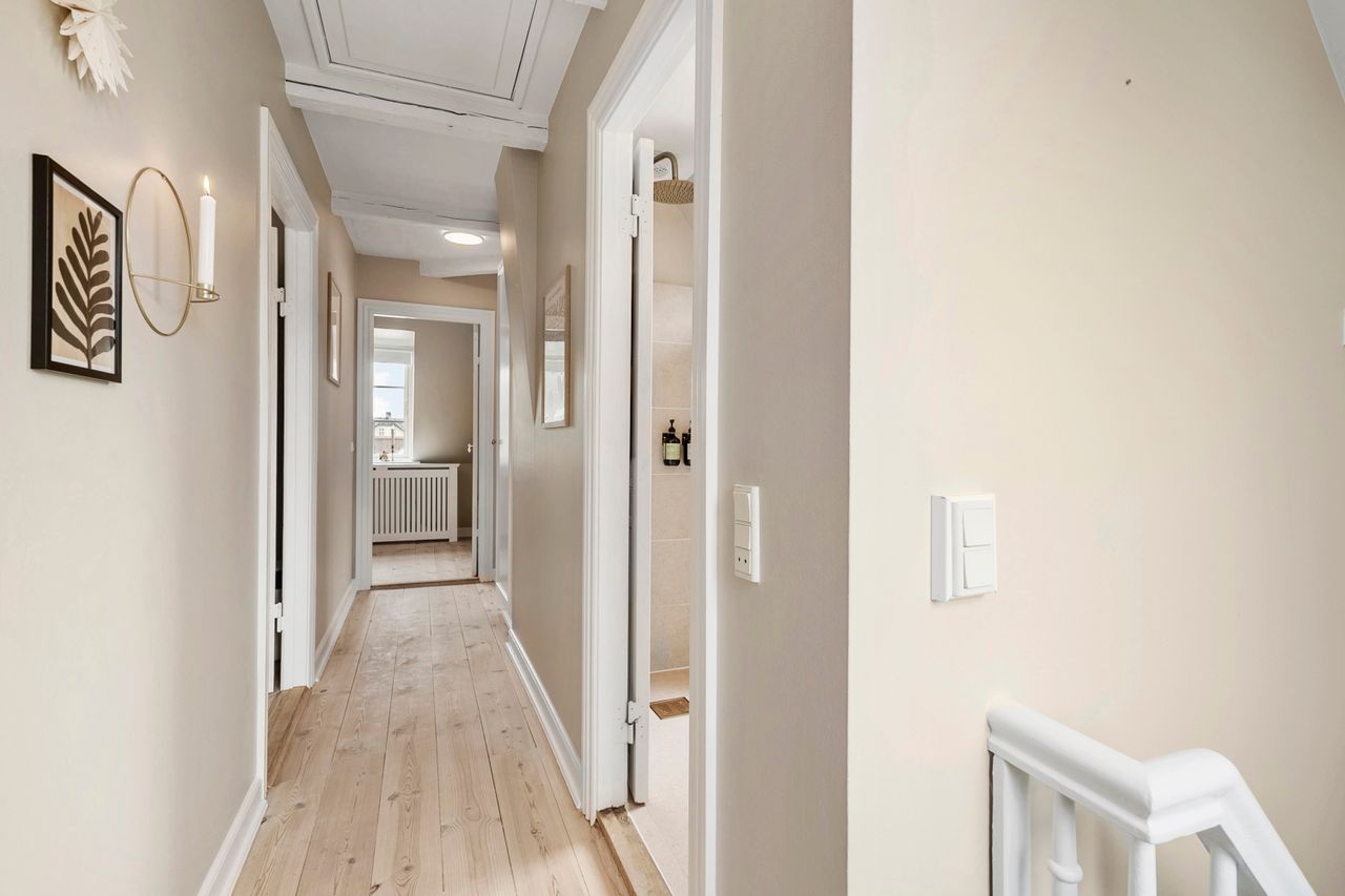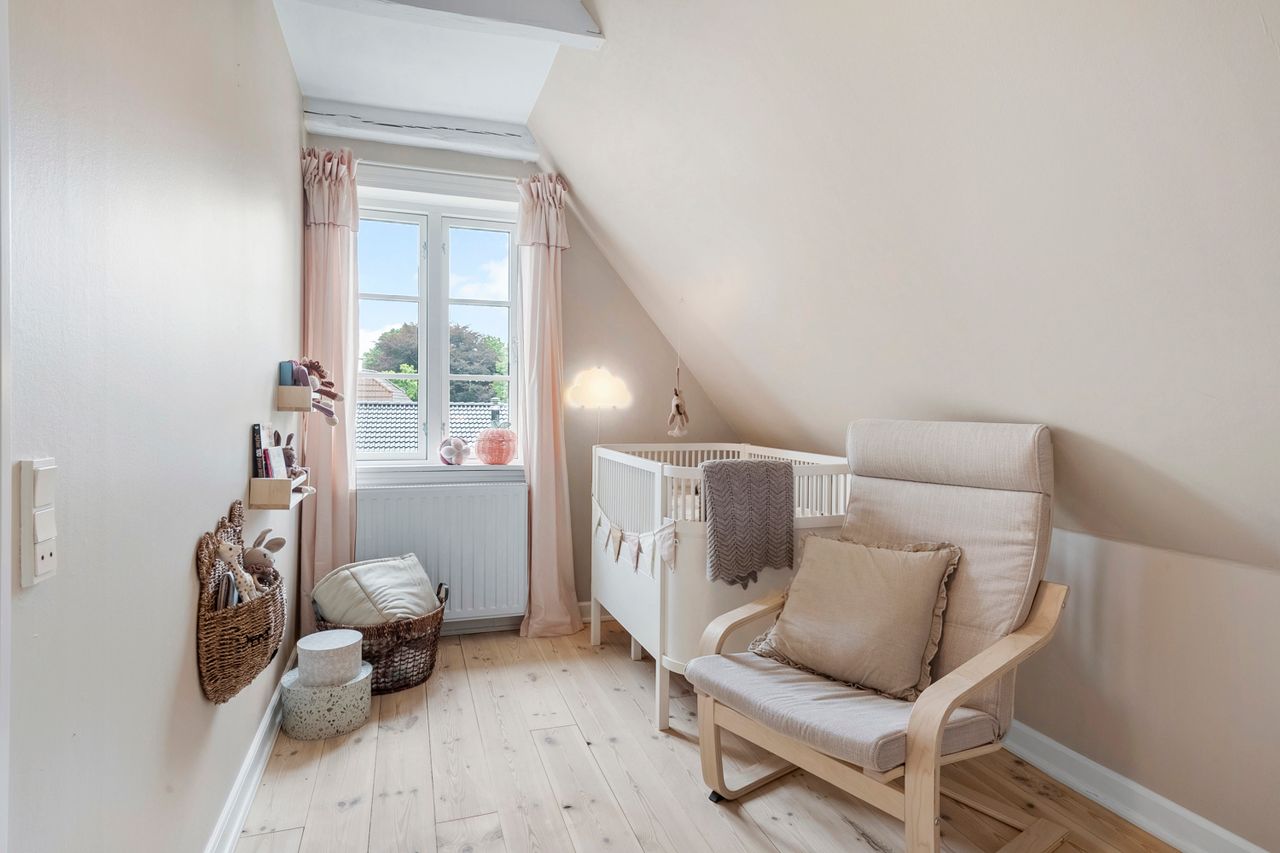 På første sal finder du tre store værelser, herunder to oplagte børneværelser og et lyst soveværelse. Et elegant og moderne badeværelse fuldender etagen og sikrer en velfungerende hverdag for familien.