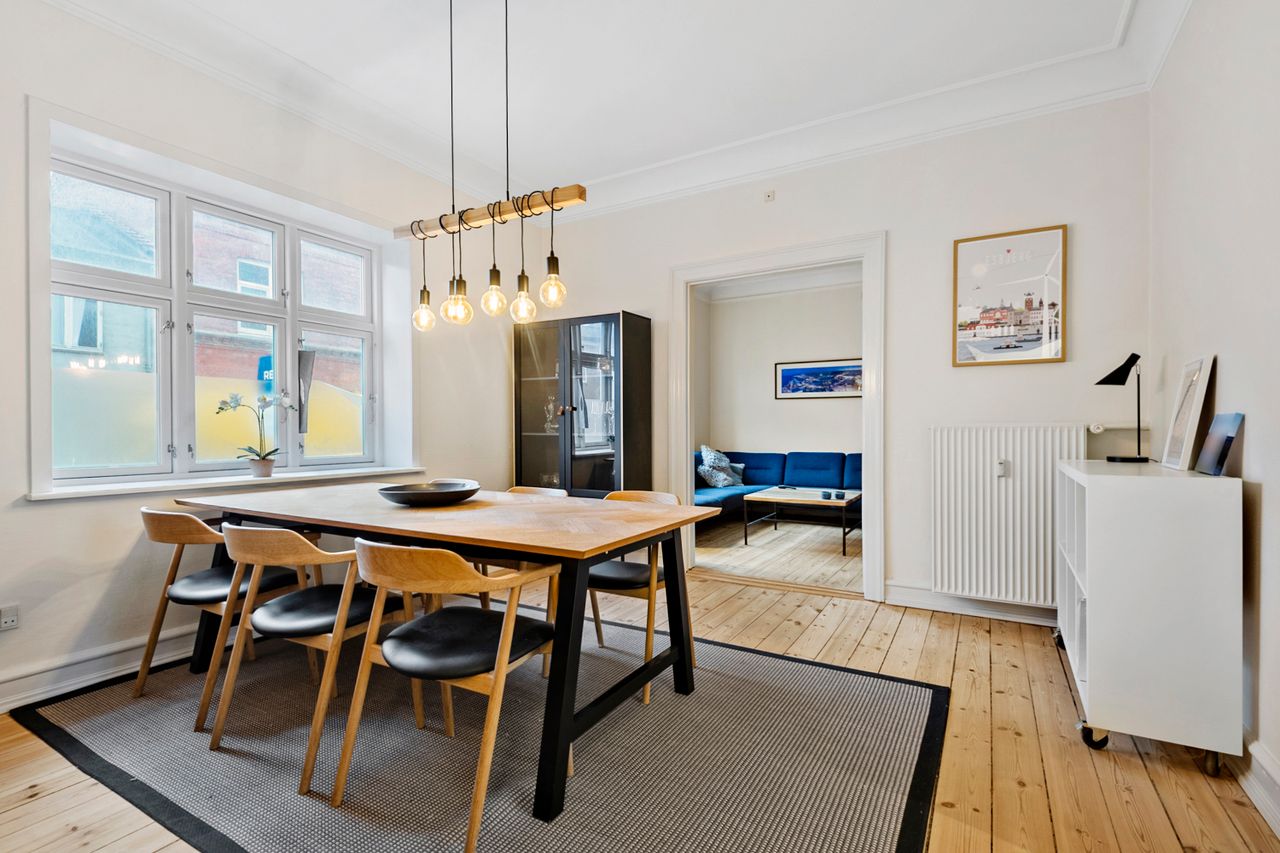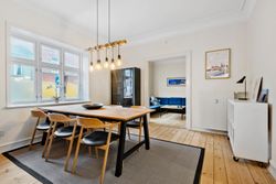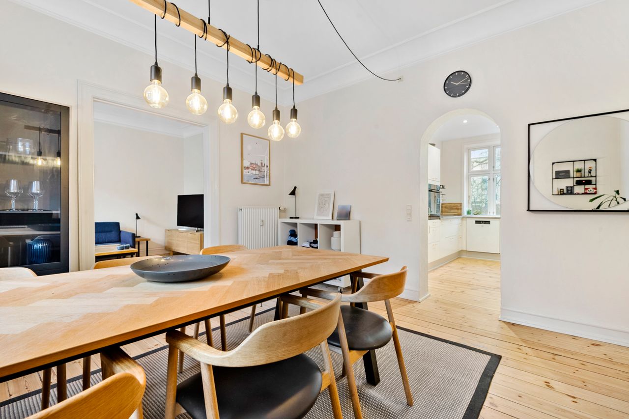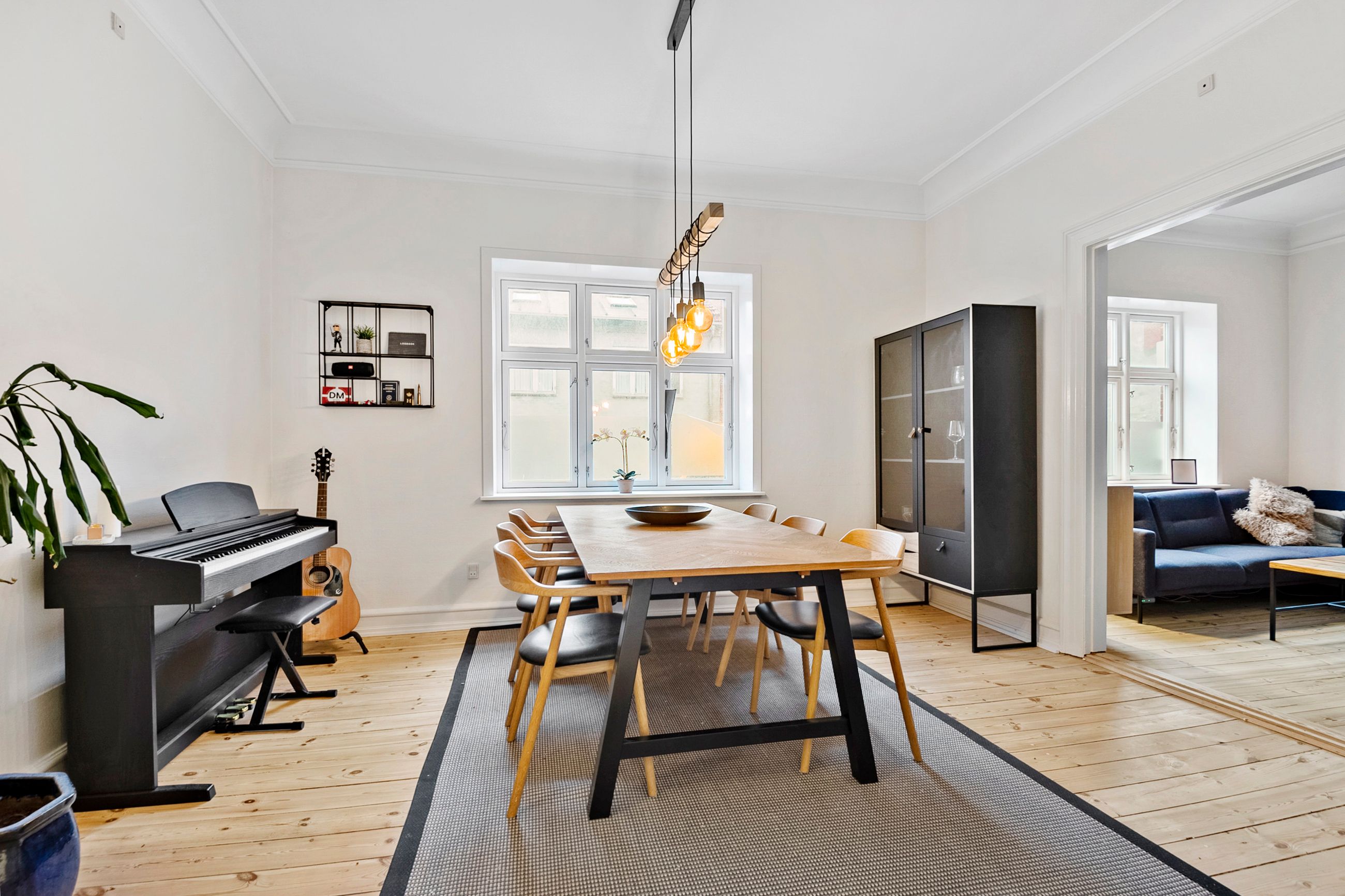 Lejligheden byder på en god entré med plads til overtøj og sko. Badeværelset fremstår lyst og indbydende. Boligens hjerte er den store spisestue med flotte trægulve og højt til loftet, som skaber en fantastisk rumfornemmelse og en elegant atmosfære.