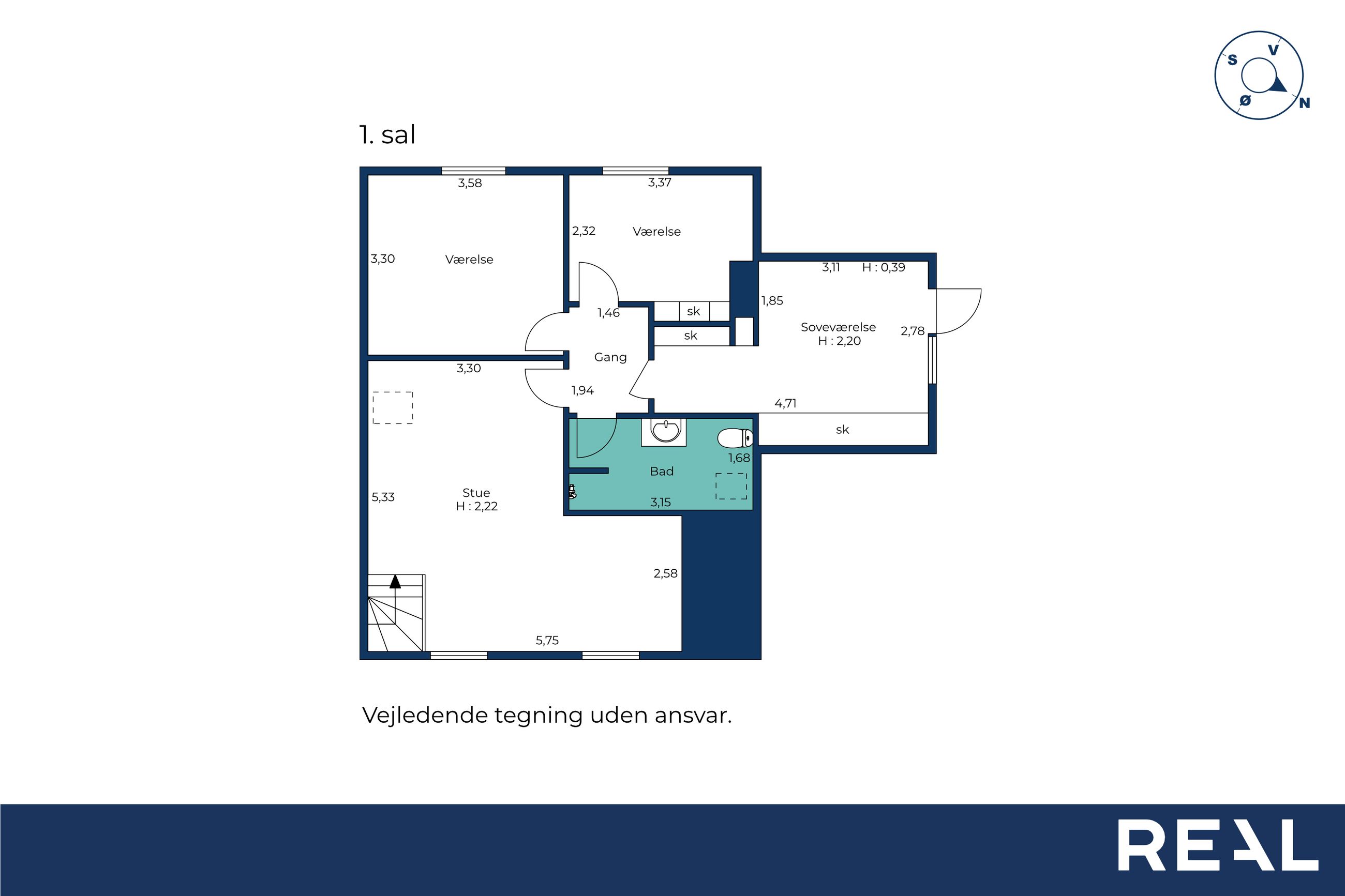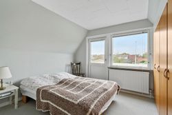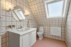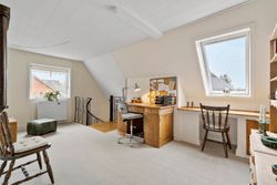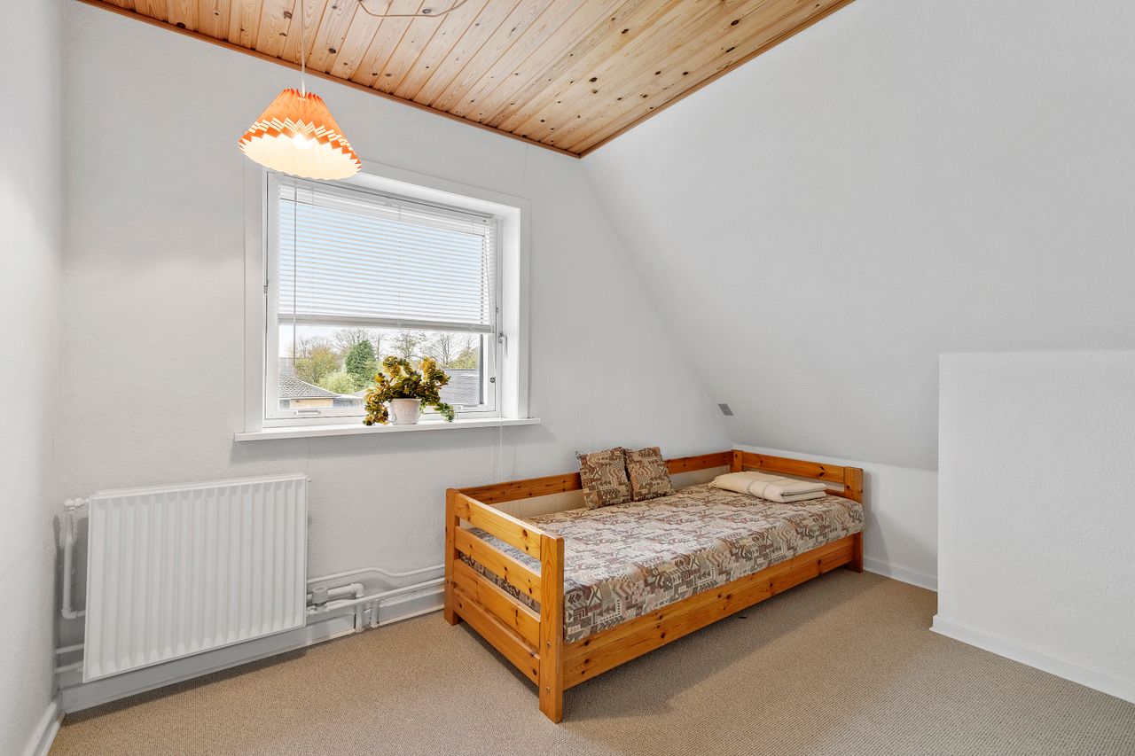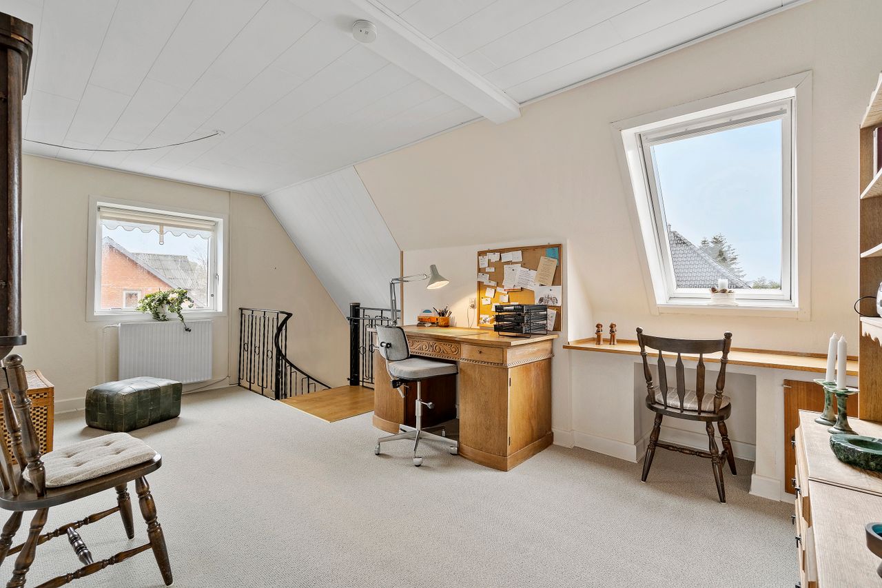 På 1. sal ligger værelsesafdelingen med tre gode soveværelser og endnu et badeværelse. Her er desuden mulighed for nemt at etablere et ekstra værelse, hvis familien vokser eller behovet for et kontor opstår.