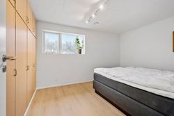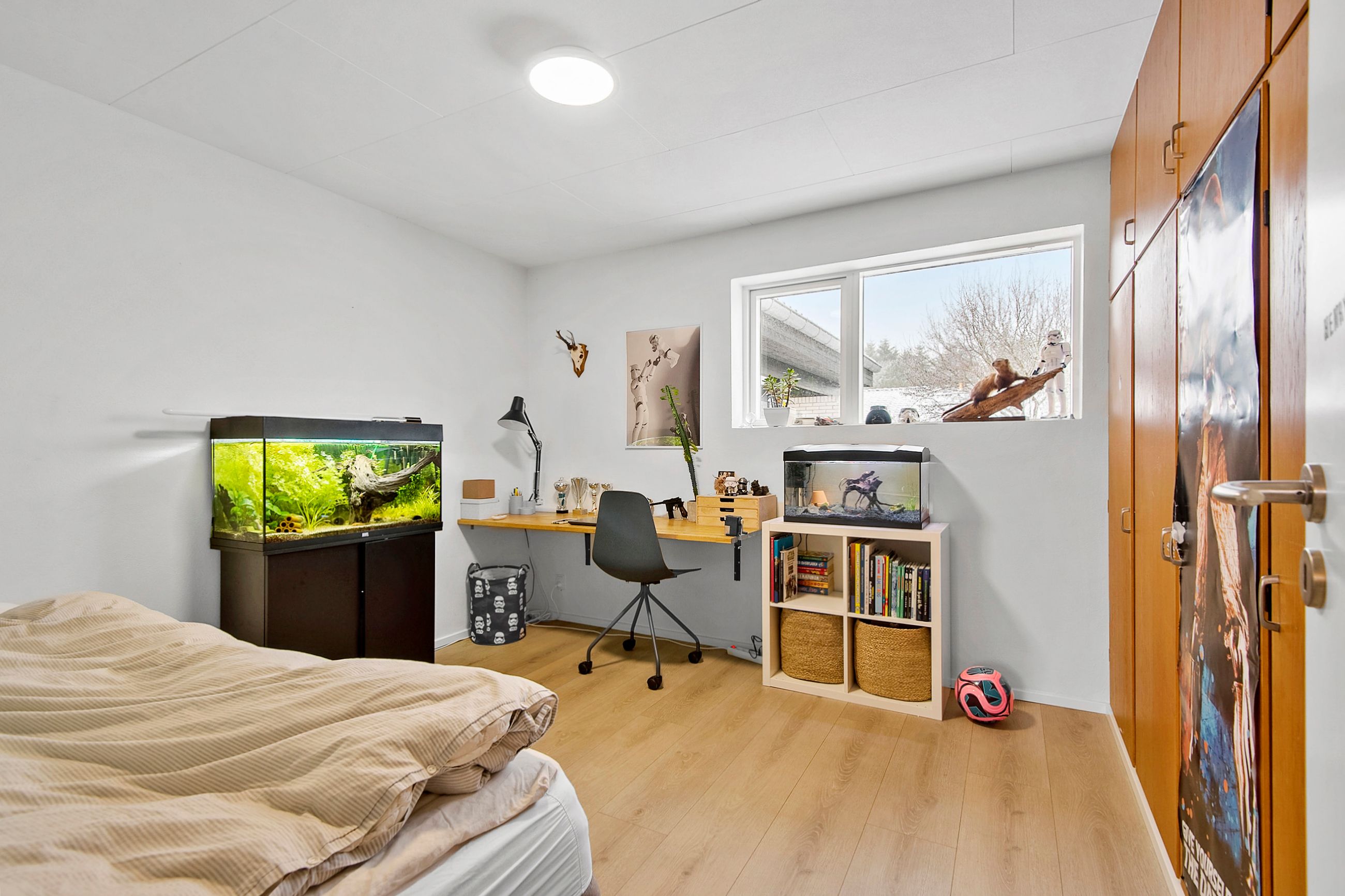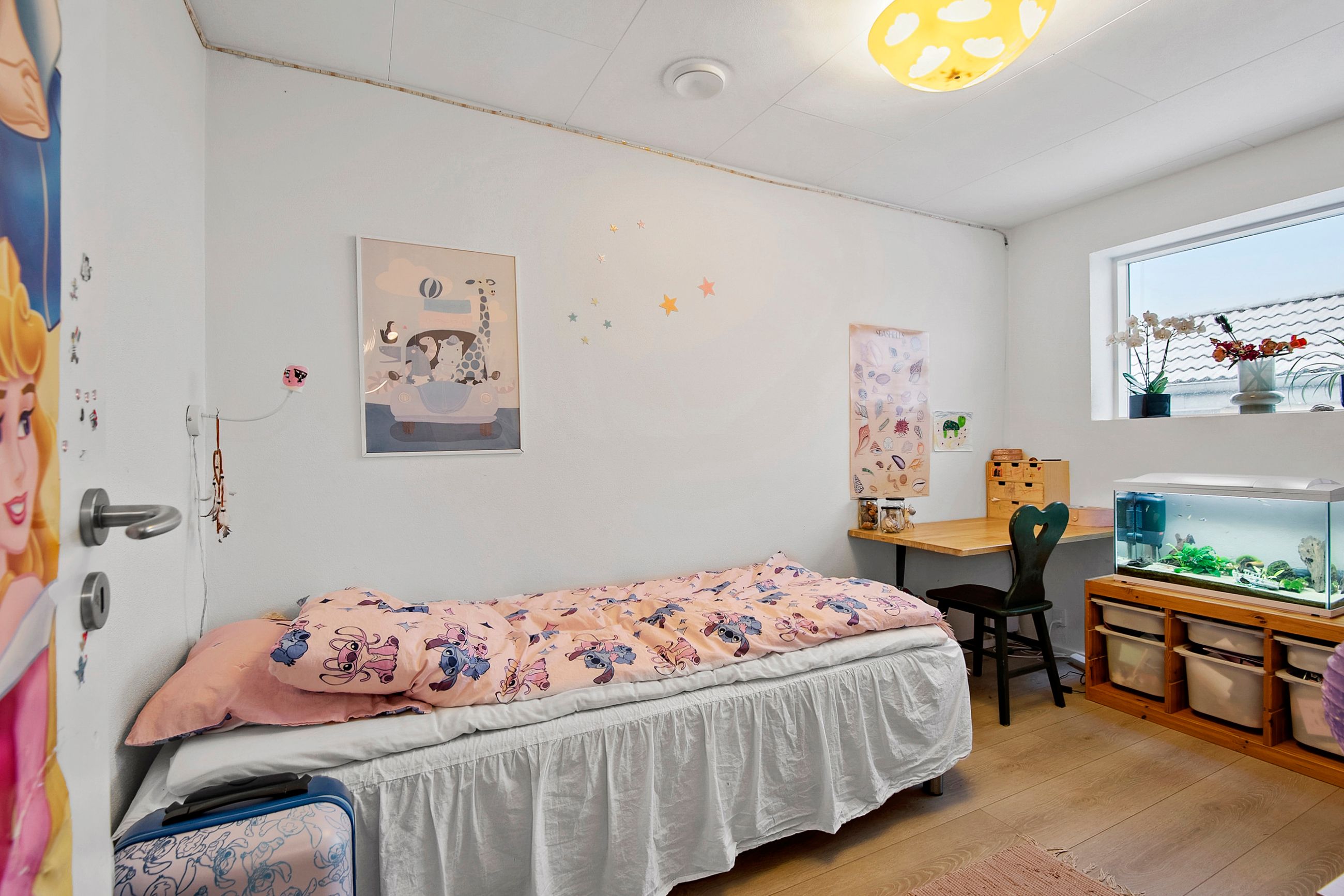 Boligen byder velkommen i en stor og indbydende entré, som leder videre til en separat værelsesafdeling med tre gode børneværelser samt soveværelse. Her findes også et moderne og rummeligt badeværelse, udført i tidssvarende materialer.