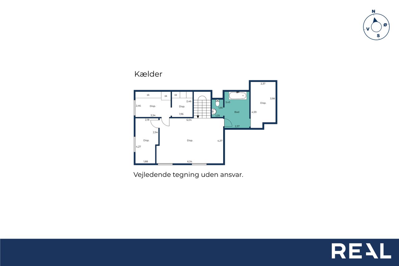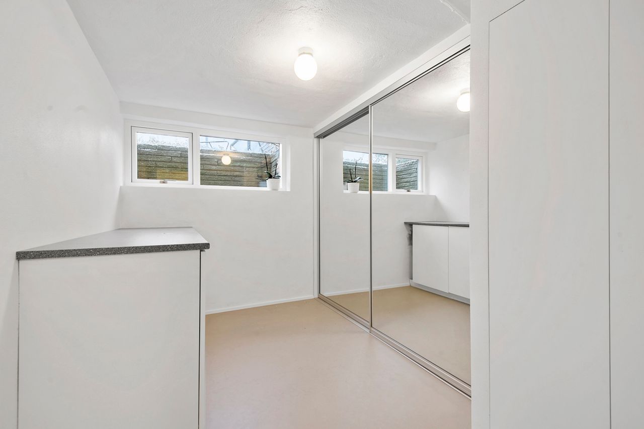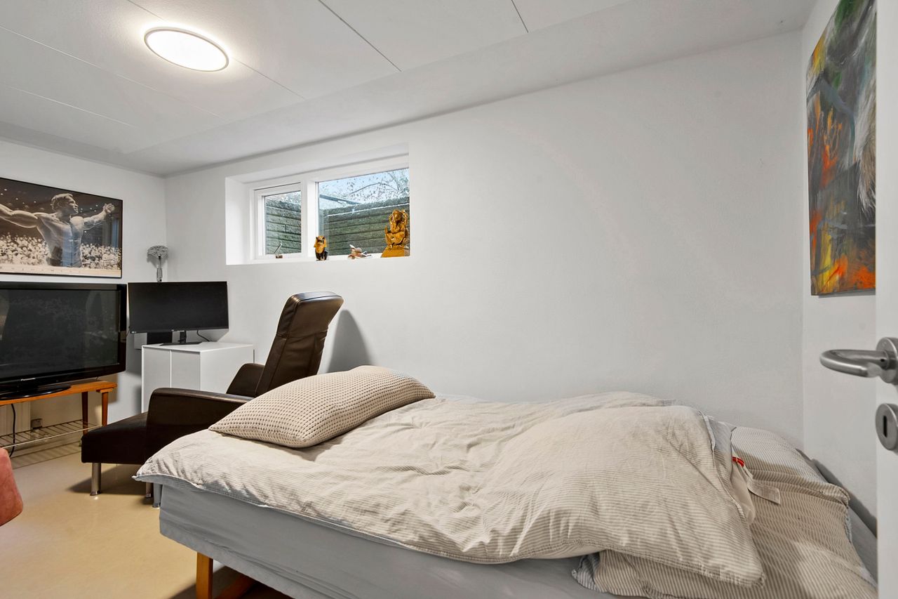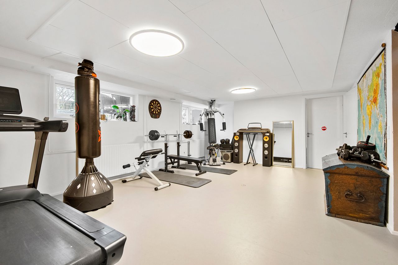 Kælderen er højloftet og yderst anvendelig og rummer i dag træningsrum, badeværelse, vaskefaciliteter samt et disponibelt rum, der oplagt kan anvendes som teenageafdeling, hobbyrum eller hjemmekontor.