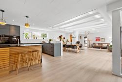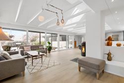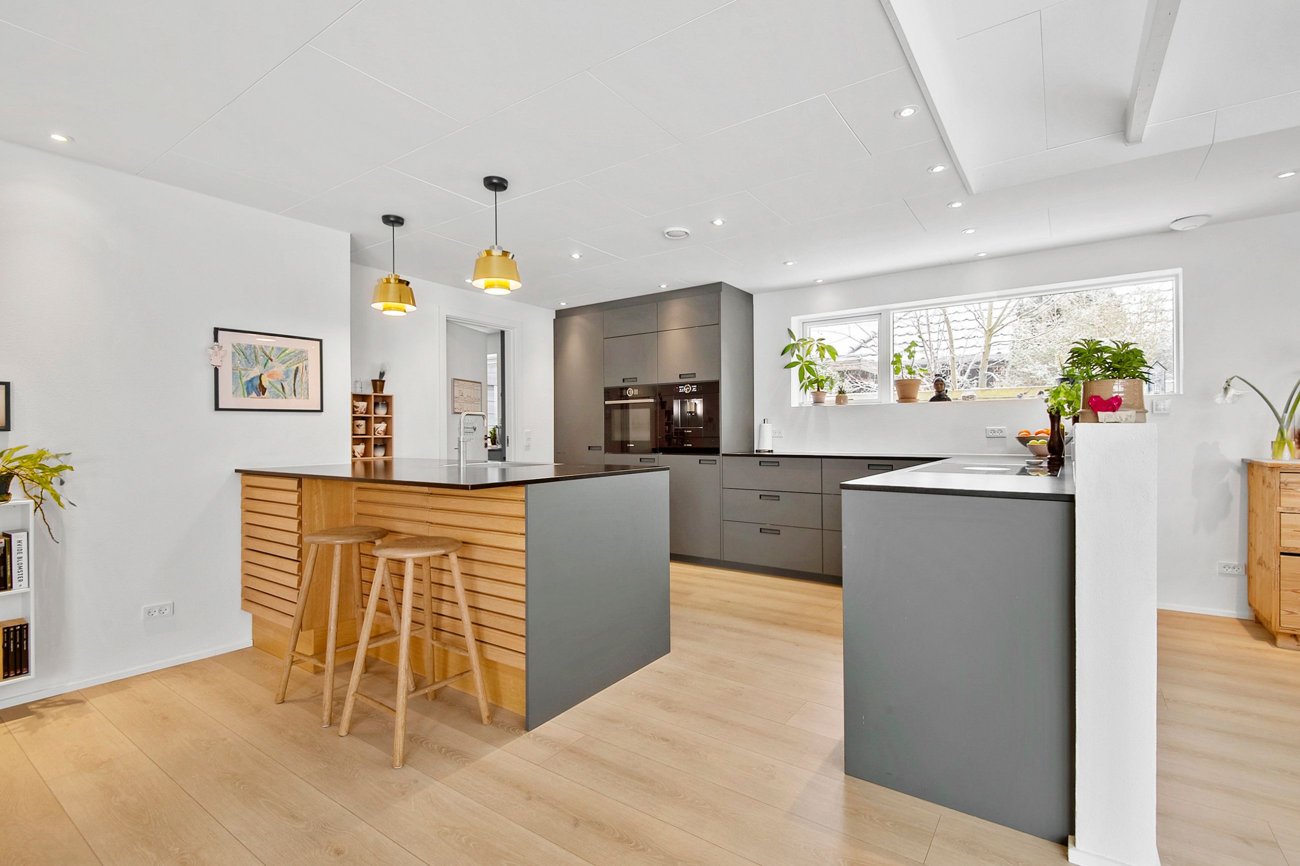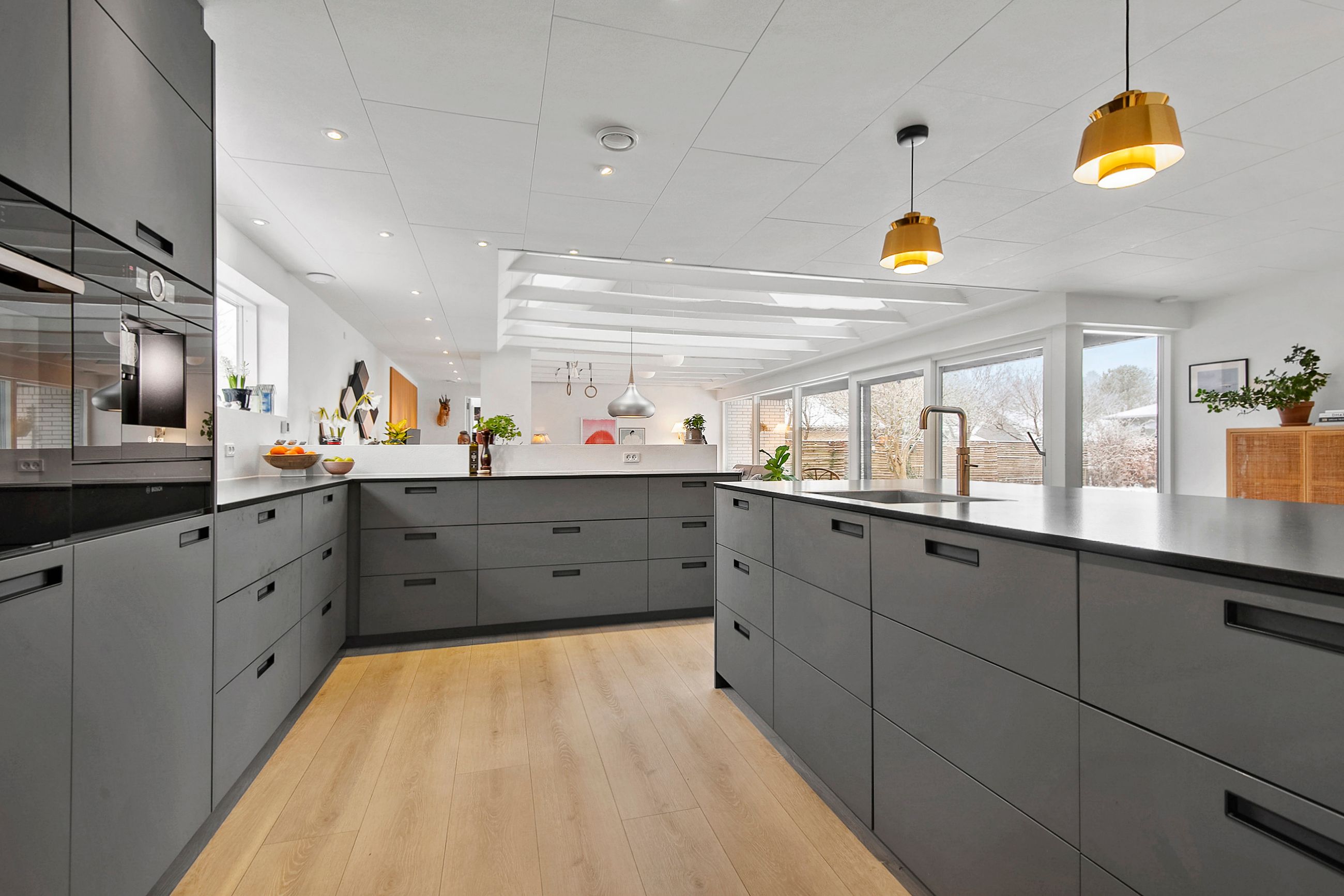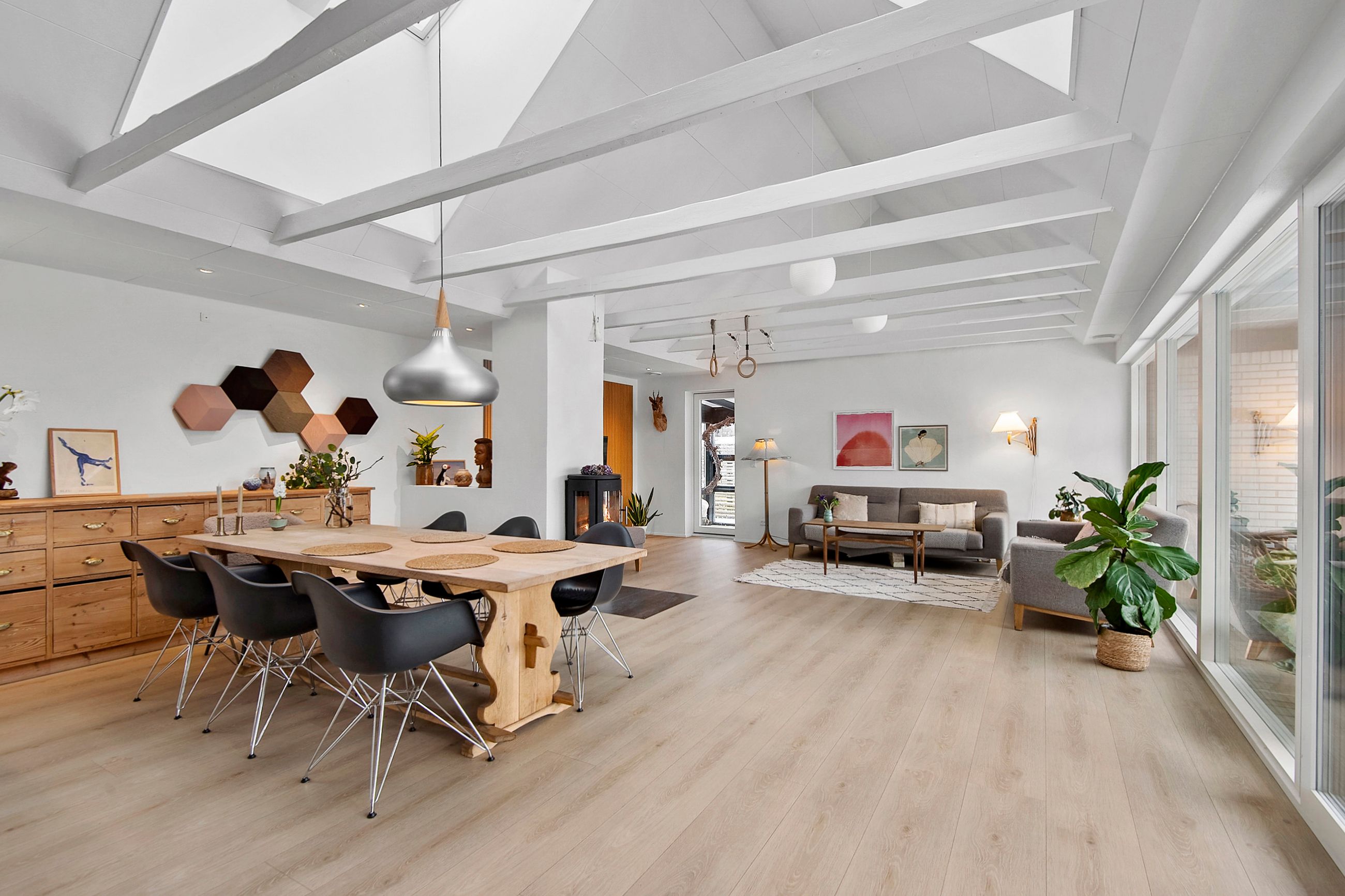 Husets naturlige samlingspunkt er det imponerende køkken-alrum, som er elegant forbundet med både spiseplads og stue. Her er der gulvvarme, et fantastisk lysindfald fra Velux-vinduerne og et stort vinduesparti mod haven, som giver et skønt kig til grønne omgivelser og masser af dagslys.