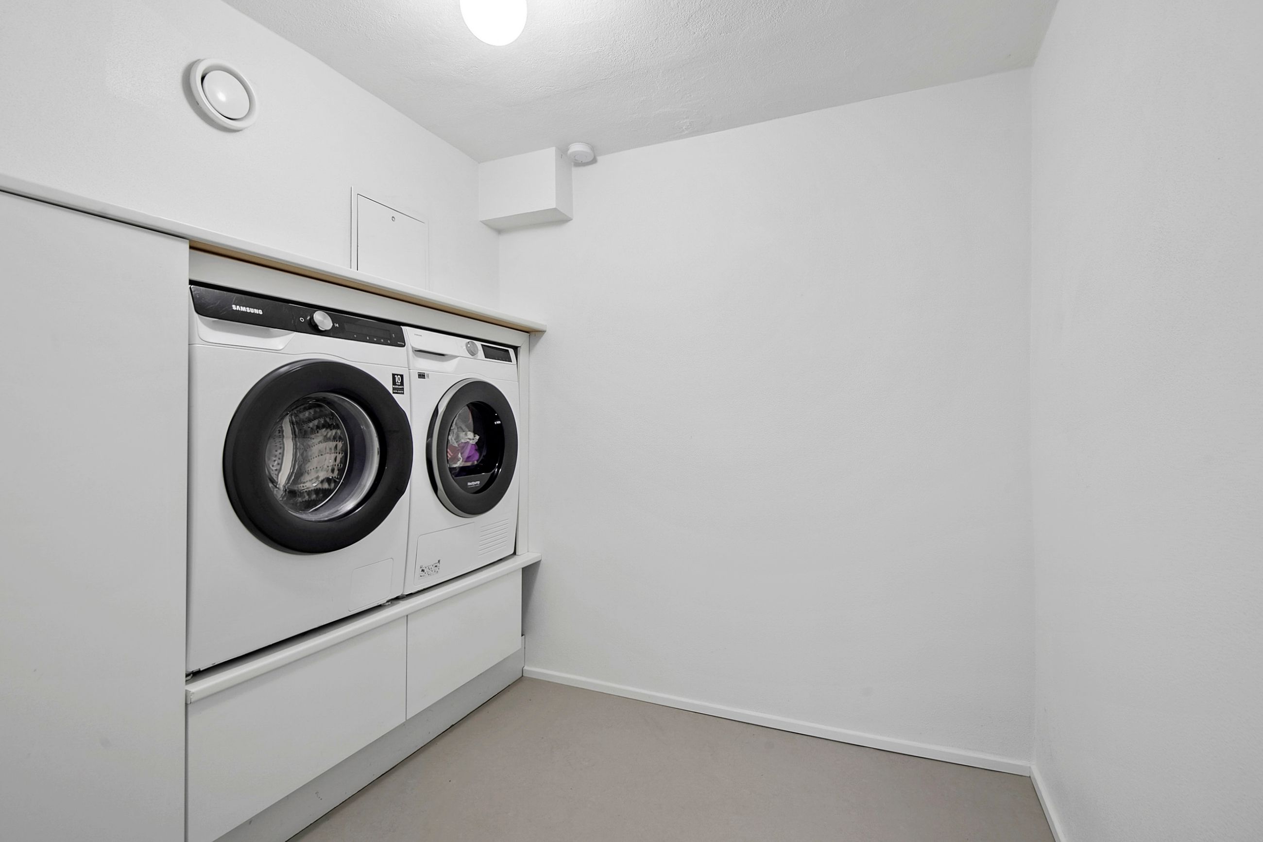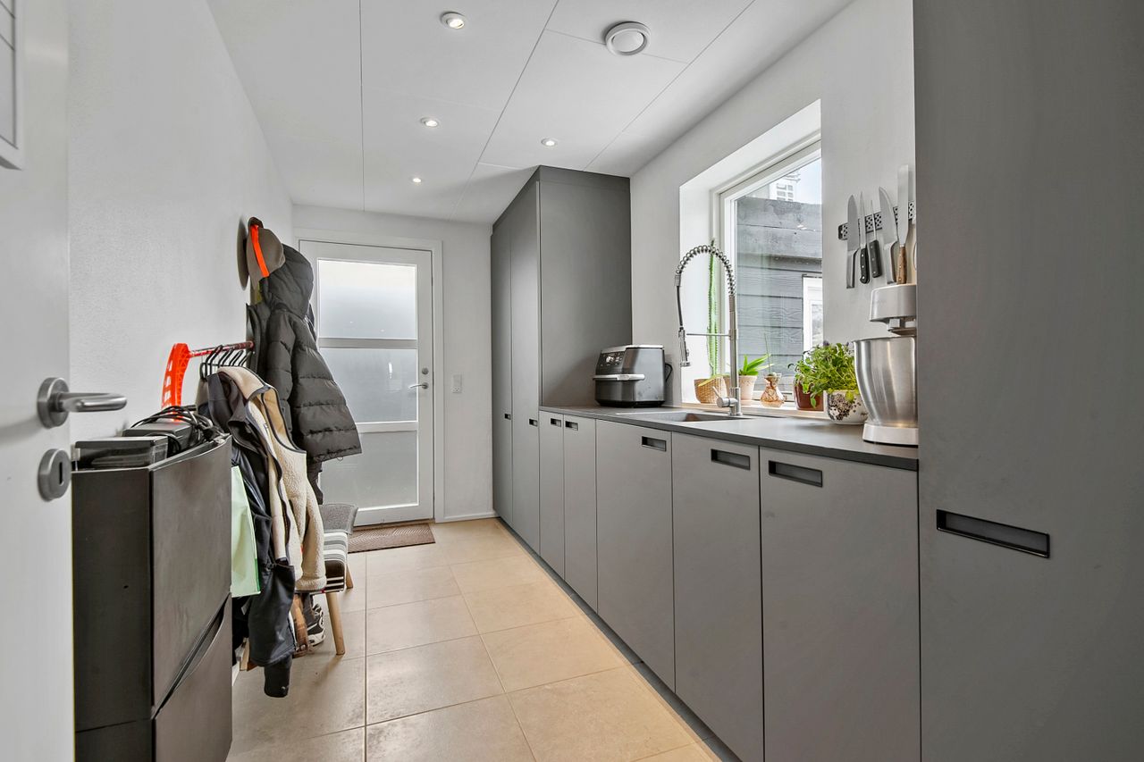 Det rummelige bryggers er yderst funktionelt med god opbevaringsplads og fine arbejdsforhold – perfekt til familiens hverdag.