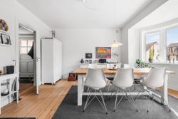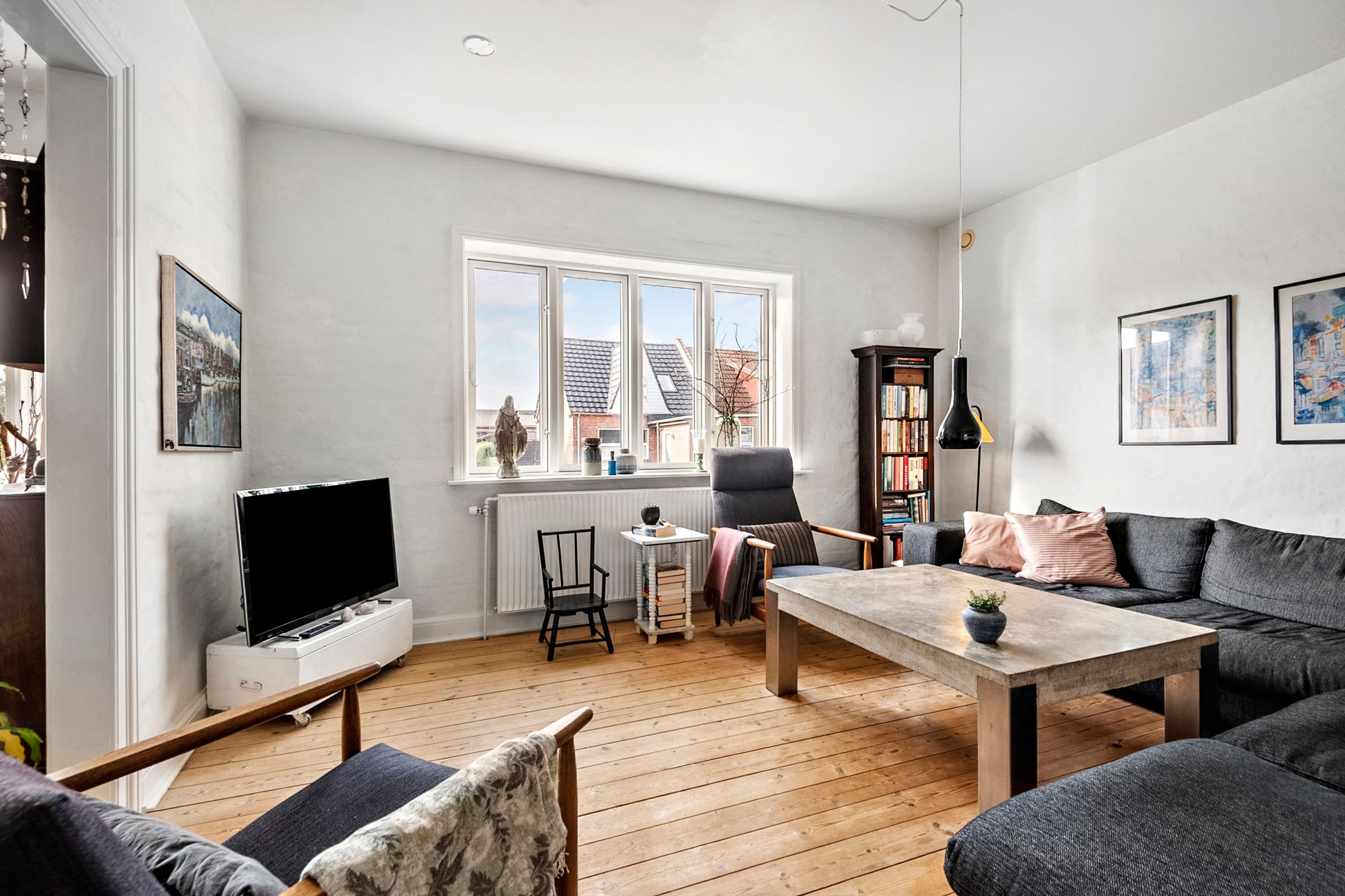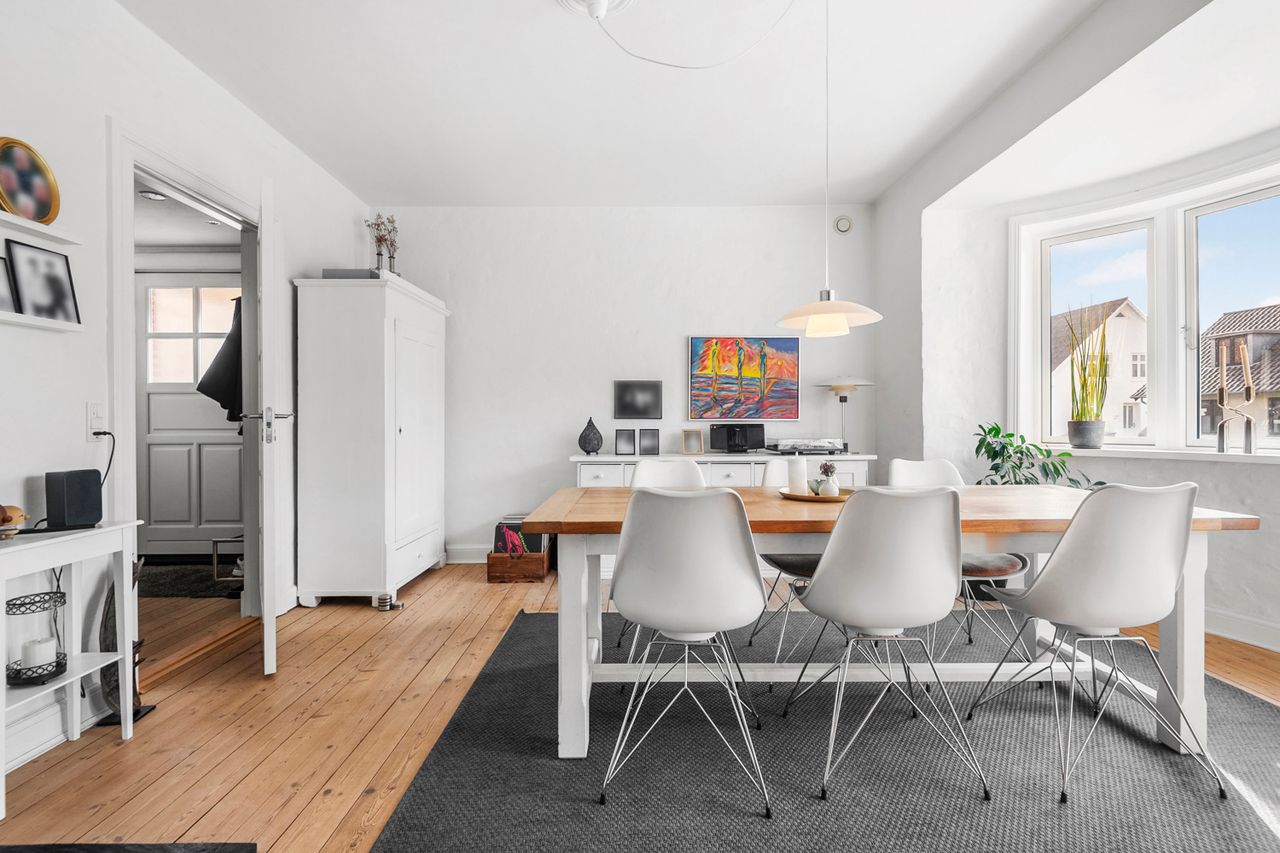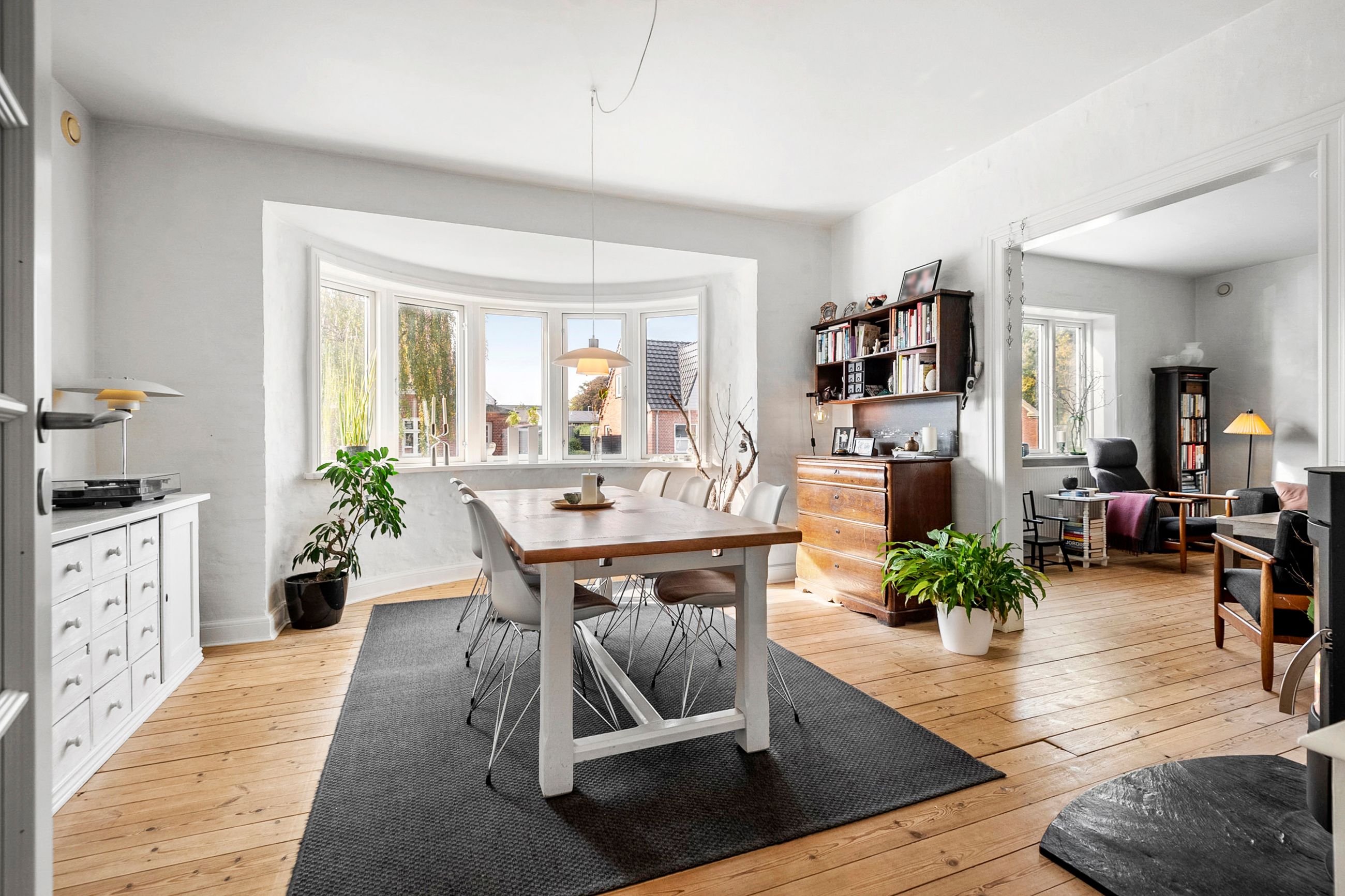 Indenfor bliver du mødt af en indbydende entré, der leder videre til et lyst og rummeligt køkken med spiseplads og udgang til terrassen. Fra entréen er der også adgang til et stort, lækkert badeværelse samt en spisestue med højt til loftet og smukke, originale trægulve. Spisestuen er i åben forbindelse med den hyggelige stue, hvilket skaber et naturligt og luftigt opholdsrum med plads til hele familien.