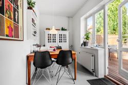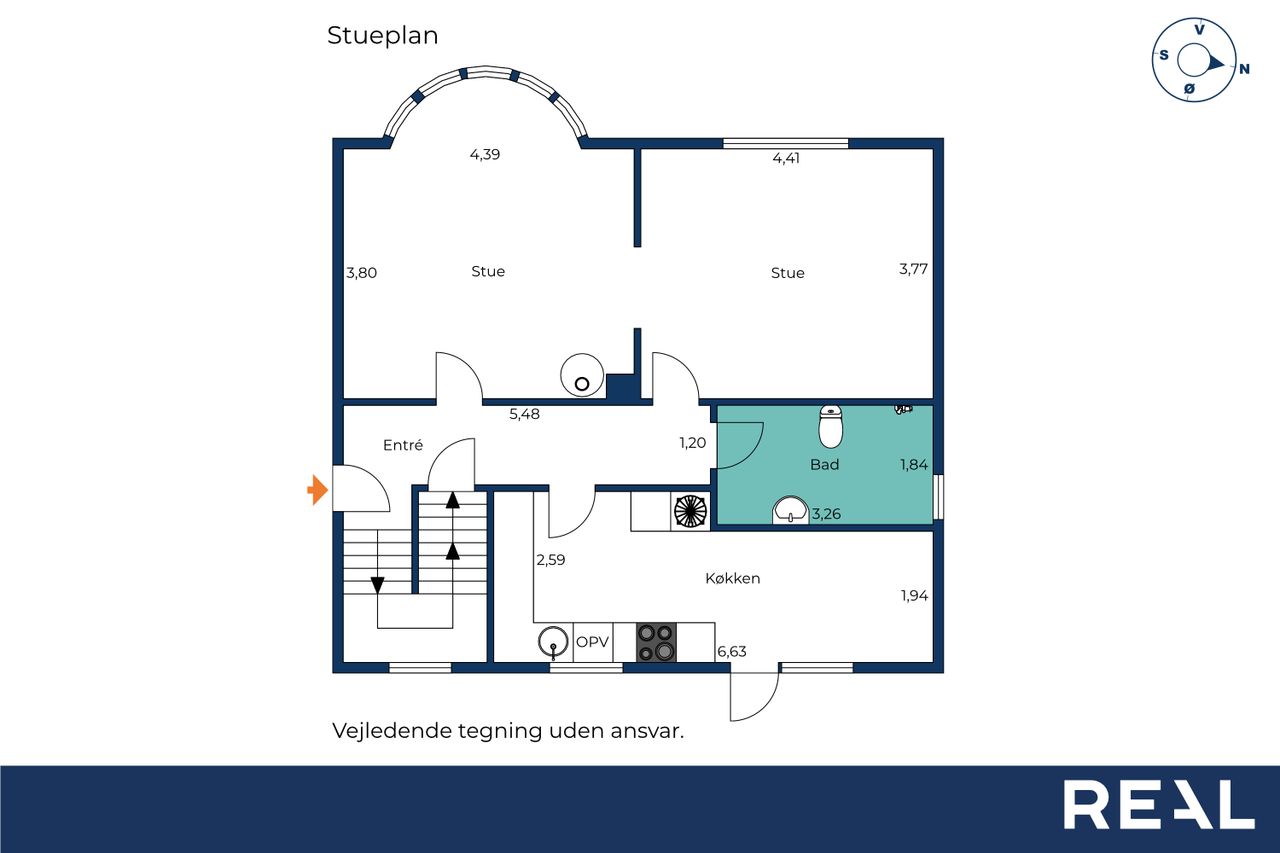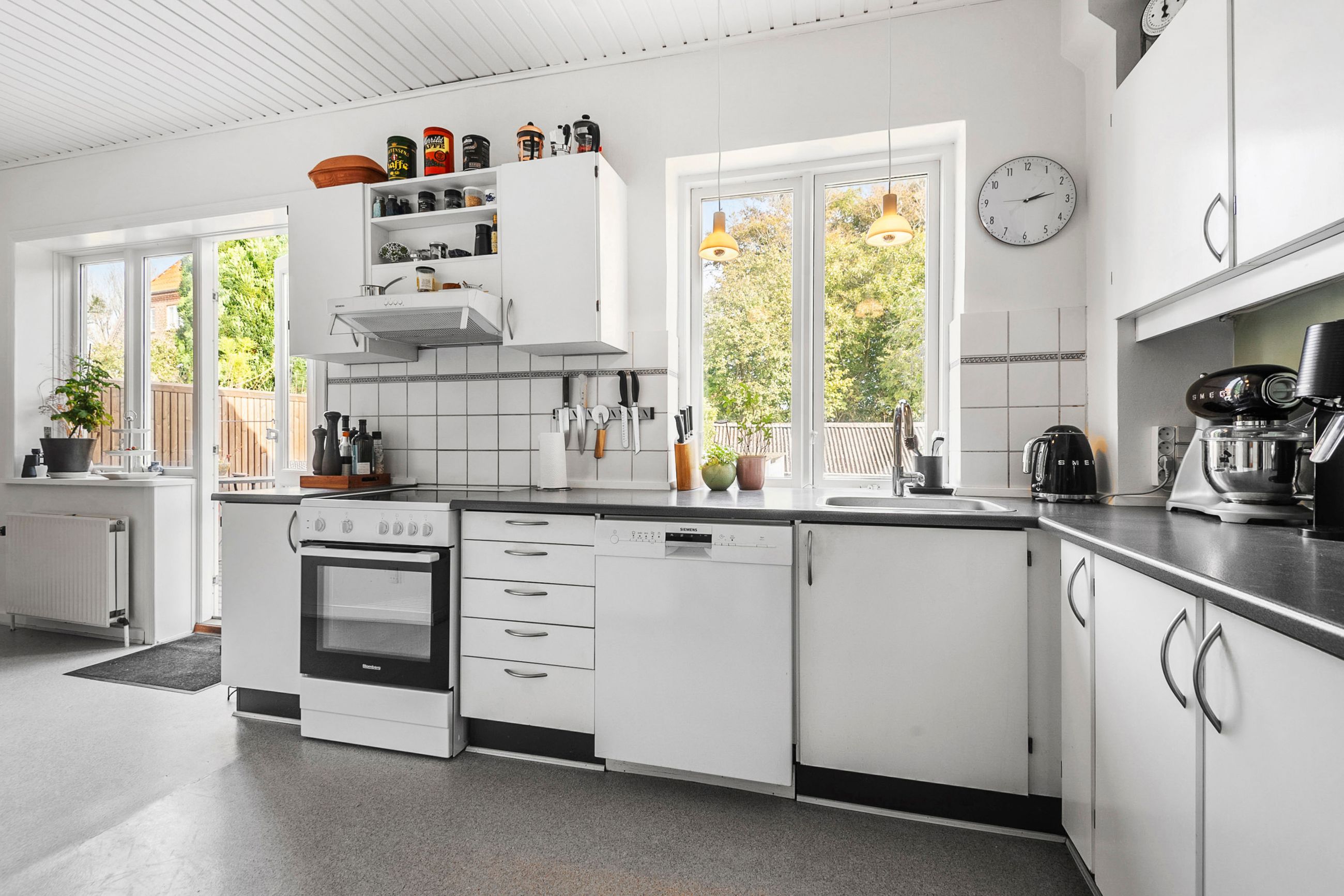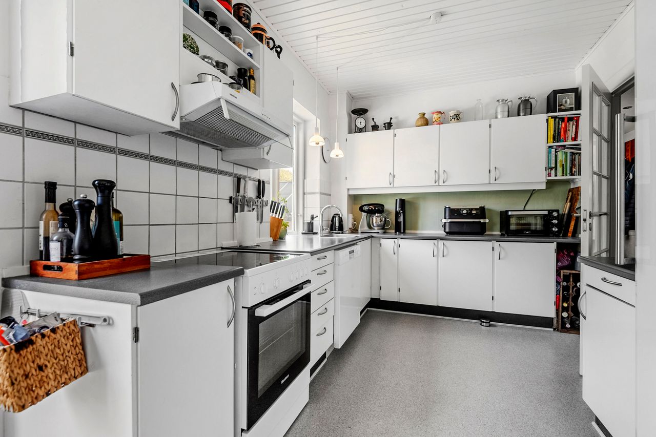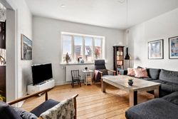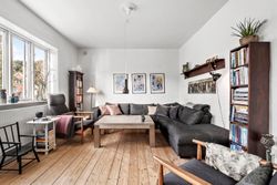 Indenfor bliver du mødt af en indbydende entré, der leder videre til et lyst og rummeligt køkken med spiseplads og udgang til terrassen. Fra entréen er der også adgang til et stort, lækkert badeværelse samt en spisestue med højt til loftet og smukke, originale trægulve. Spisestuen er i åben forbindelse med den hyggelige stue, hvilket skaber et naturligt og luftigt opholdsrum med plads til hele familien.
