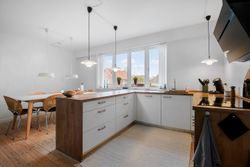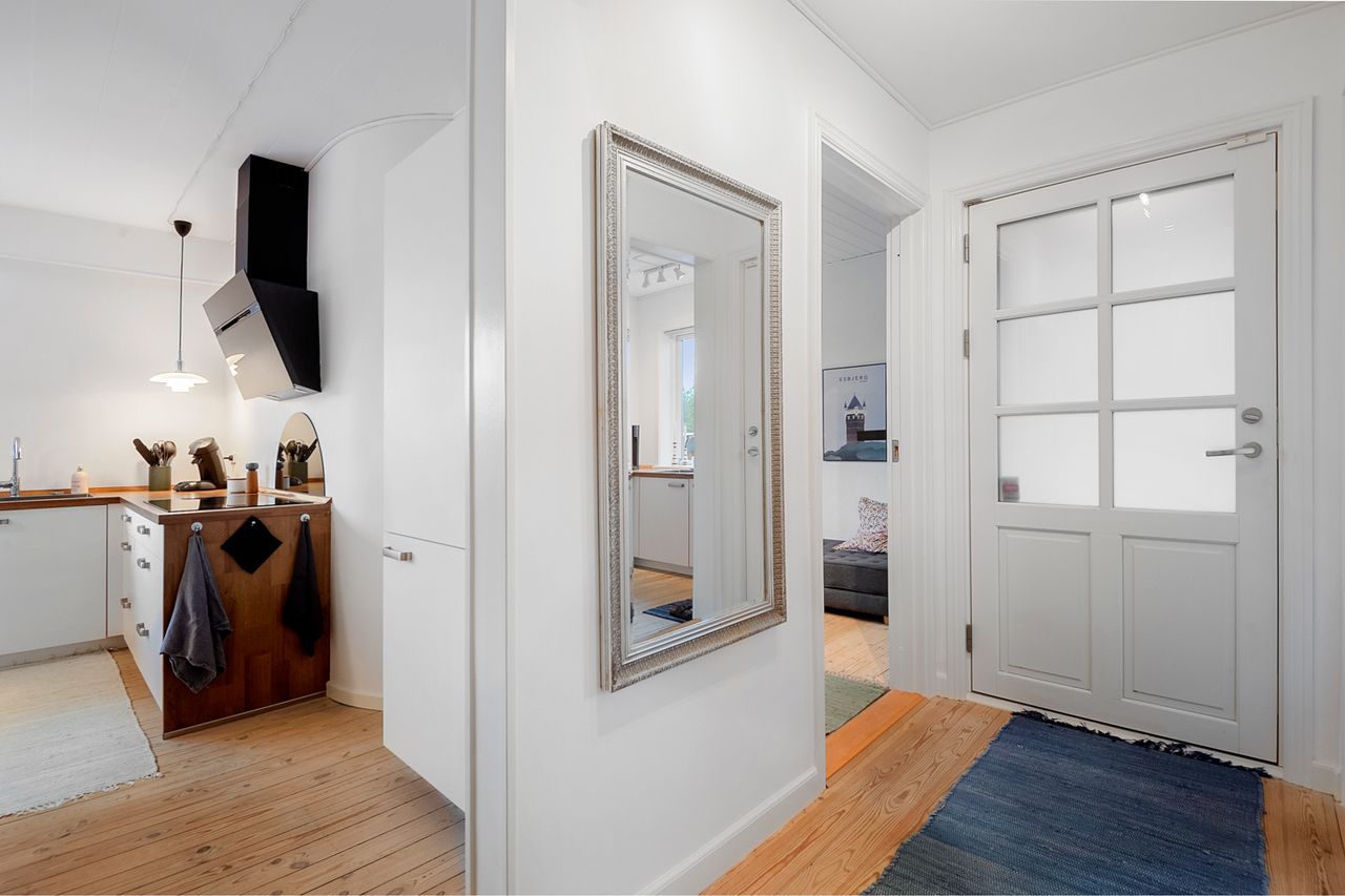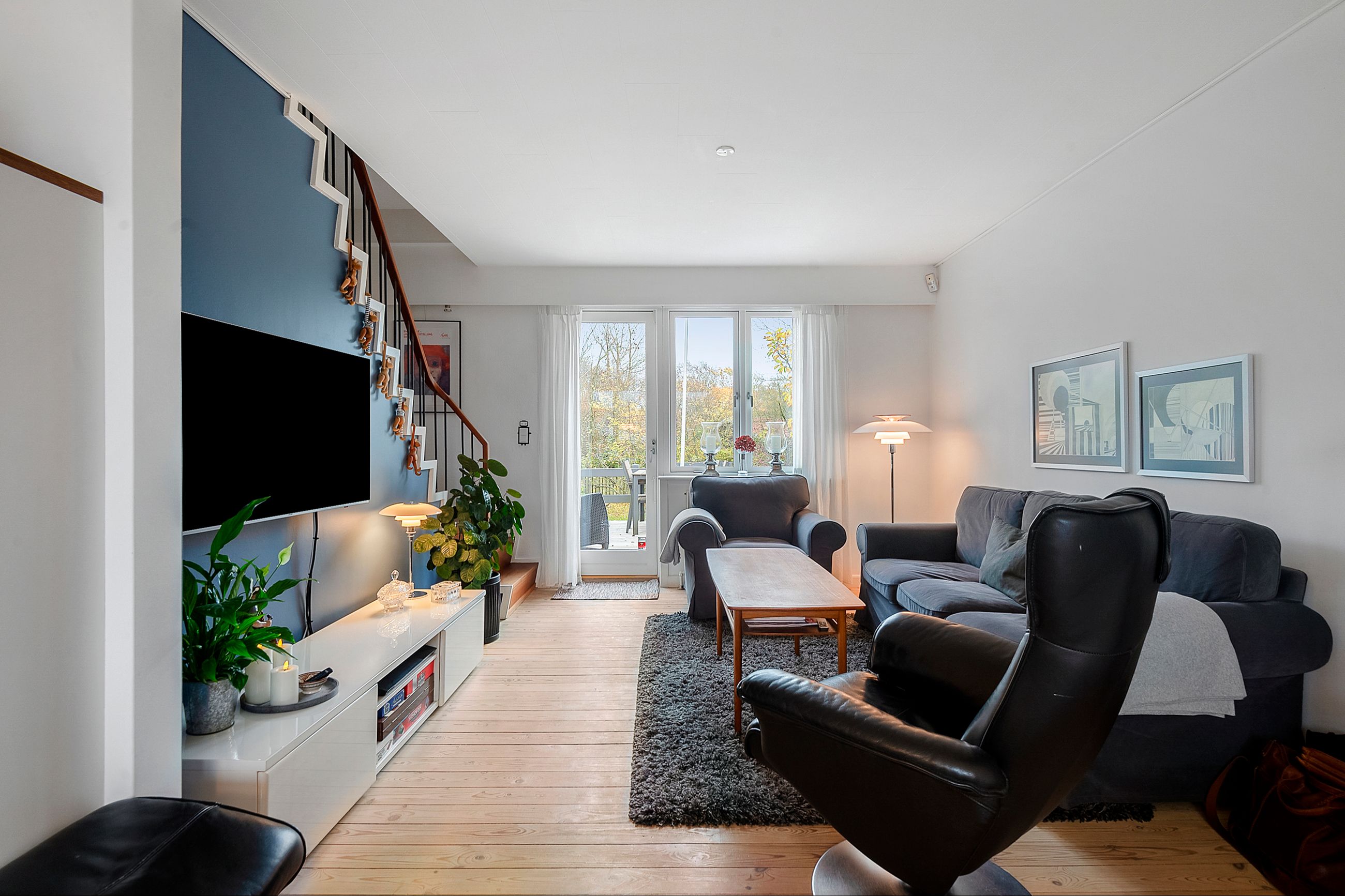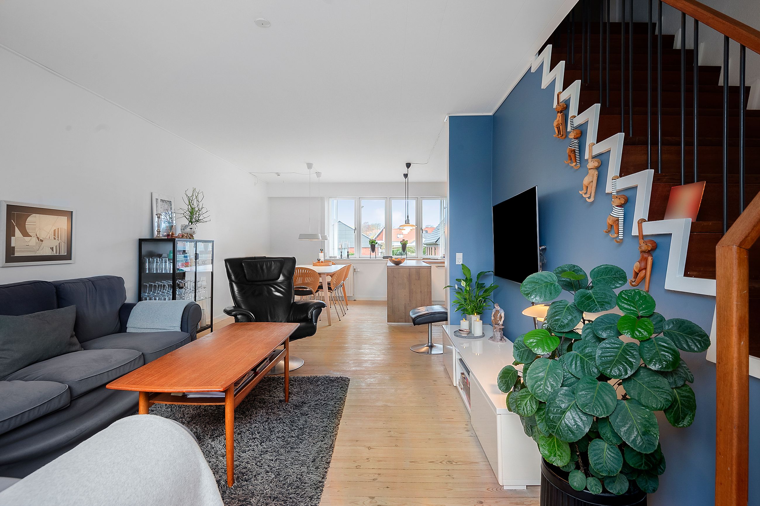 Indenfor mødes du af en rummelig entré med god opbevaring og et indbydende førstehåndsindtryk. Det lyse og moderne køkken-alrum flyder naturligt sammen med den hyggelige stue – et oplagt samlingspunkt for både familie og venner. Herfra er der direkte udgang til terrassen, så du kan lade hverdagen glide ubesværet mellem ude og inde. I stueplan finder du desuden et stort værelse og et flot badeværelse med en moderne og stilren indretning.