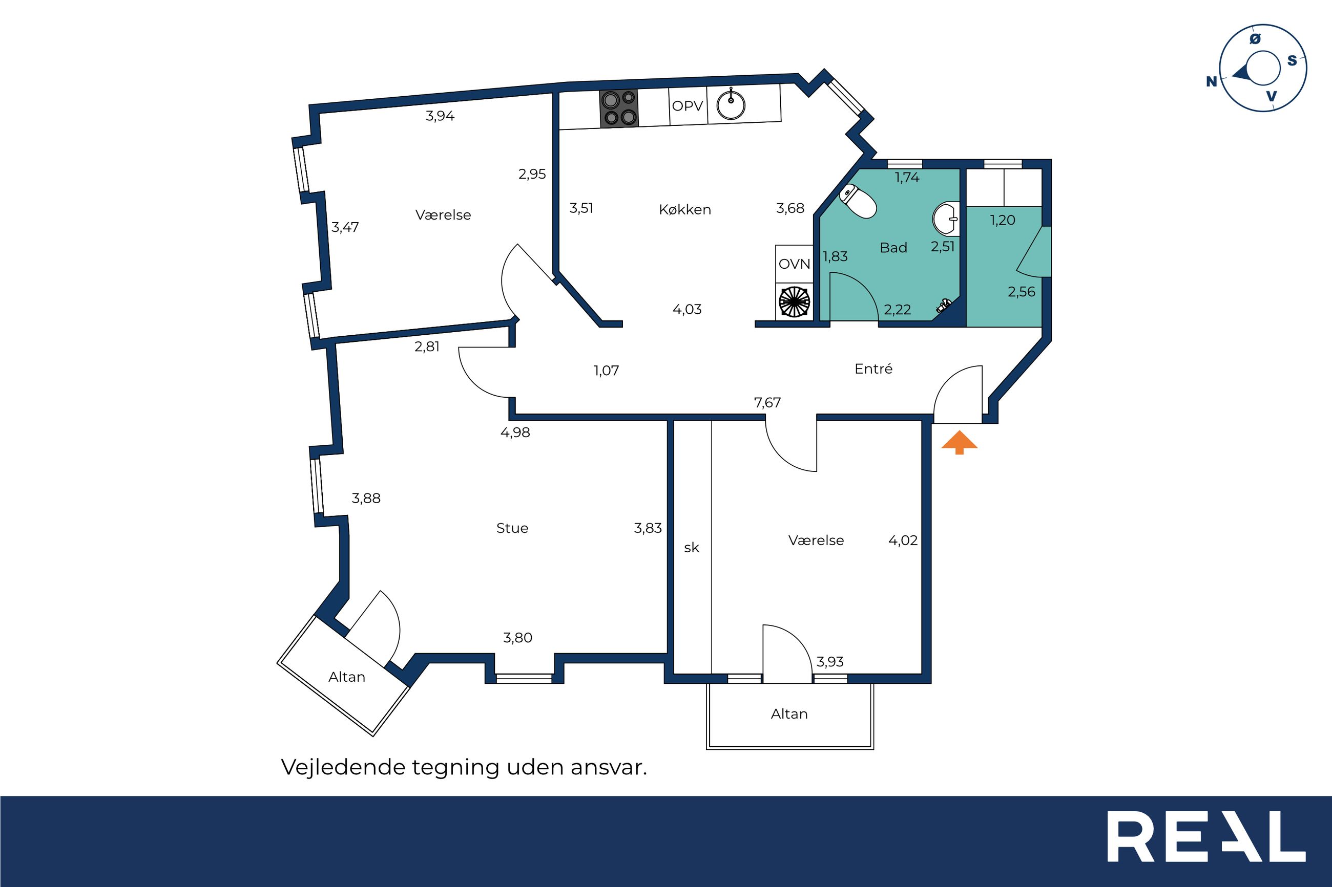 Boligen rummer en praktisk entré med bryggers og vaskefaciliteter, et rummeligt badeværelse, to store værelser samt et stort, moderne køkken med god spiseplads. Stuen er hyggelig og nem at indrette, og herfra er der udgang til en altan, som giver ekstra lys og luft.