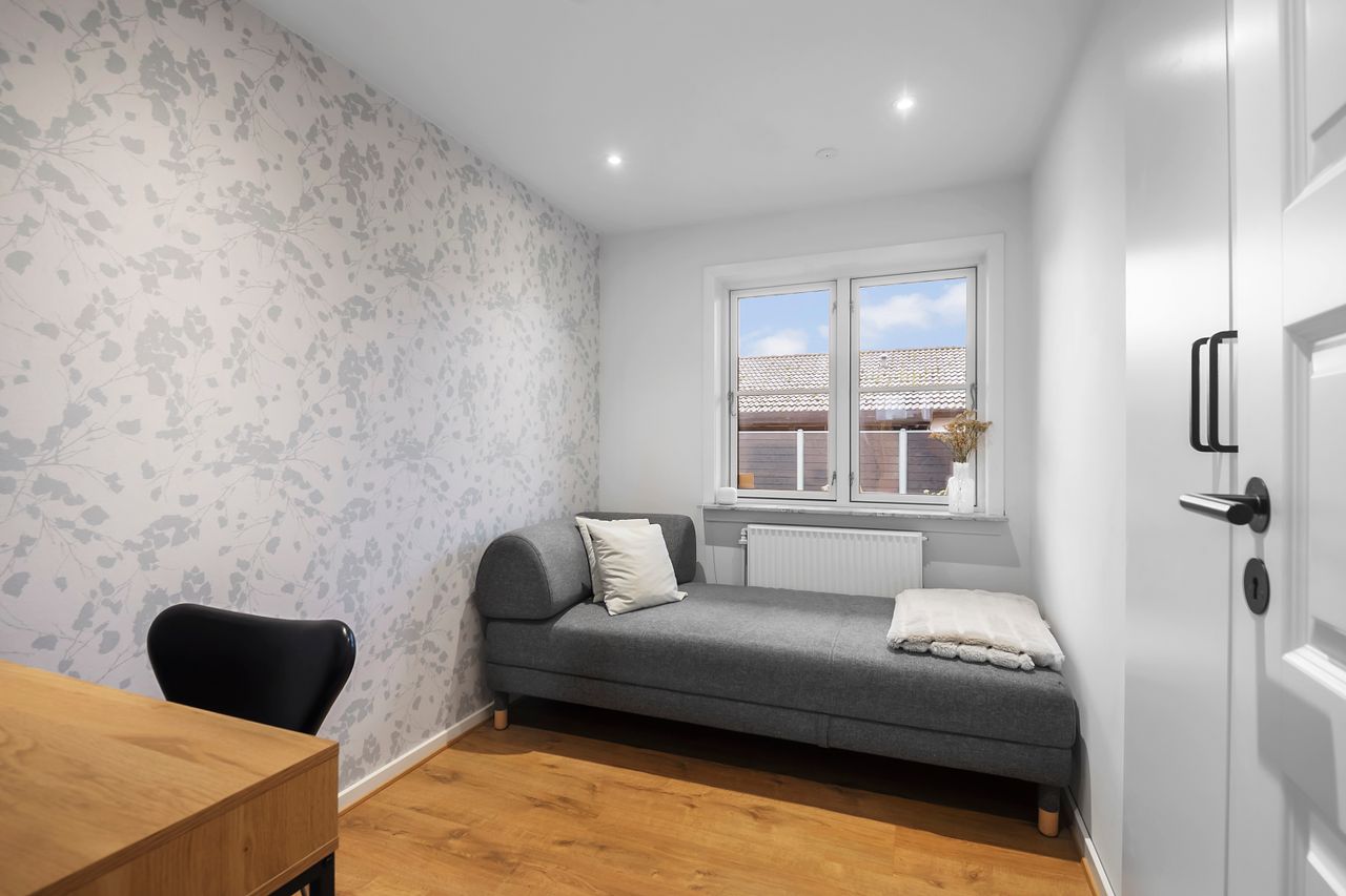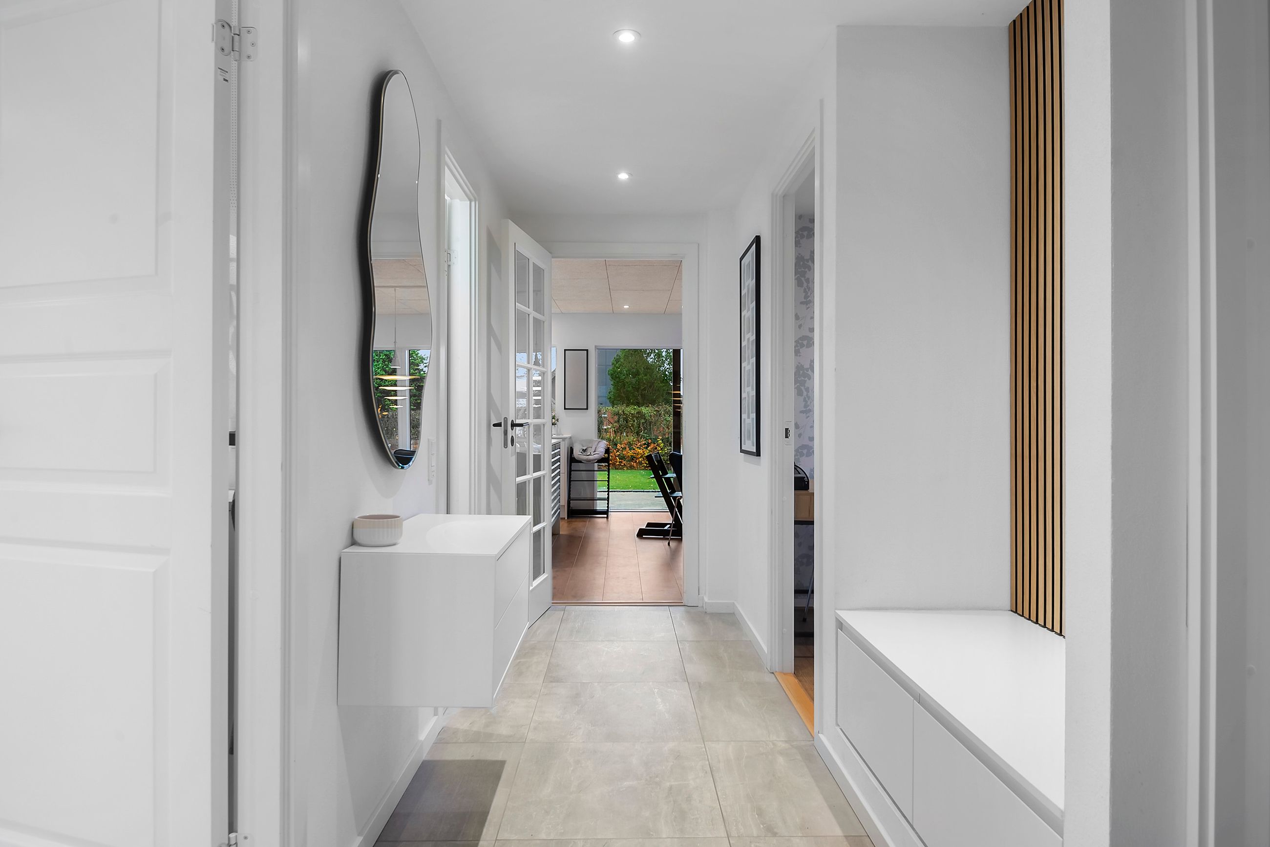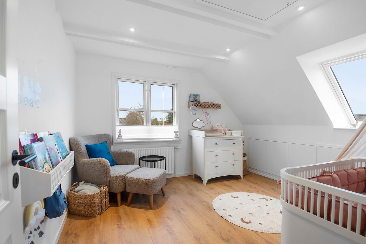 Velindrettet bolig med plads til hele familienHuset byder på fire rummelige værelser, som er perfekt fordelt med to på 1. sal og to i stueplan – ideelt til både børnefamilien, hjemmekontoret eller gæsteværelset. Hertil kommer et lækkert badeværelse på hver etage, som giver en ekstra grad af komfort i hverdagen.