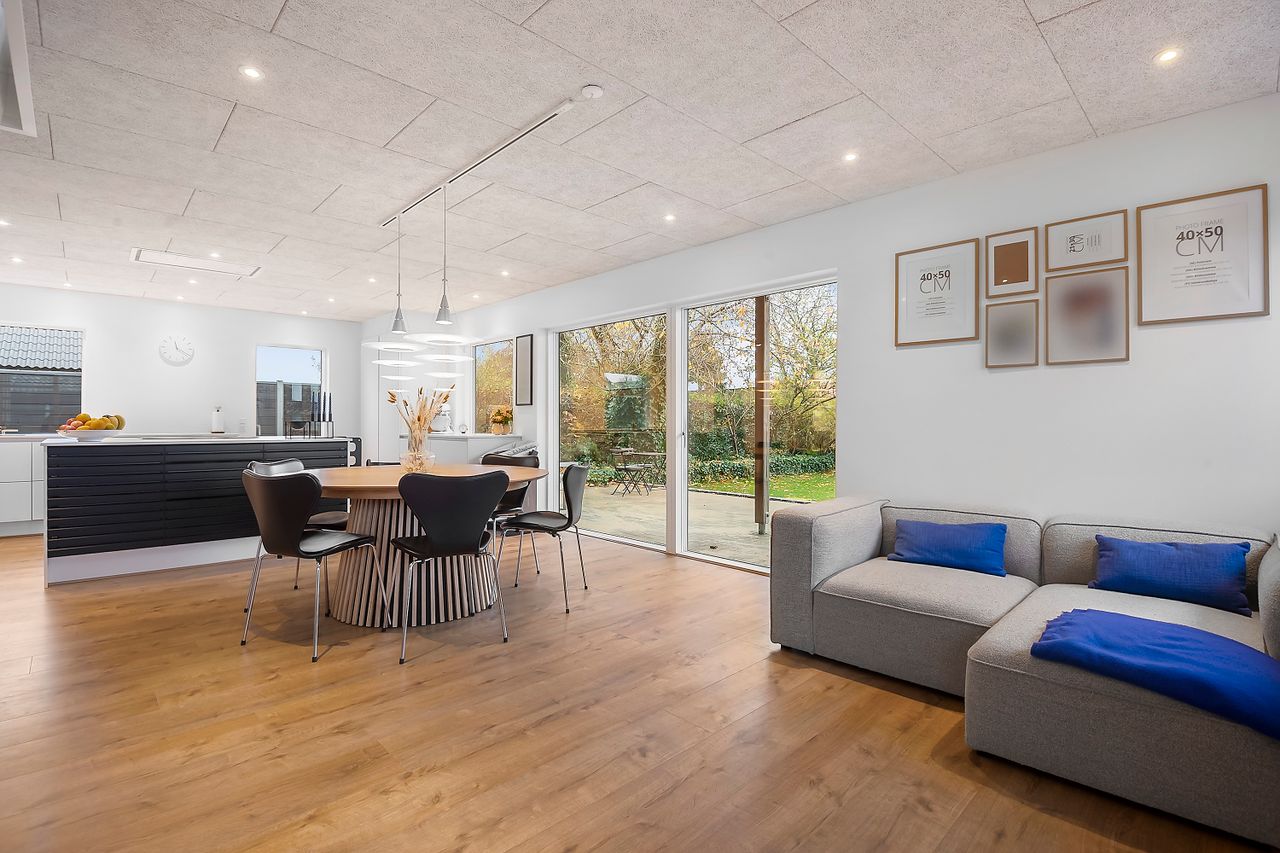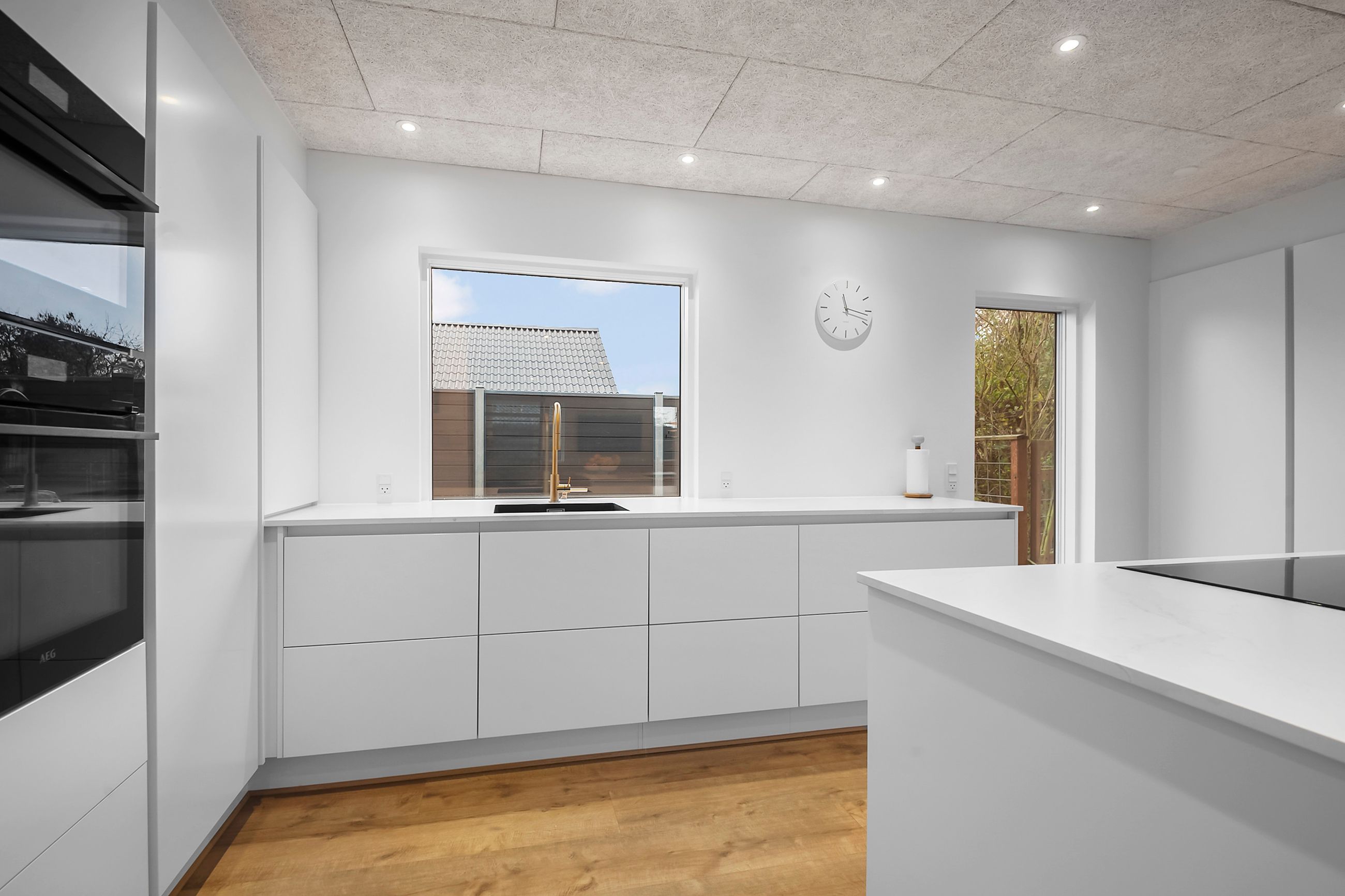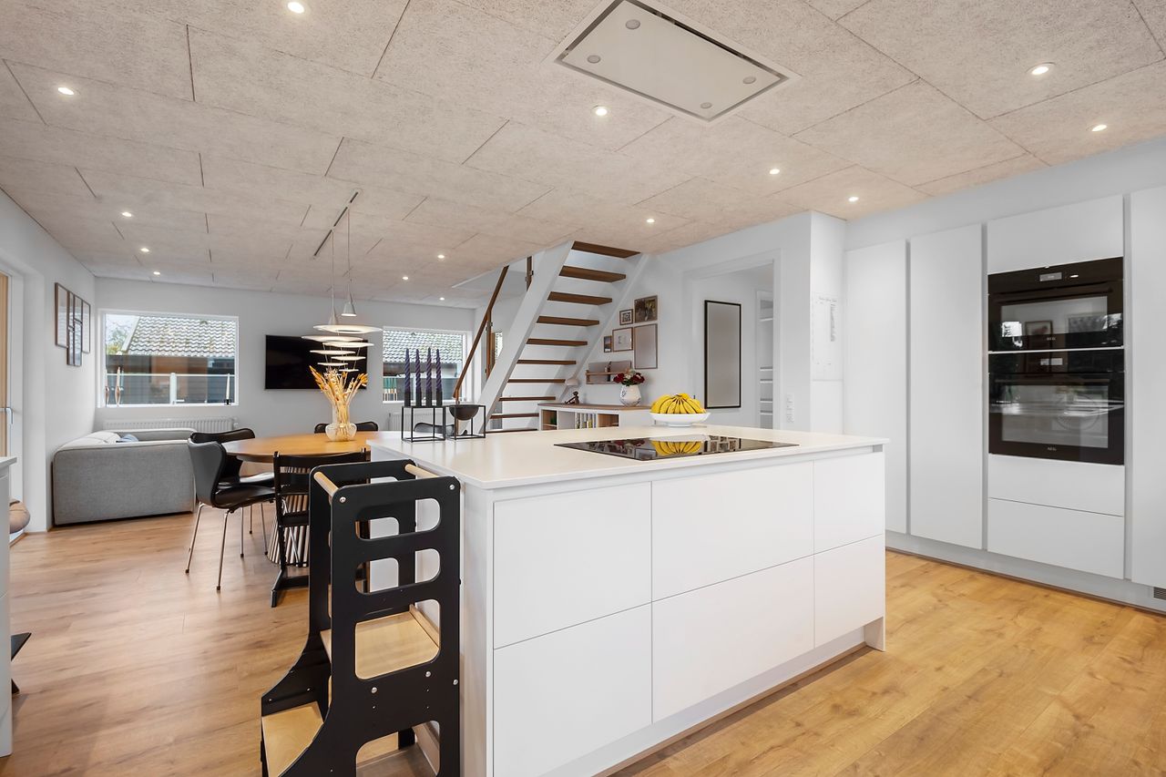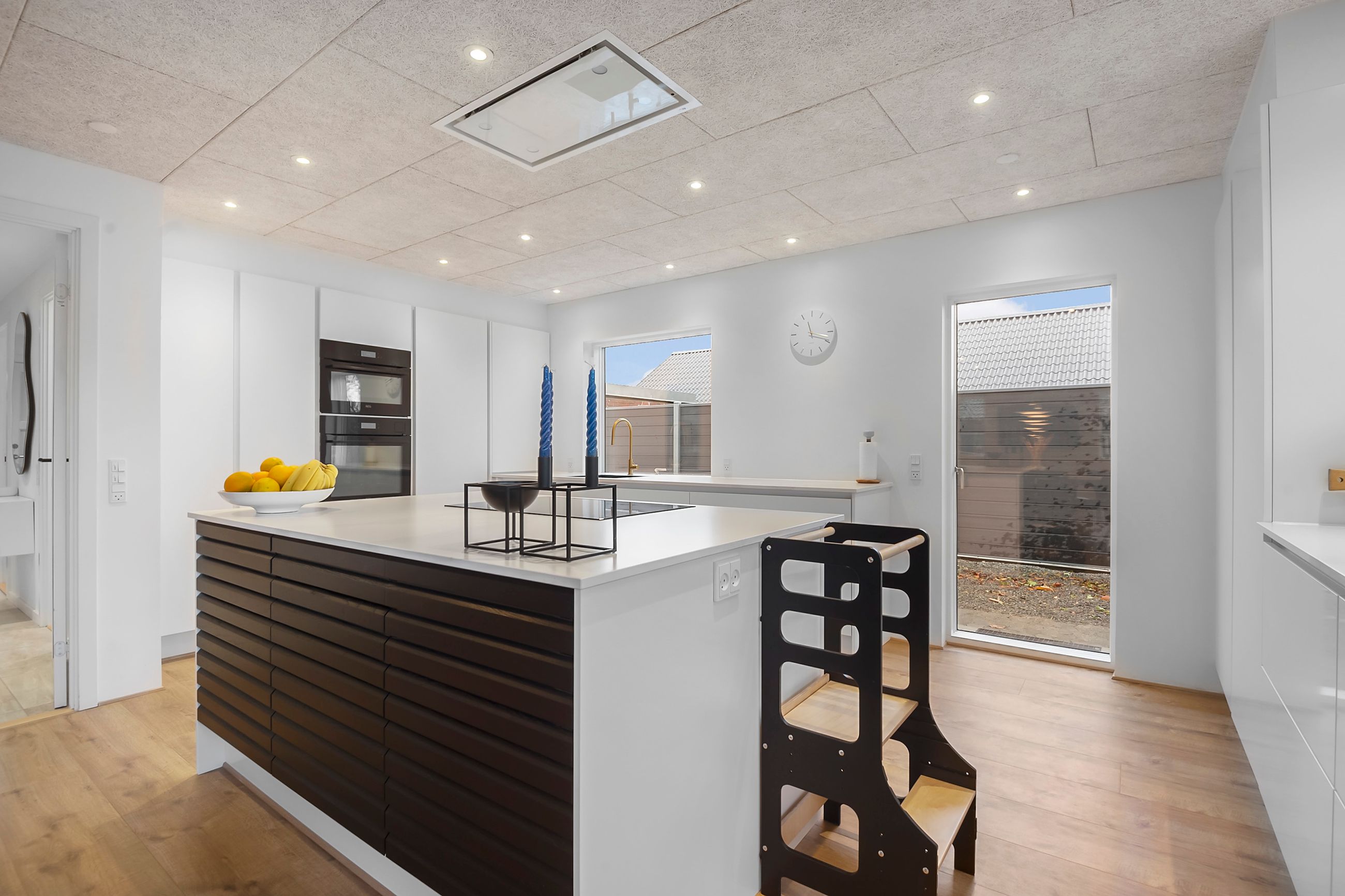 Køkken/alrum – boligens naturlige samlingspunktDet store og indbydende køkken/alrum er uden tvivl hjemmets hjerte. Her er plads til både madlavning, lektielæsning, hygge og samvær. De store vinduespartier giver et fantastisk lysindfald, og fra rummet er der direkte udgang til den skønne have og et dejligt terrassemiljø, hvor sommerens måltider og afslapning venter.