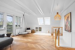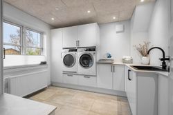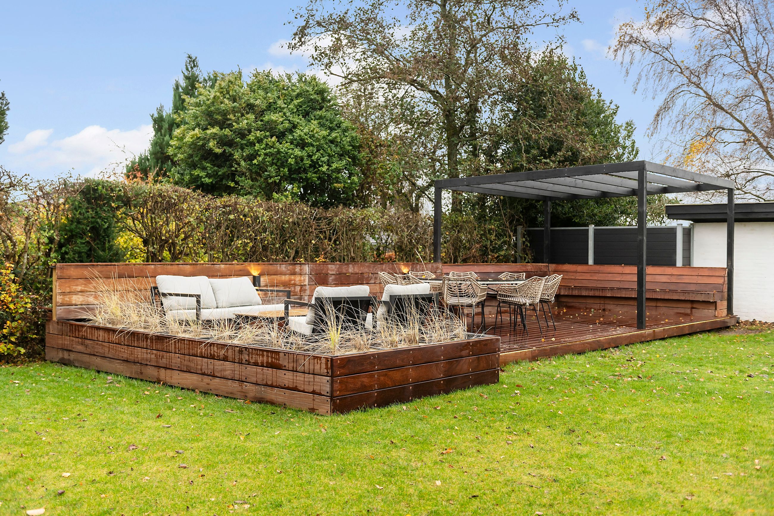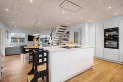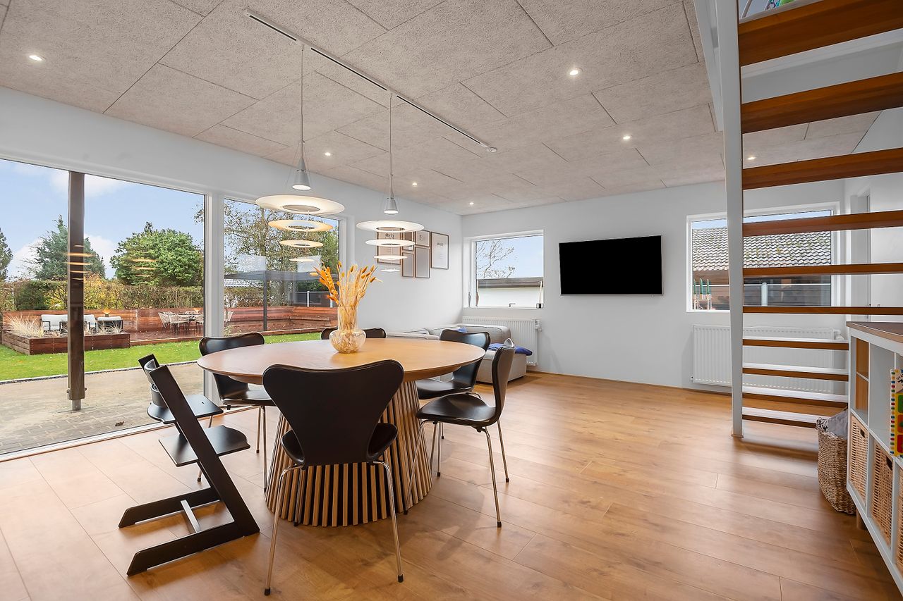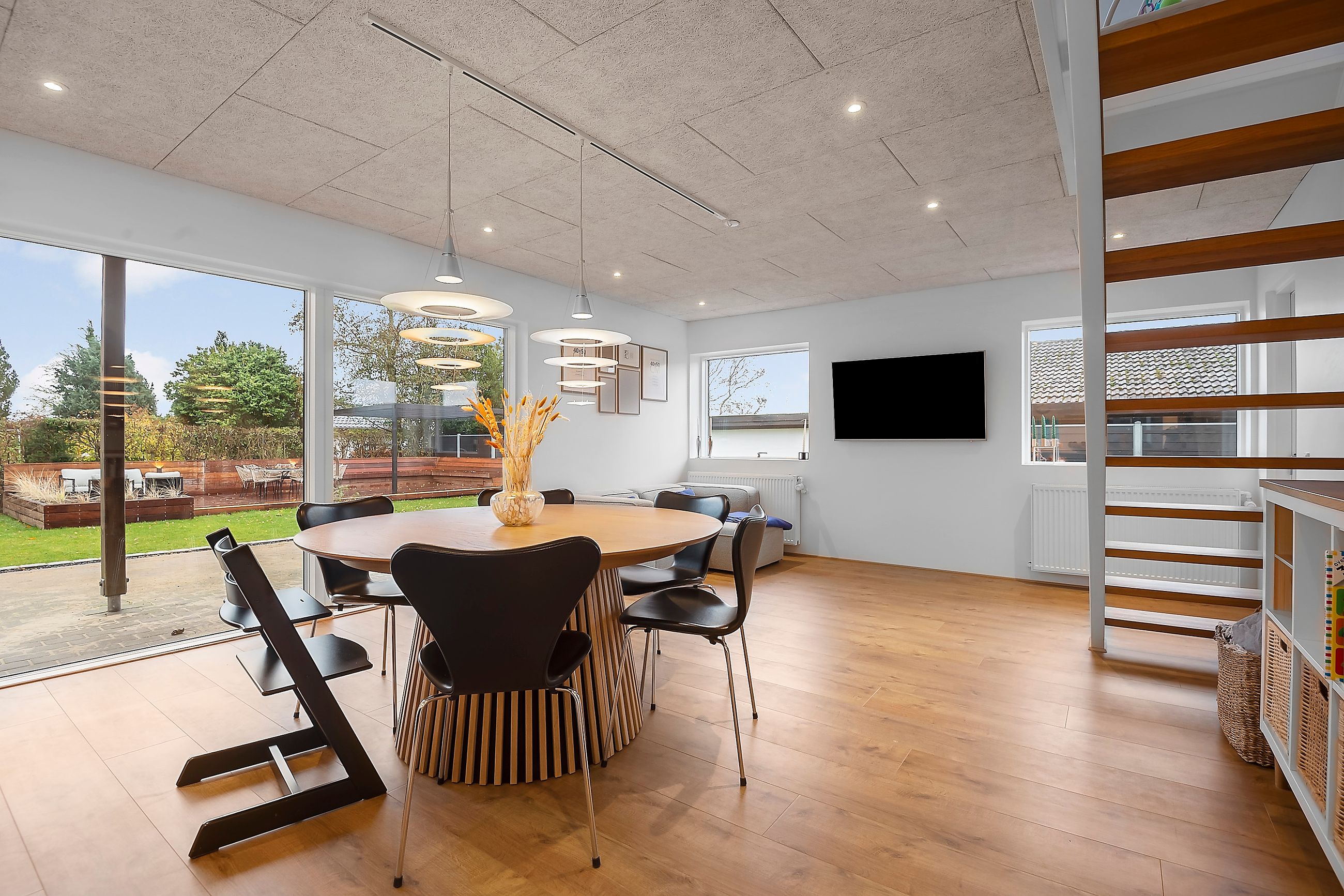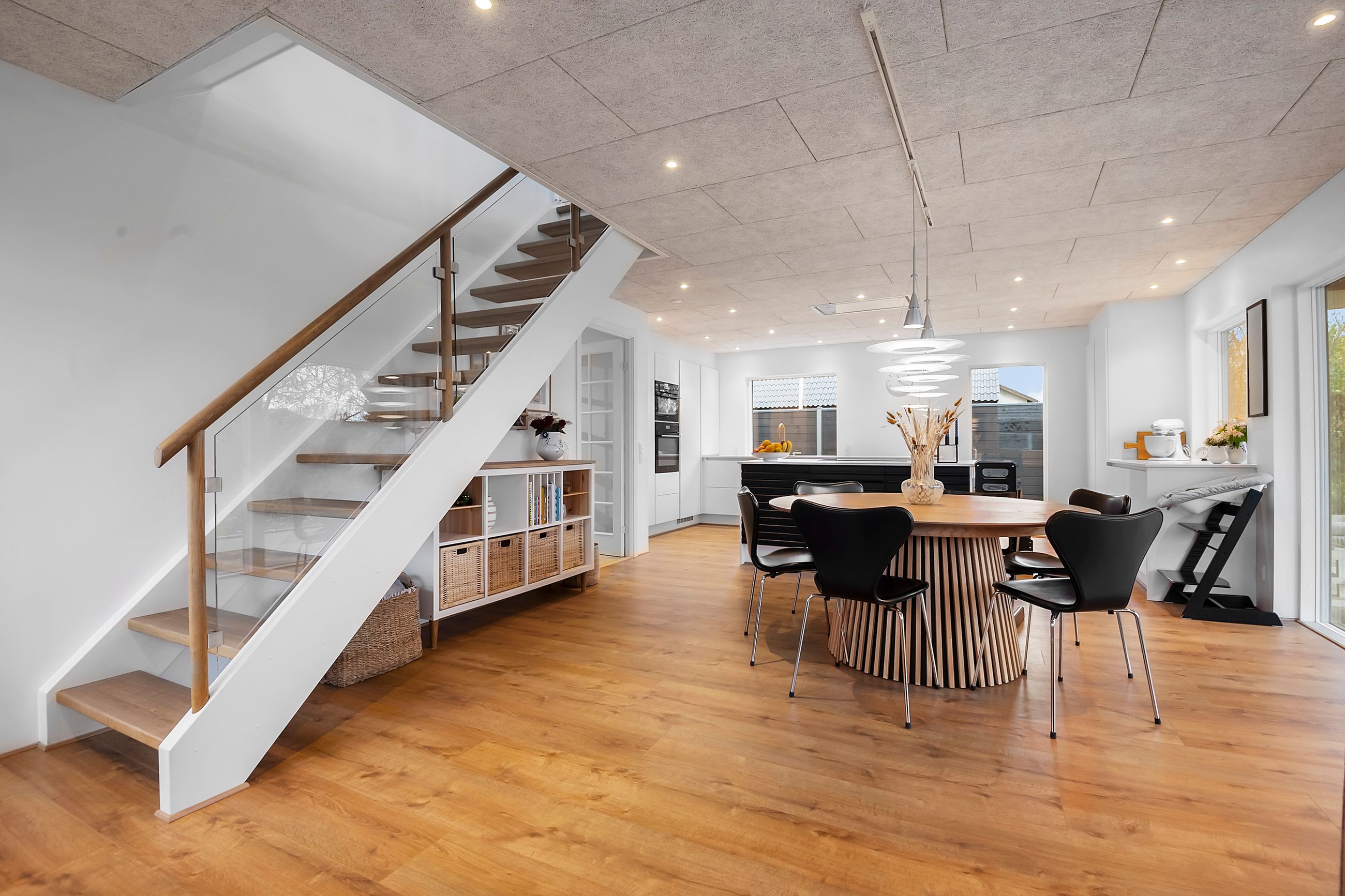 Køkken/alrum – boligens naturlige samlingspunktDet store og indbydende køkken/alrum er uden tvivl hjemmets hjerte. Her er plads til både madlavning, lektielæsning, hygge og samvær. De store vinduespartier giver et fantastisk lysindfald, og fra rummet er der direkte udgang til den skønne have og et dejligt terrassemiljø, hvor sommerens måltider og afslapning venter.