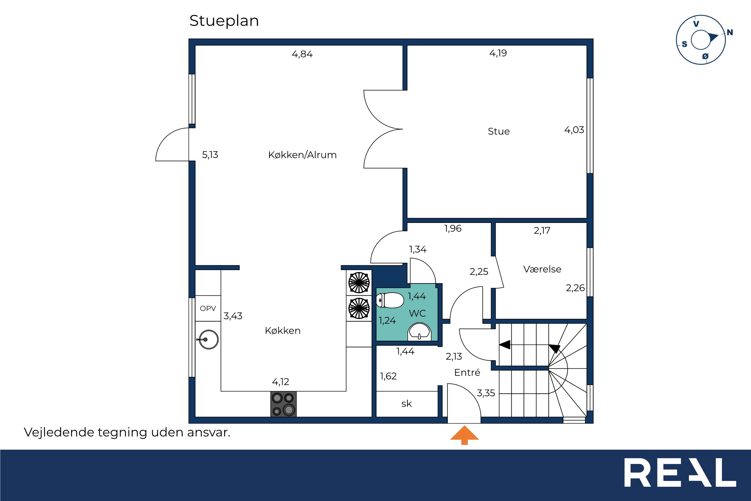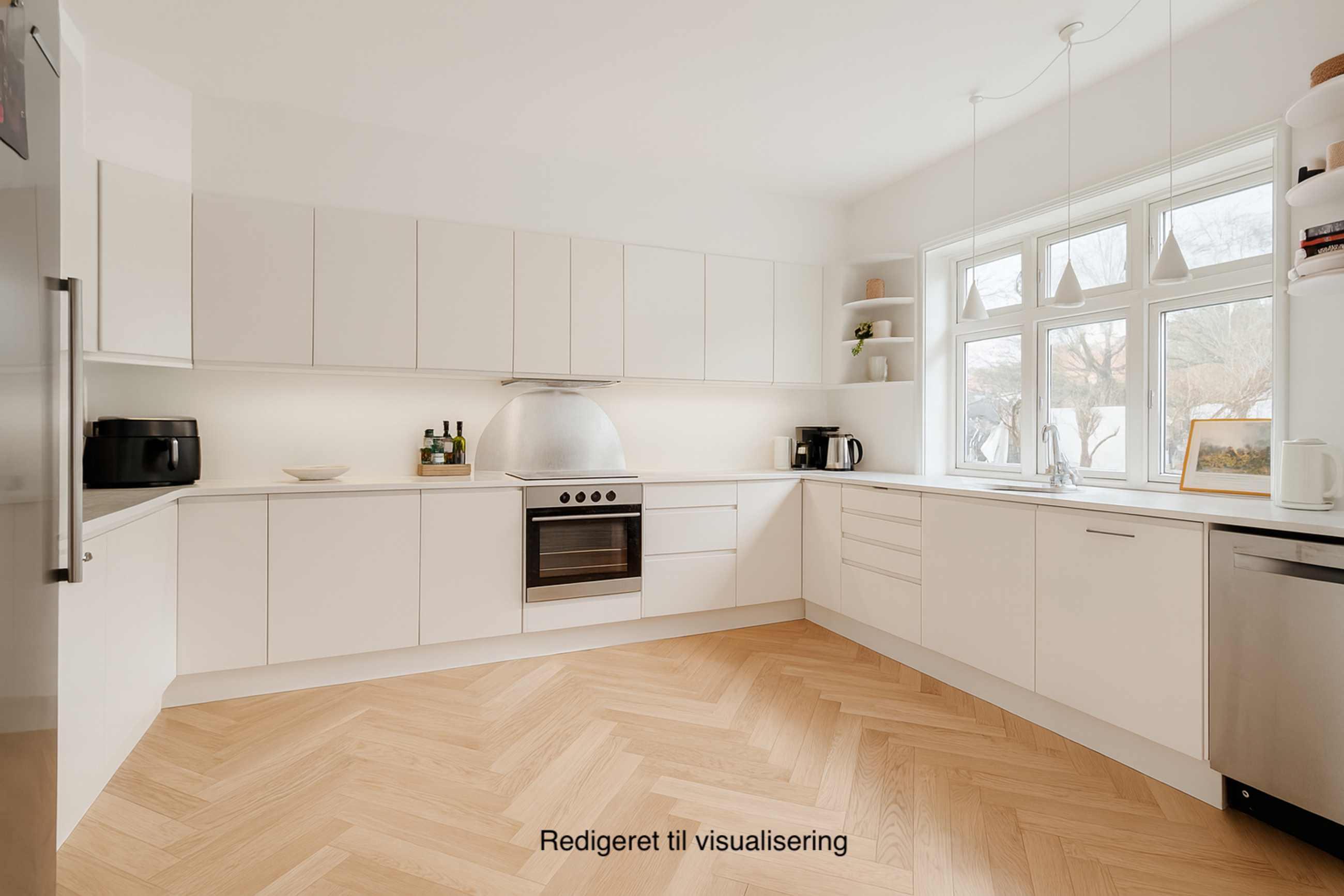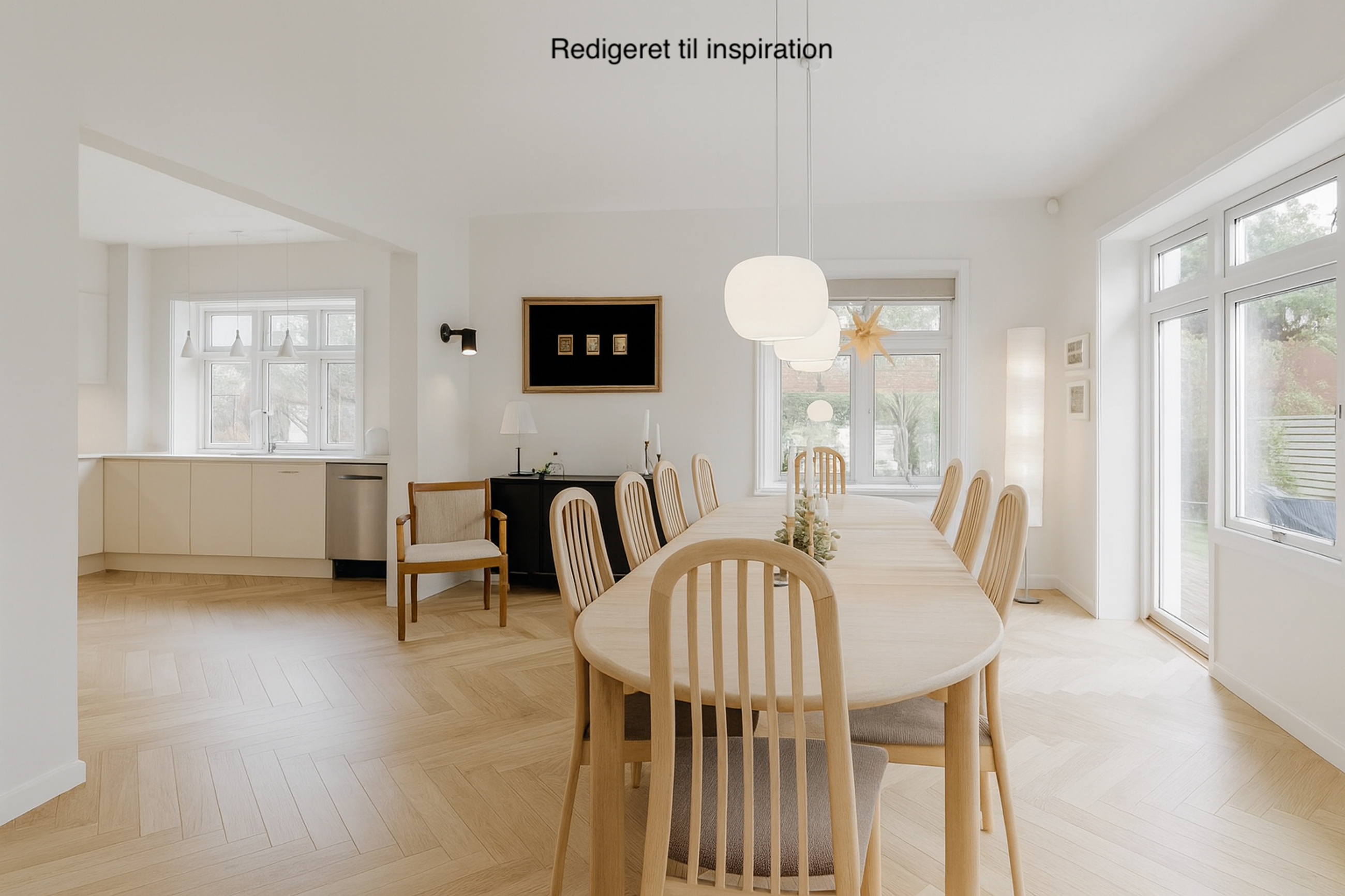 Indenfor bydes du velkommen i en rummelig entré, efterfulgt af et gæstetoilet og et praktisk kontor. Husets hjerte er det store, moderne køkken-alrum med gulvvarme – et fantastisk samlingspunkt for hele familien. Herfra er der direkte forbindelse til den hyggelige stue, hvorfra der er udgang til den smukke have via spisestuen.