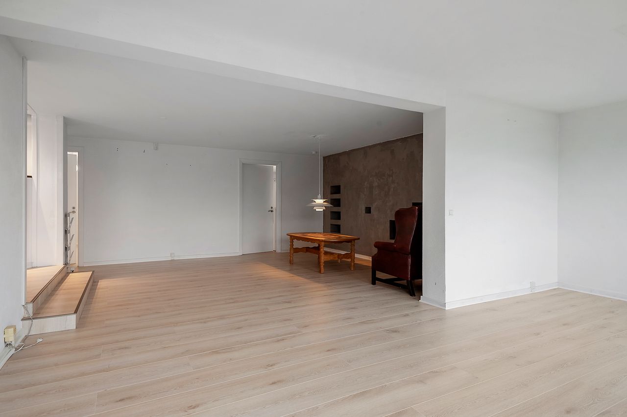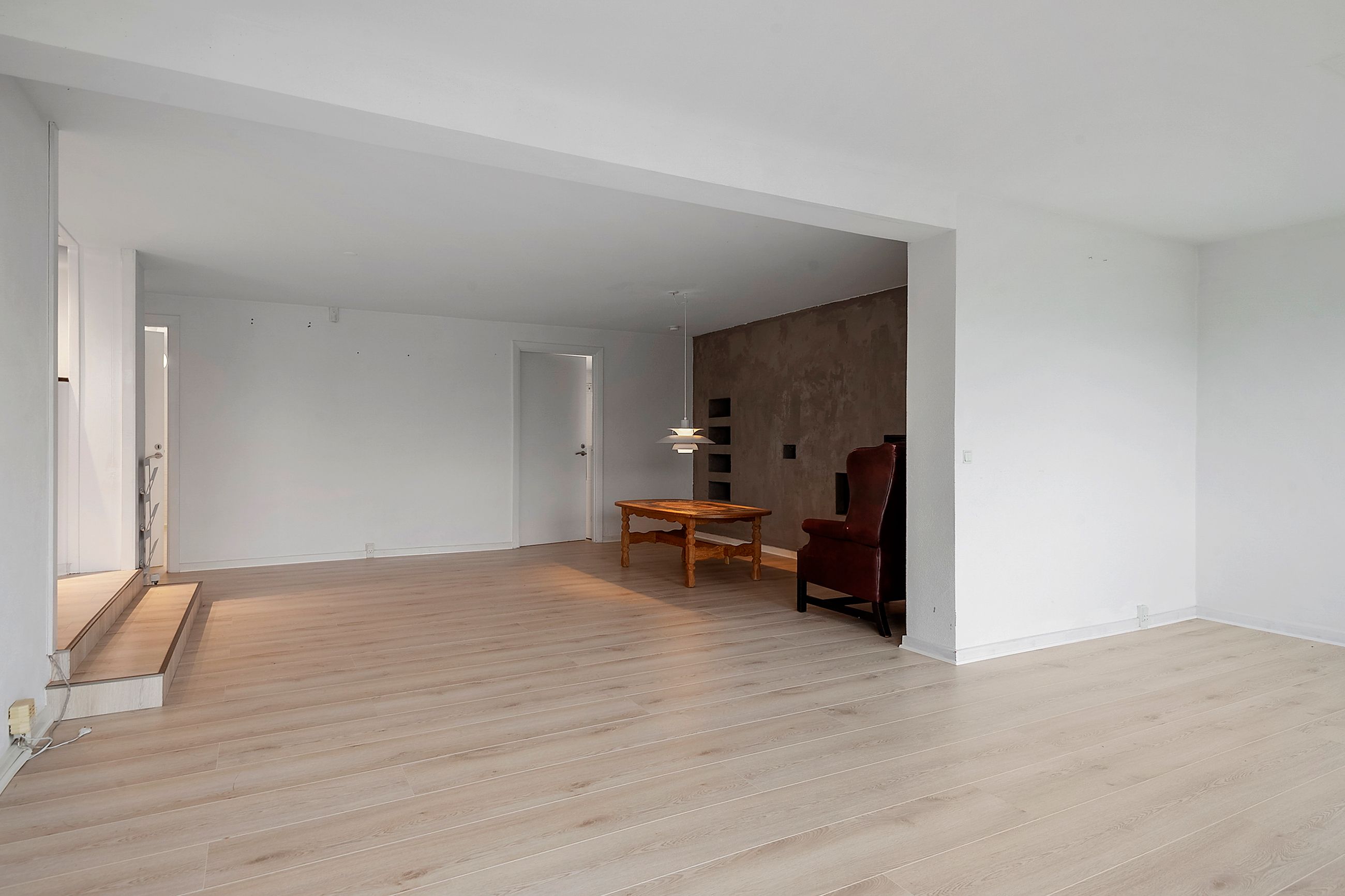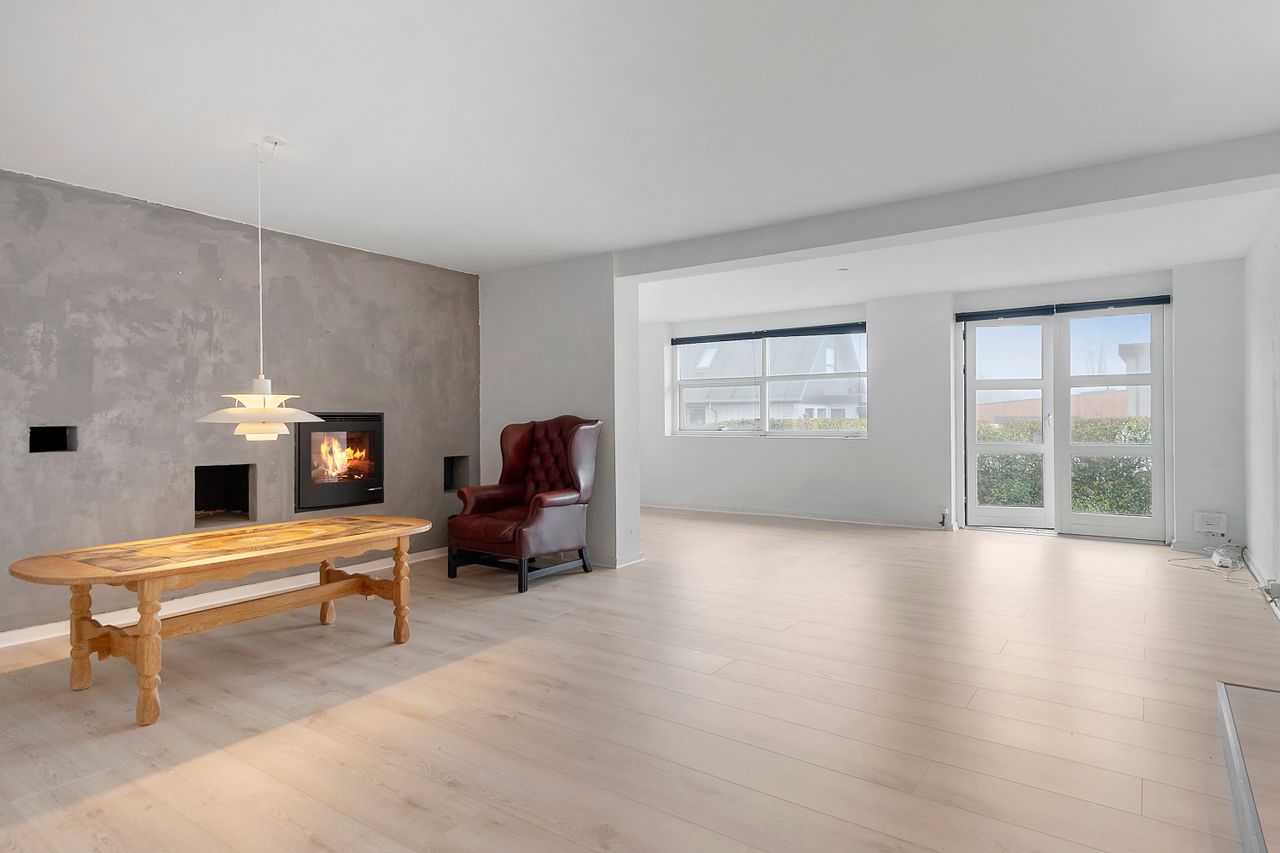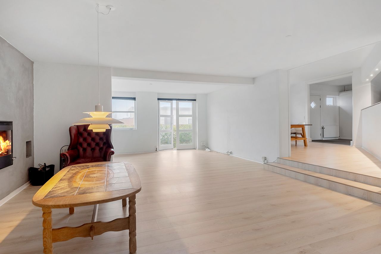 Et par trin ned finder du den store opholdsstue med pejs og gulvvarme – et skønt rum med mange indretningsmuligheder og en hyggelig atmosfære året rundt.
