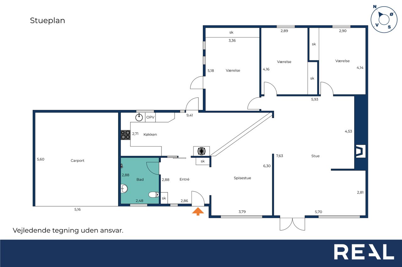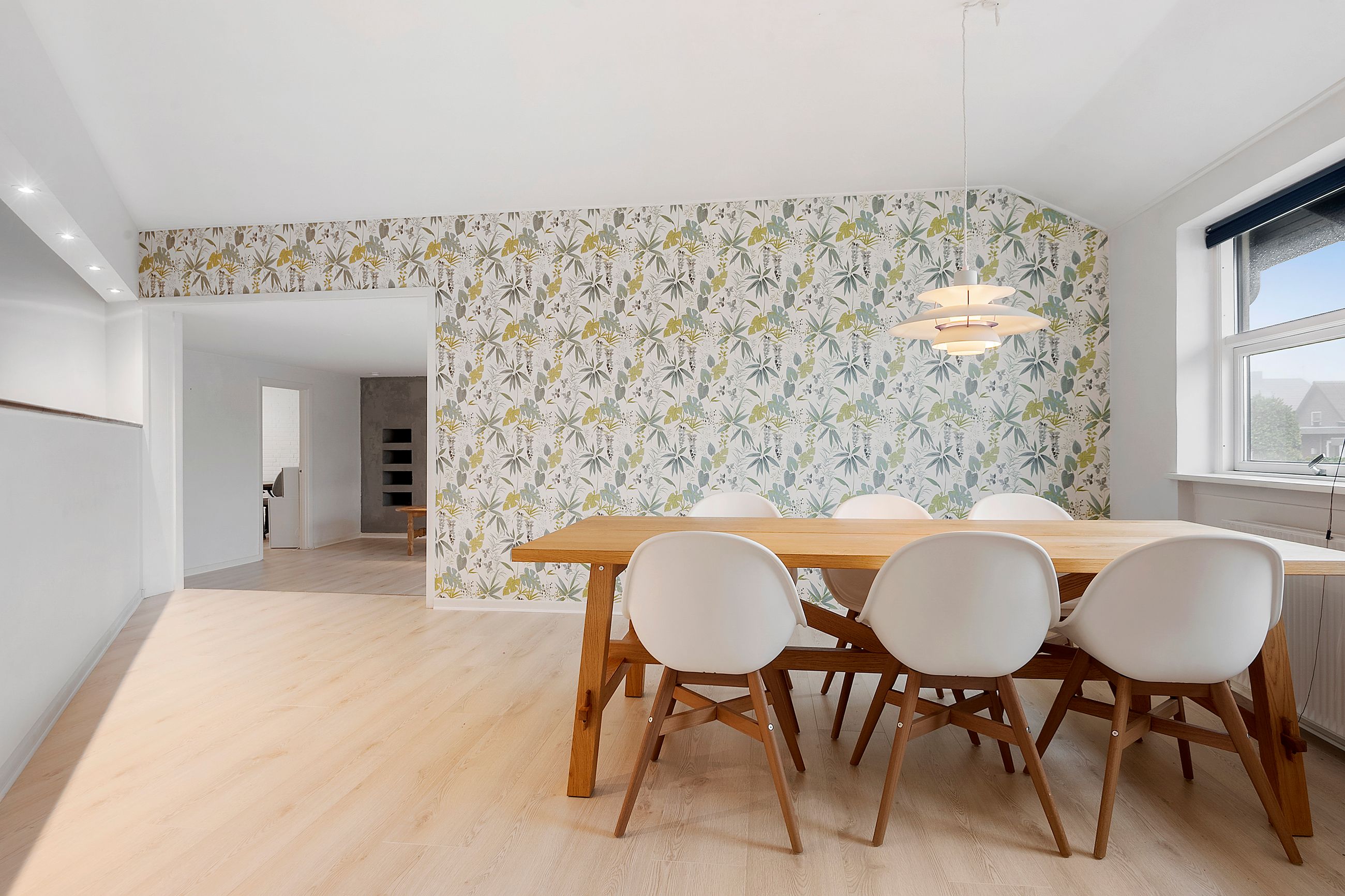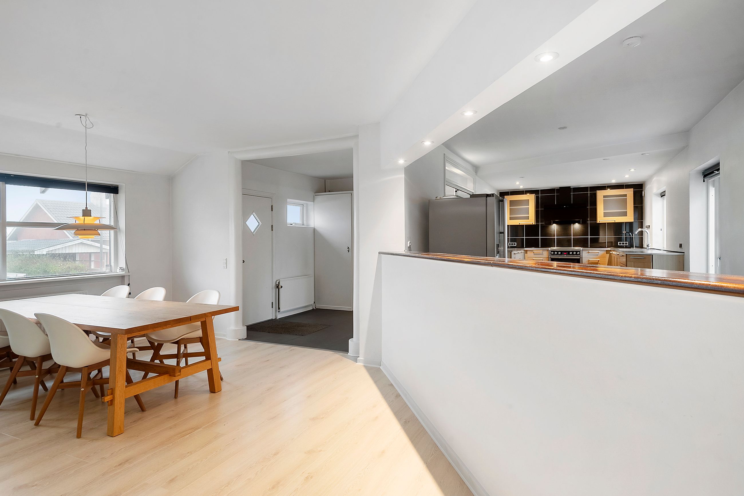 Når du træder ind i huset, mødes du af en stor og lys entré med flotte klinker, som giver et elegant førstehåndsindtryk. Fra entréen er der åben forbindelse til det funktionelle køkken og den rummelige spisestue, hvilket skaber et naturligt samlingspunkt for både hverdag og gæster.