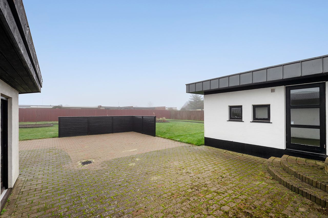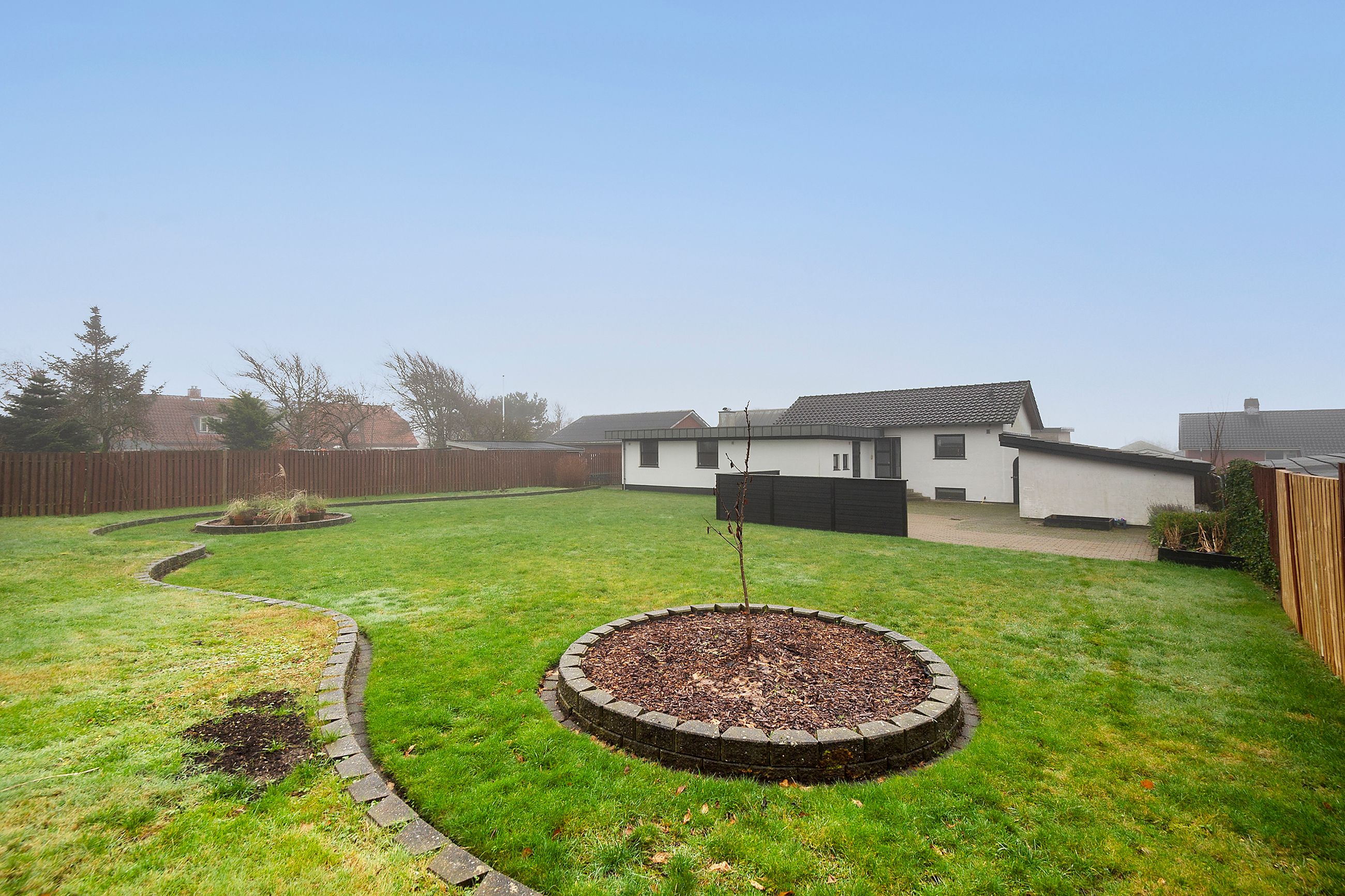 Udenfor finder du en carport samt et stort redskabsrum, der giver rigeligt med opbevaringsplads. Haven er nem at holde og giver gode muligheder for både leg og hygge.