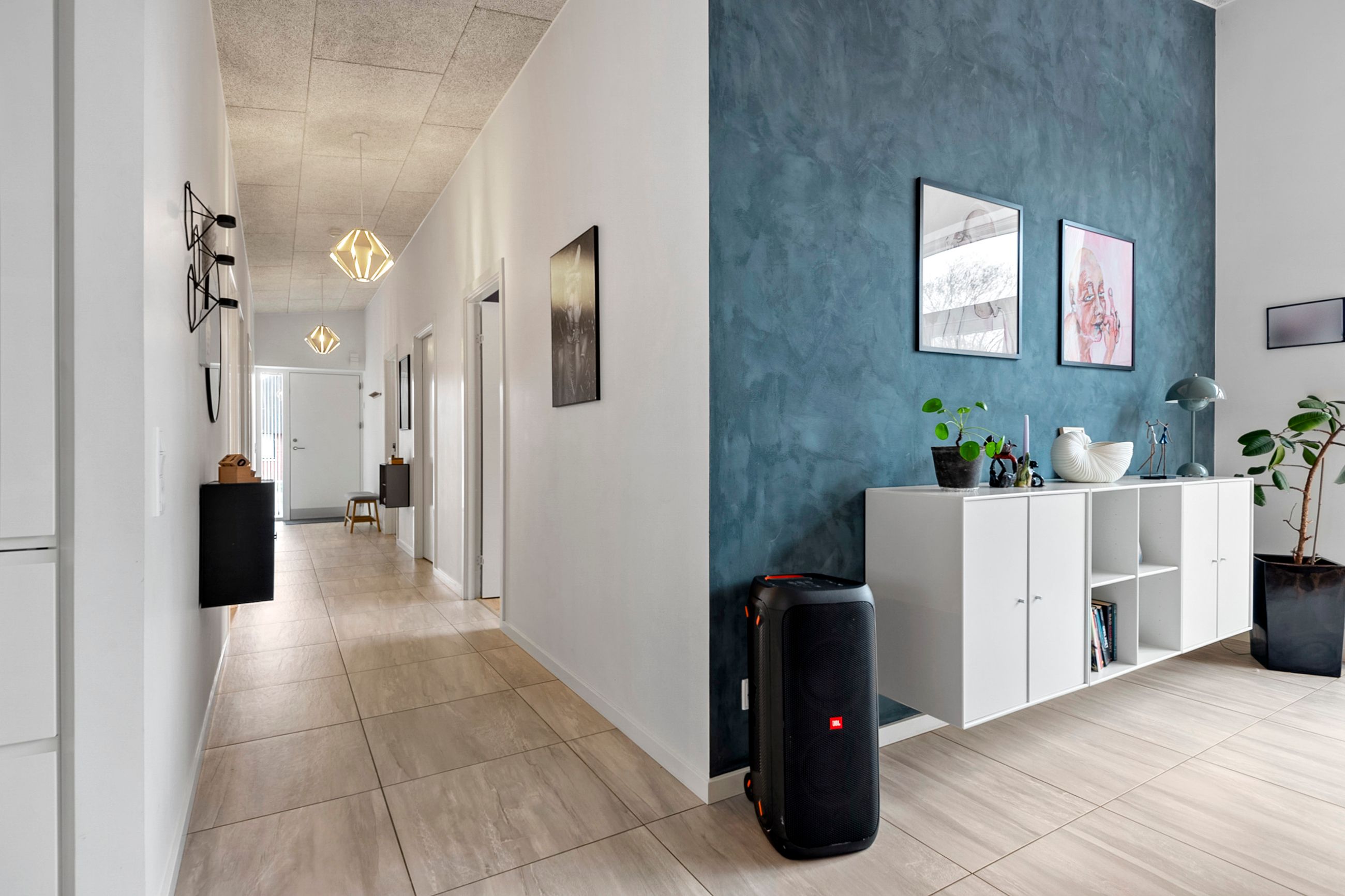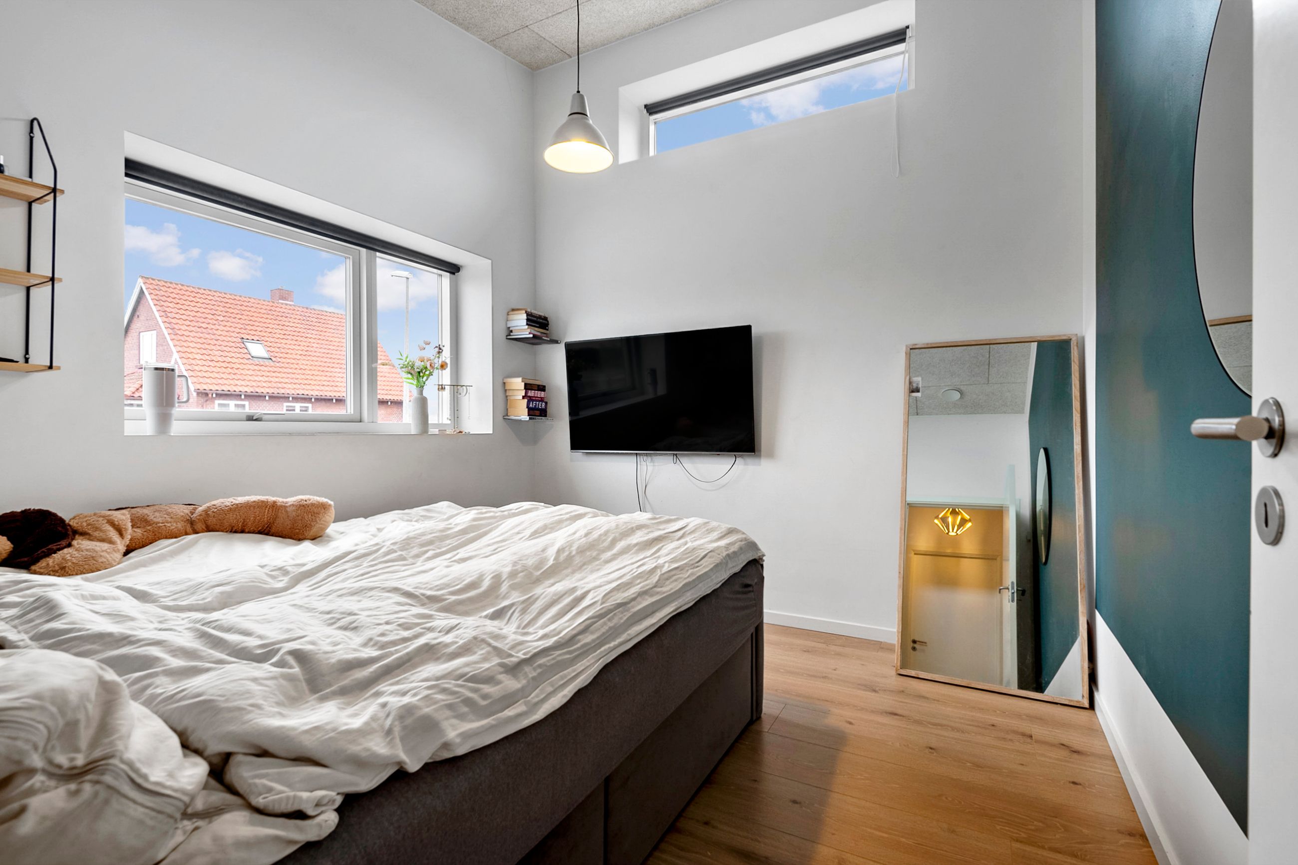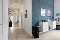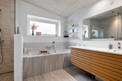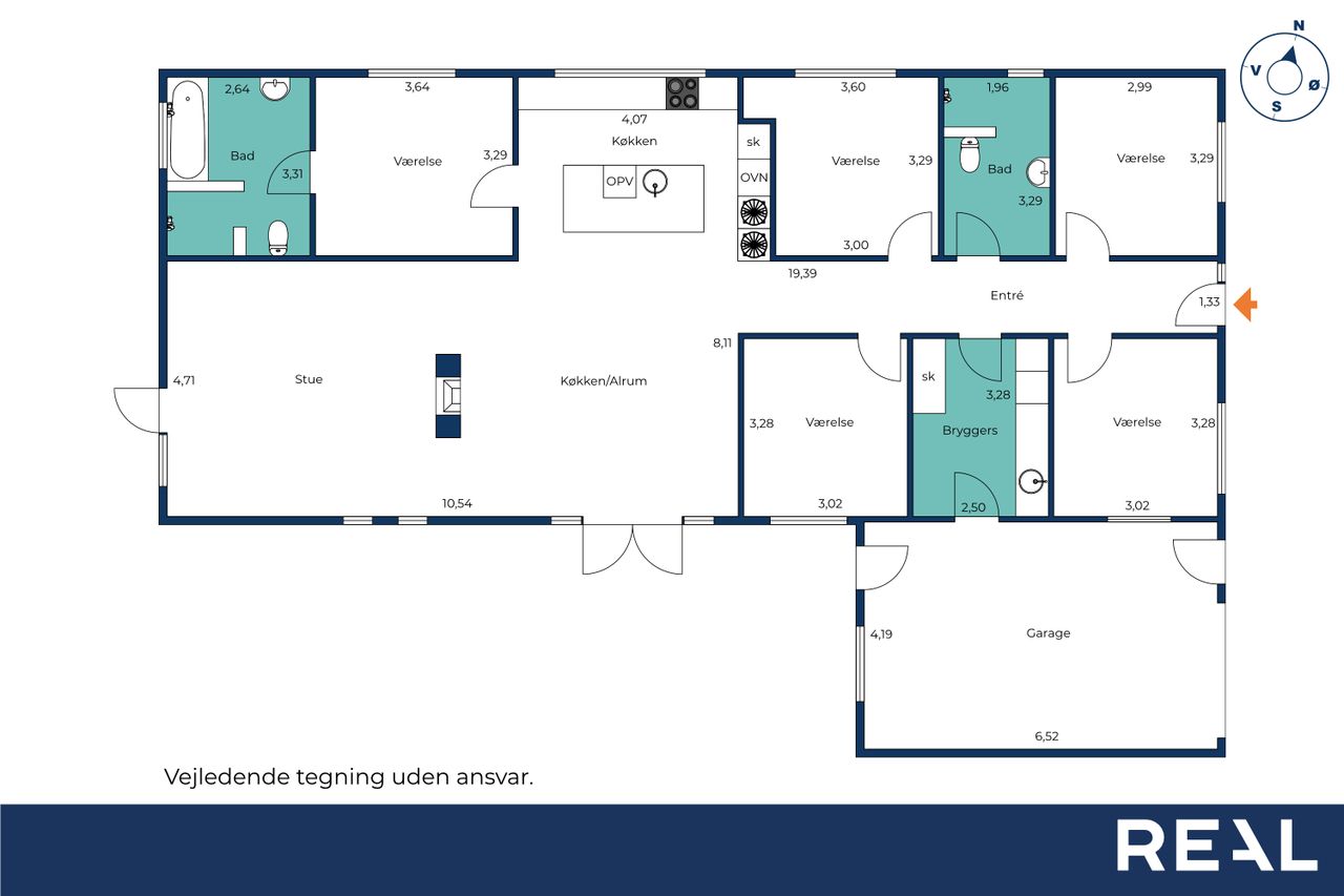 Boligen byder på en gennemtænkt planløsning med et stort bryggers samt fire store børneværelser, der er samlet omkring et stort badeværelse. Forældreafdelingen er separat og indeholder et rummeligt soveværelse med direkte adgang til et stort og lyst badeværelse, hvilket skaber en privat og rolig afdeling.
