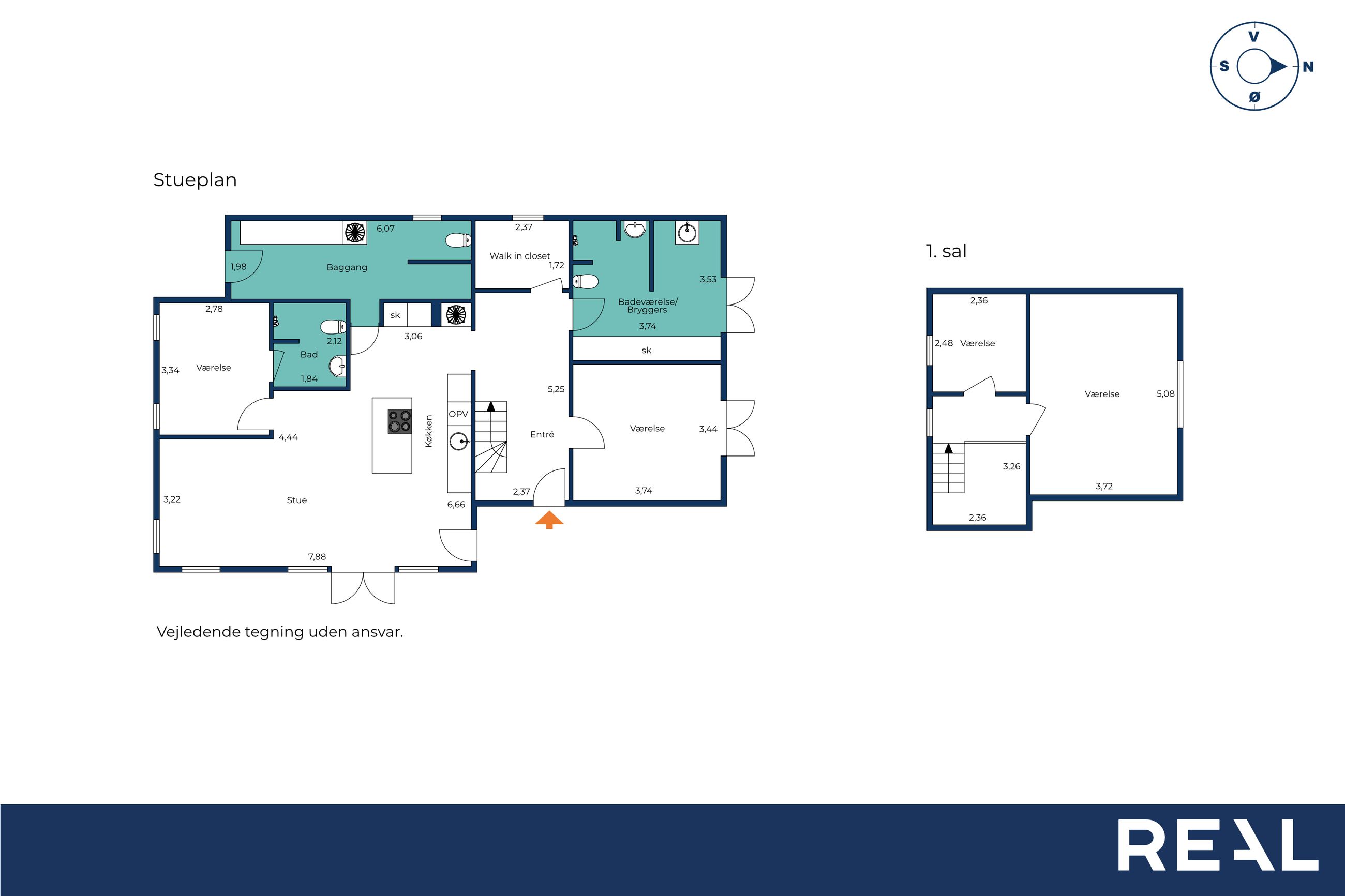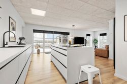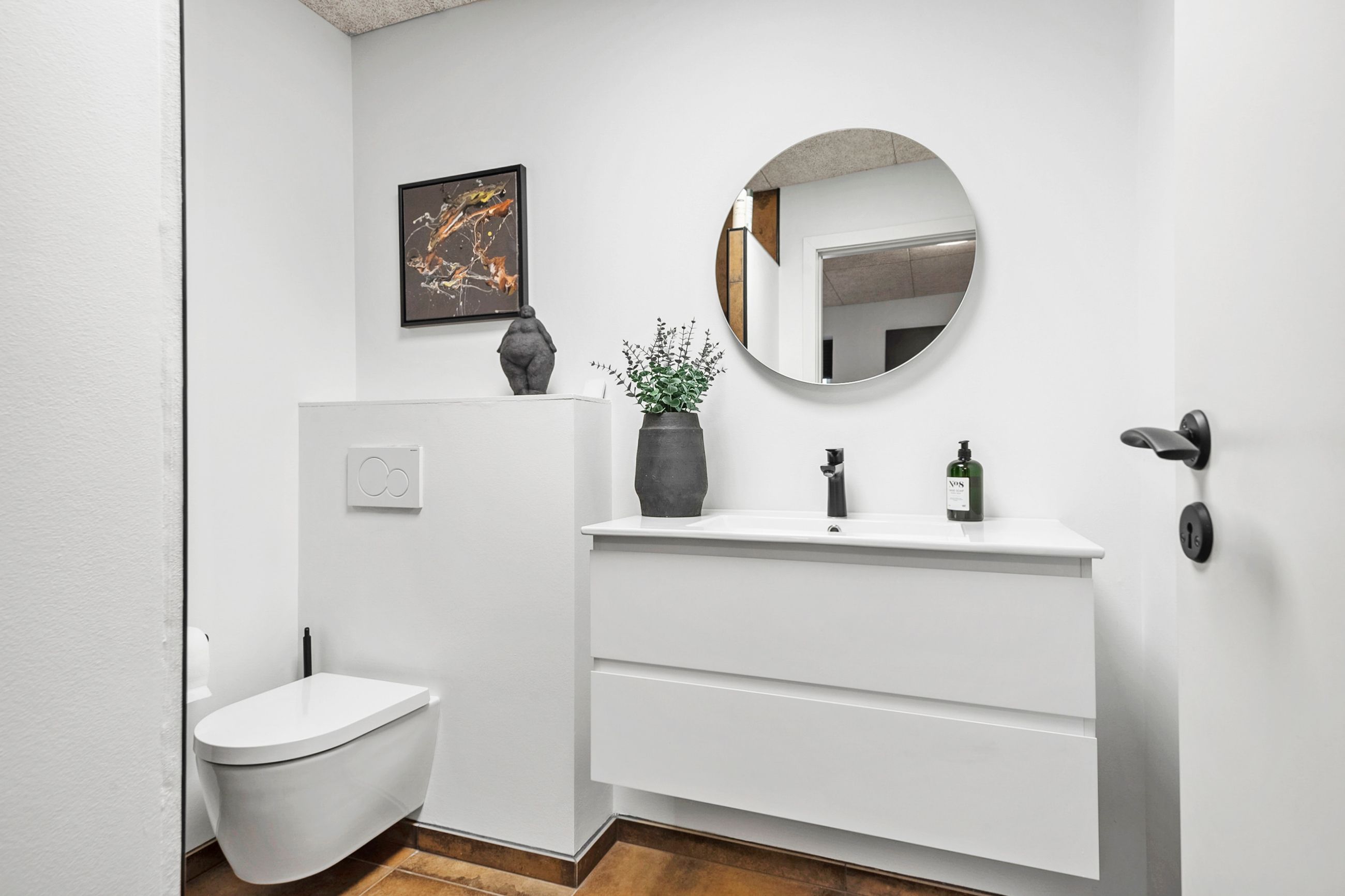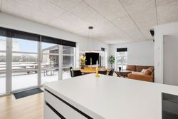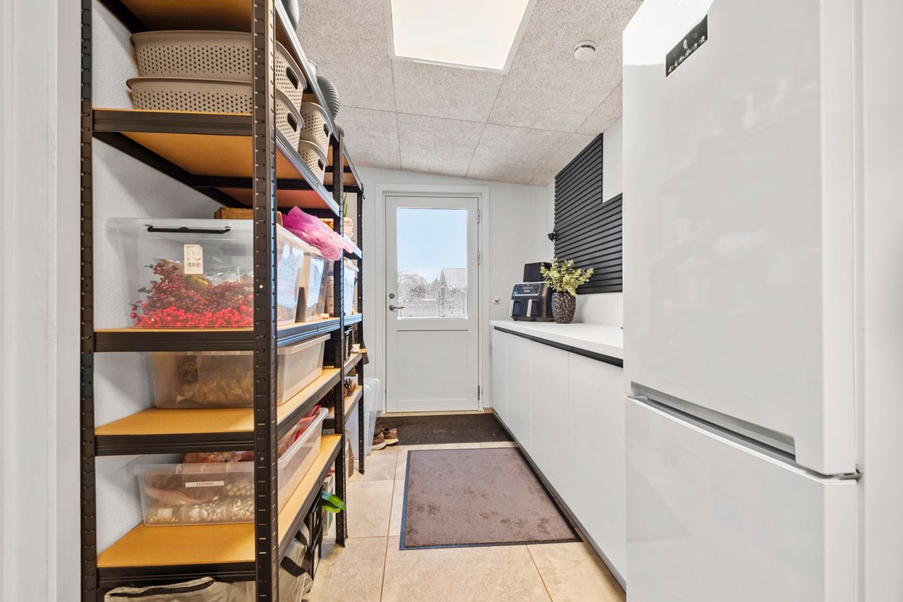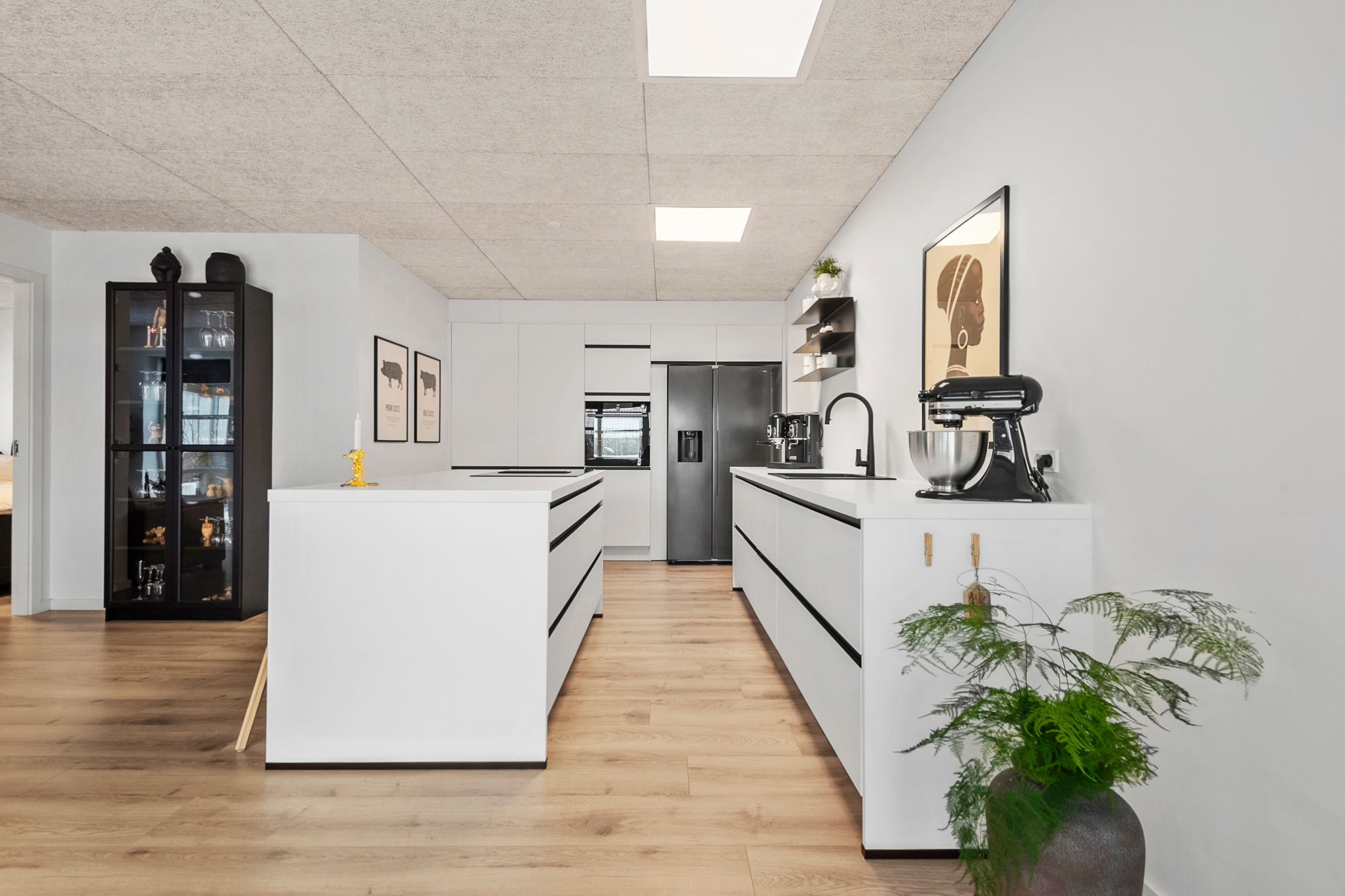 Det lyse og stilfulde køkken er indrettet med en stor kogeø og har en naturlig og åben forbindelse til spise- og opholdsstuen. De store vinduespartier sikrer et fantastisk lysindfald, som skaber en indbydende og luftig atmosfære. I forlængelse af køkkenet findes desuden et super anvendeligt og praktisk bryggers/andenrum, integreret i boligens daglige funktion. I stueplan findes også forældreafdelingen, med soveværelse og dertilhørende badeværelse i samme moderne stil.