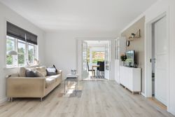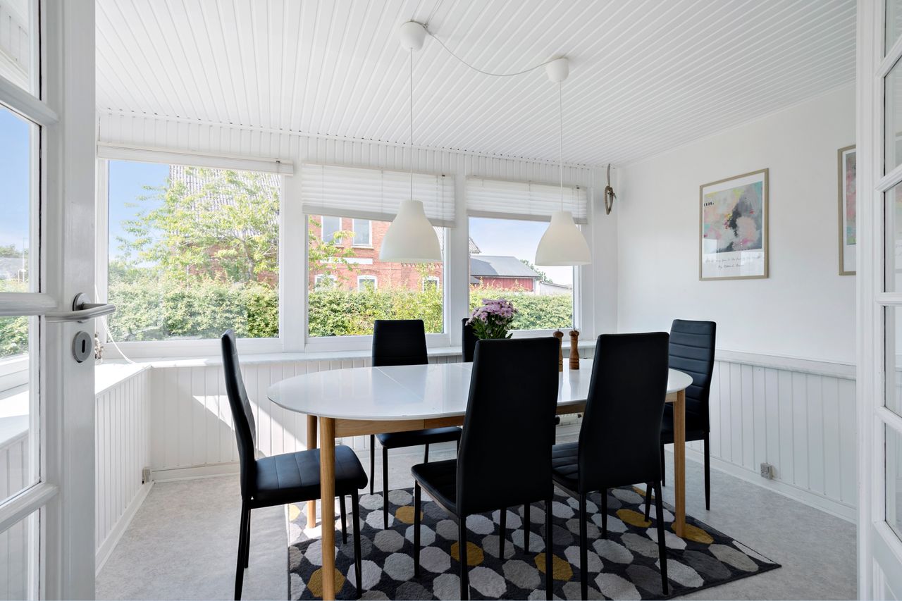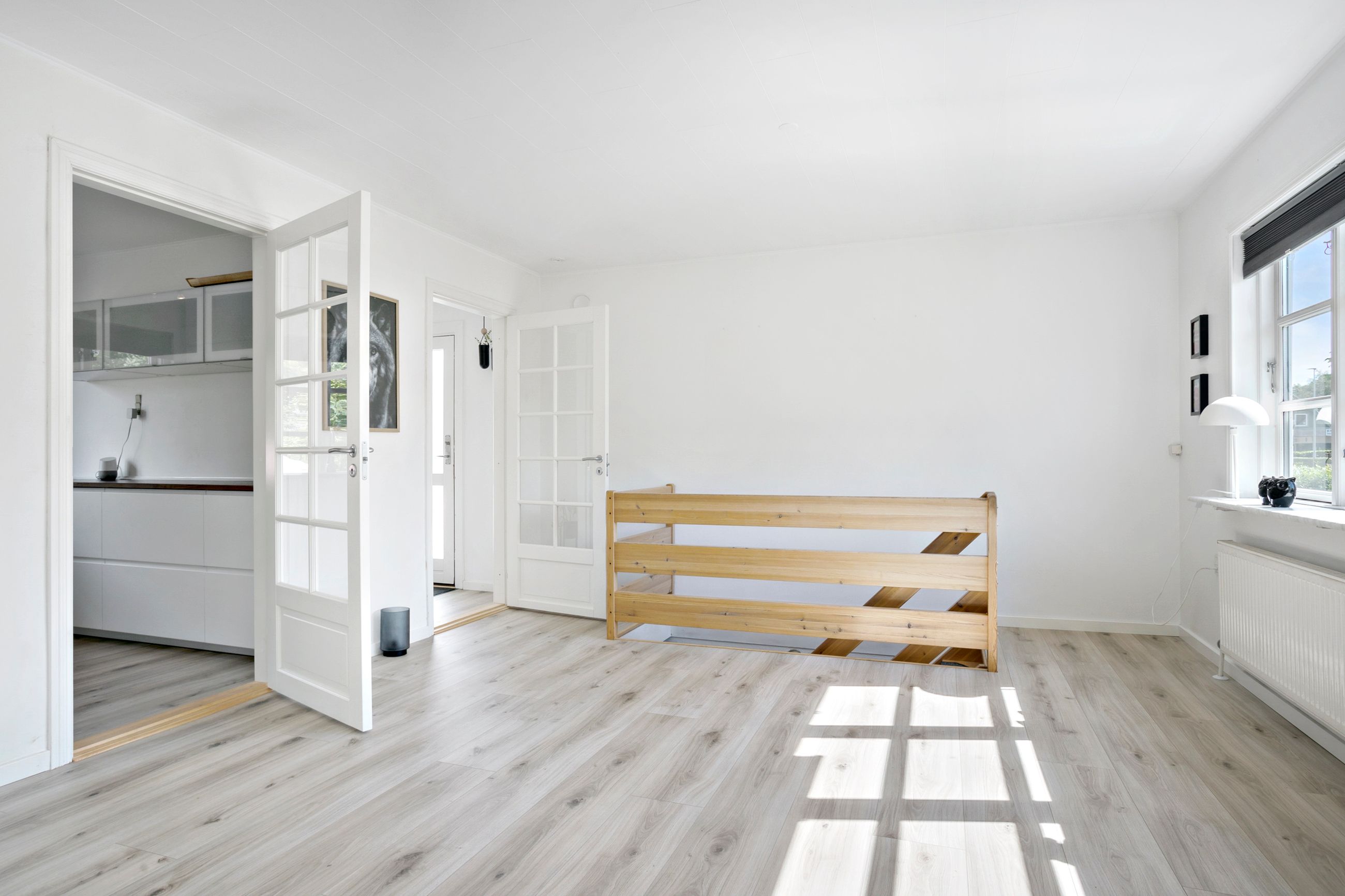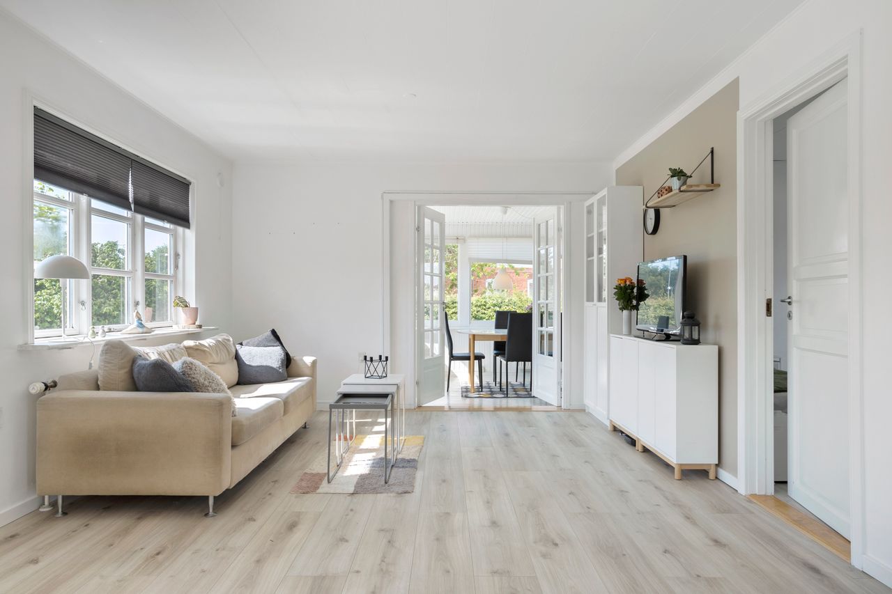 Her er god plads til både spisestue og sofaarrangement. Herfra er endvidere direkte adgang til en