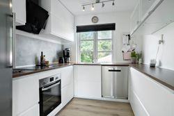 Et fint køkken som findes i åben forbindelse med stuen. Her er god plads til madlavningen og fine