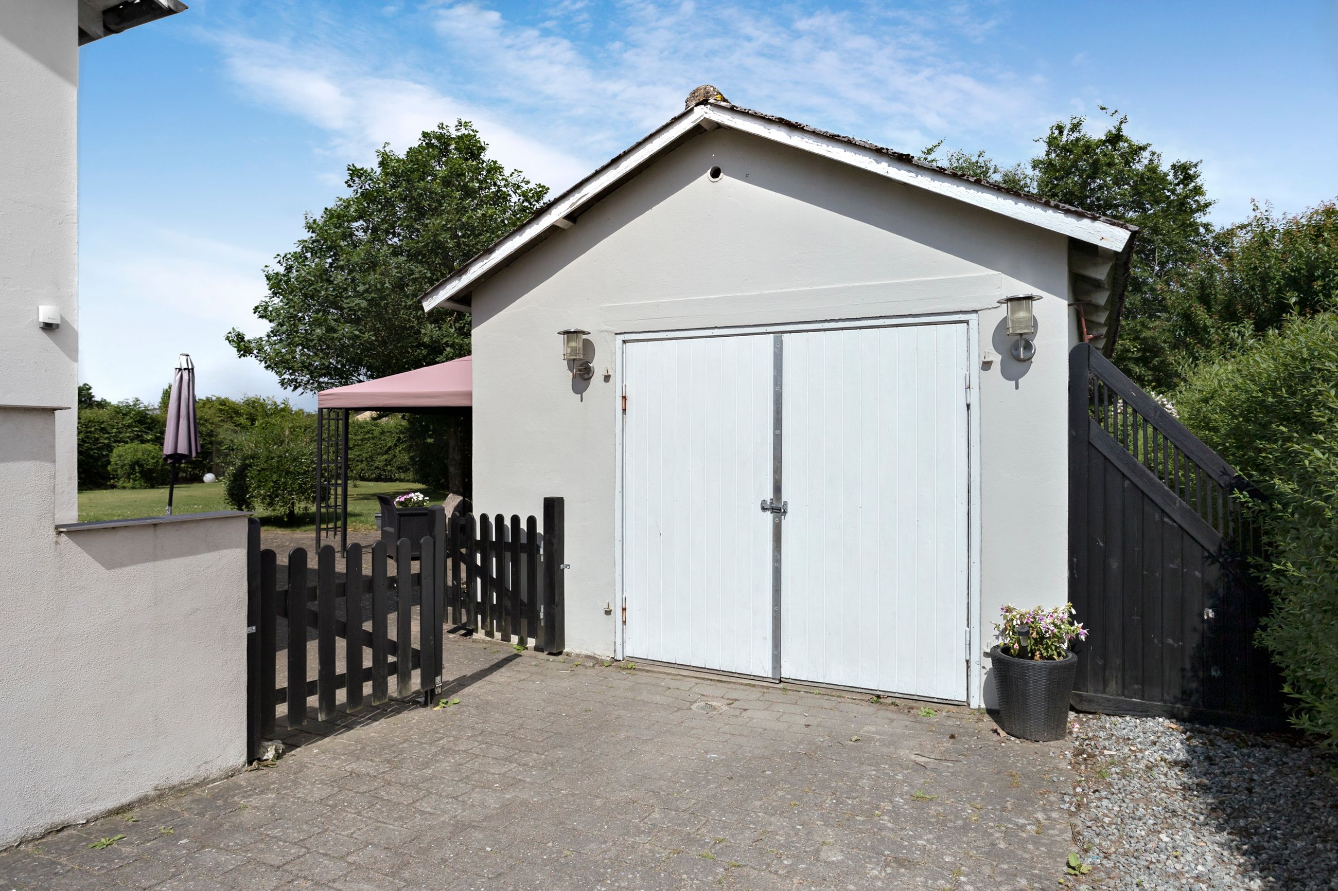 Ude findes en fin garage og en stor have.