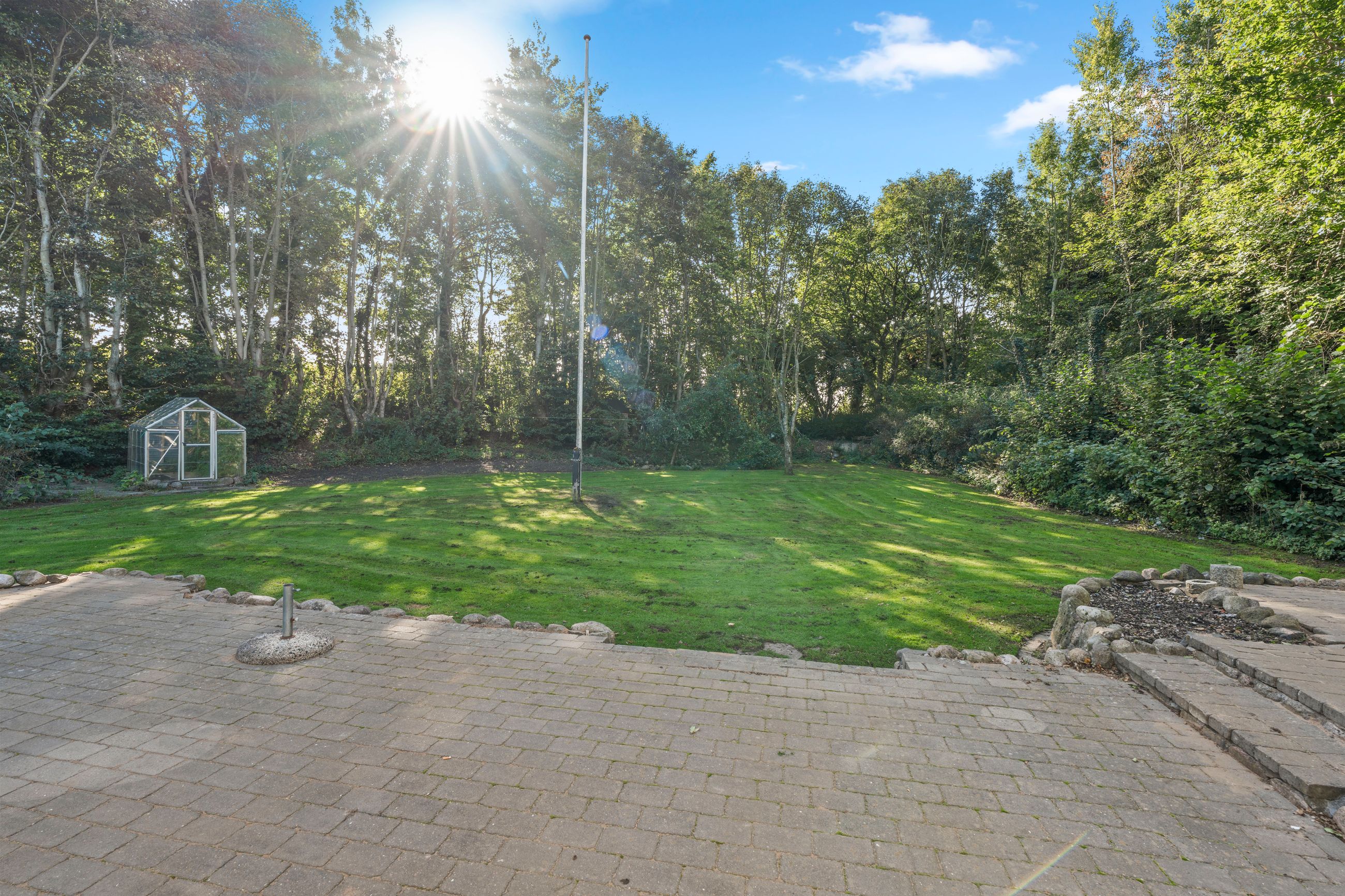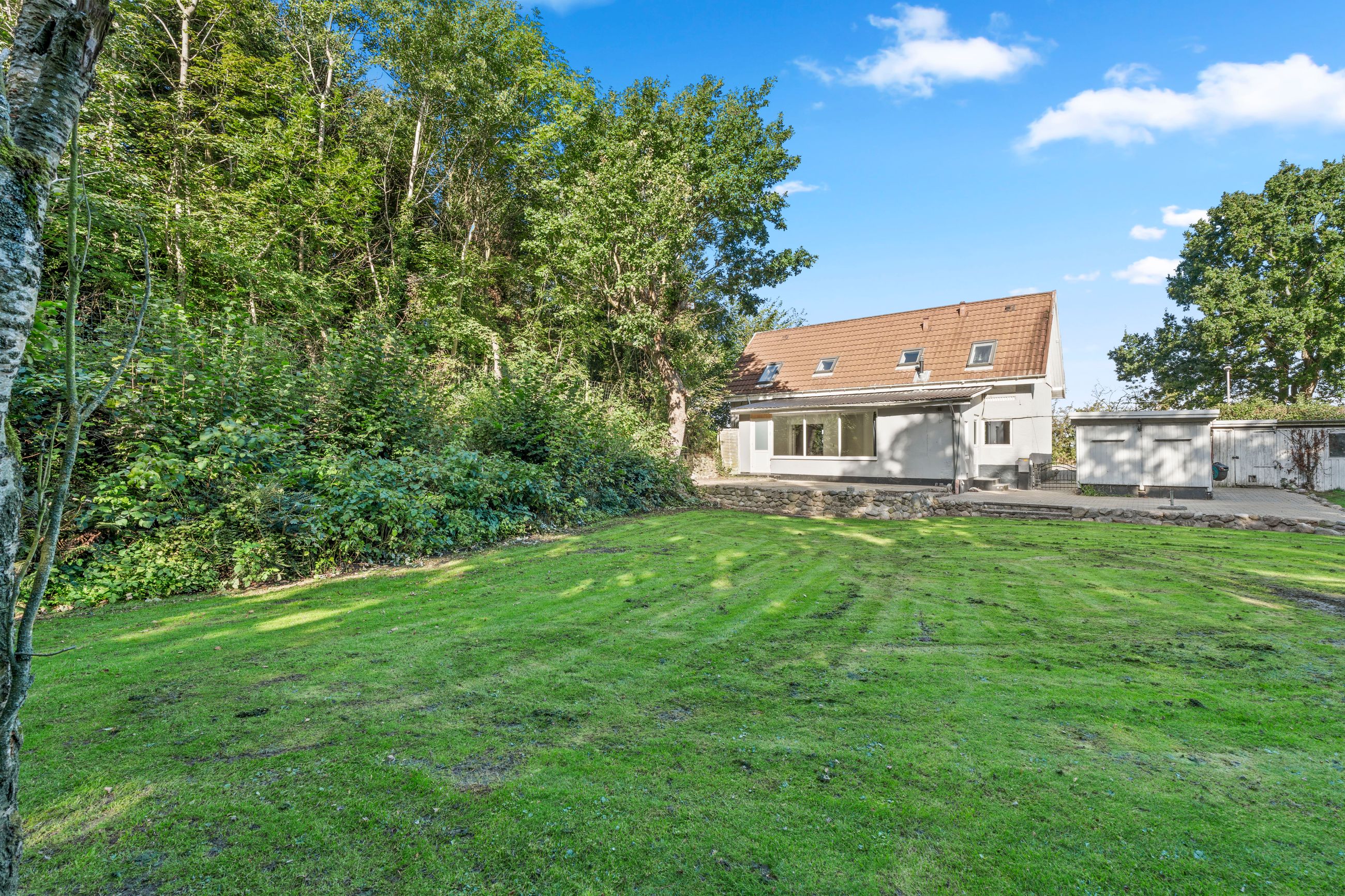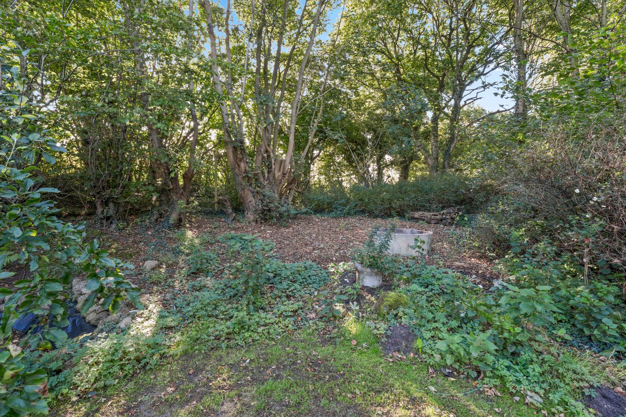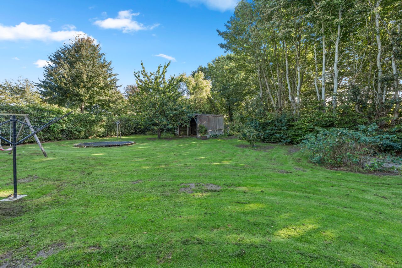 Grunden er på hele 1.236 m2 og byder på en fantastisk, nemt anlagt have med grønne plæner, blomsterbede og flere små hyggekroge. Den store plæne giver rig mulighed for leg og udendørs aktiviteter, mens terrassen indbyder til samvær med familie og venner. Hertil hører en carport på 38 m2.