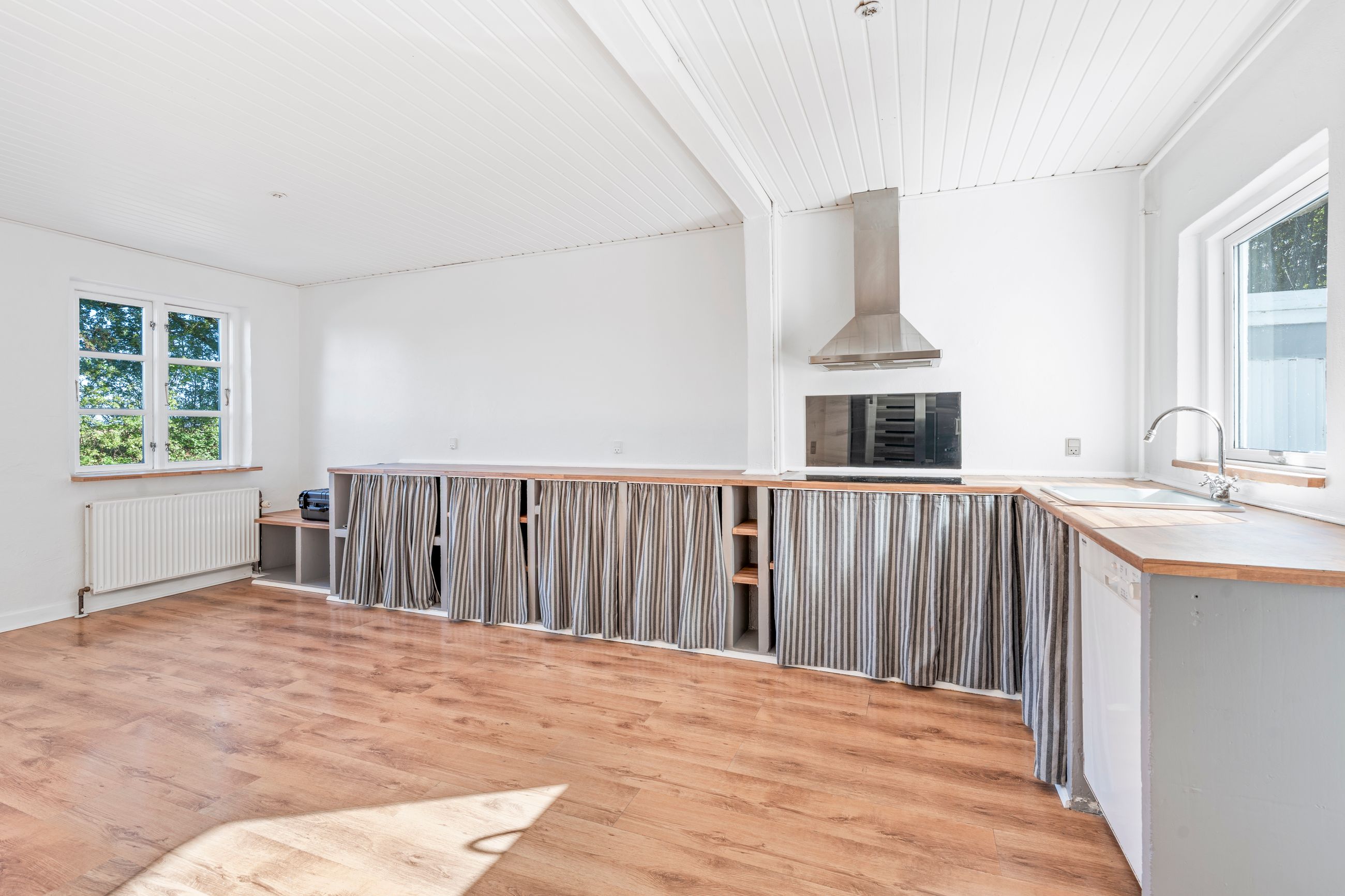 Indretningen er oplagt til familien, der ønsker plads og fleksibilitet. I stueplan finder du et lyst og indbydende køkken-alrum i åben forbindelse med stuen, hvor de store vinduespartier sørger for et behageligt lysindfald. Herfra er der adgang til en hyggelig udestue, som kan bruges året rundt. På førstesalen ligger husets værelsesafdeling med fire gode værelser og et badeværelse. I stueplan er der desuden mulighed for at etablere endnu et badeværelse, da installationerne allerede er forberedt.