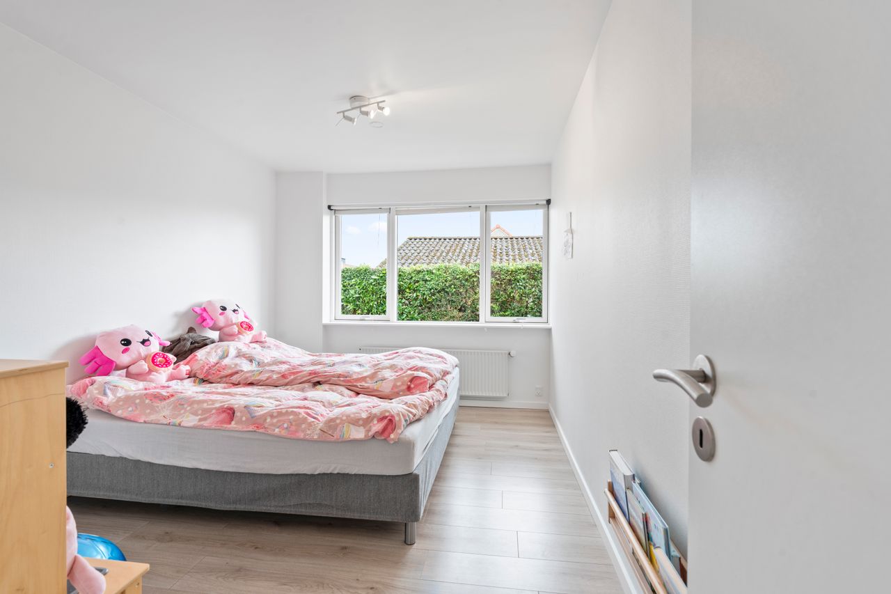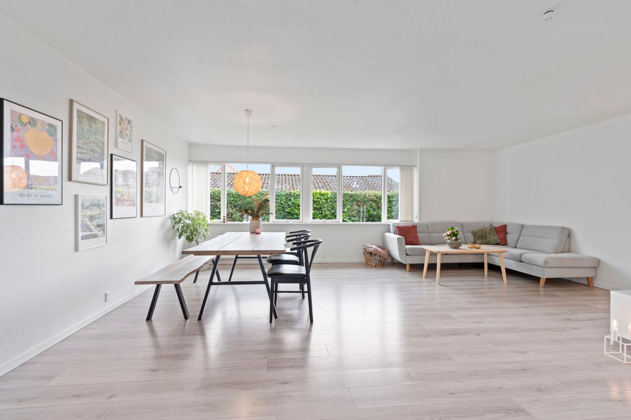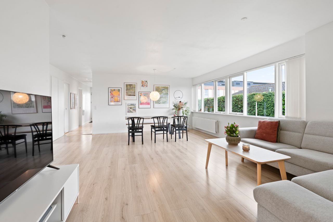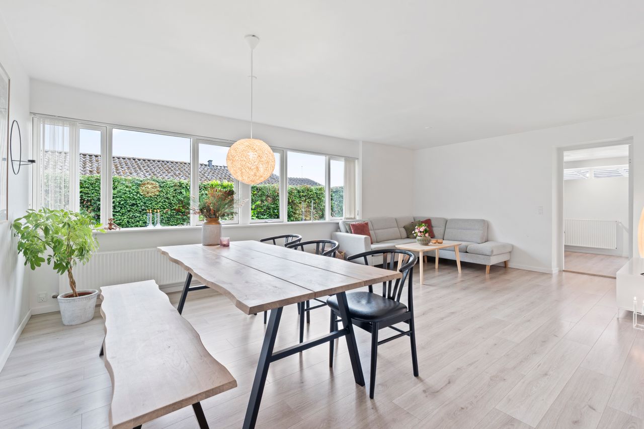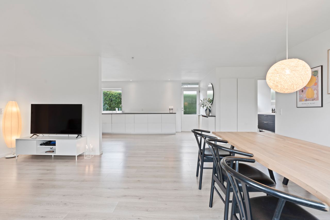 Planløsningen er gennemtænkt med separat forældre- og børneafdeling – perfekt til børnefamilien. I alt rummer boligen fire værelser, to badeværelser samt et stort, lyst og åbent køkken-alrum og stue i ét – husets naturlige samlingspunkt.
