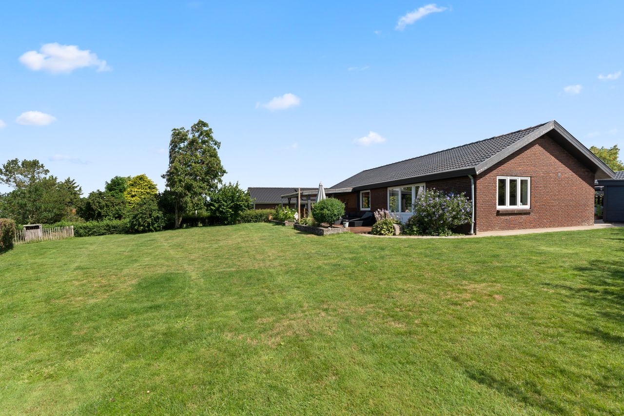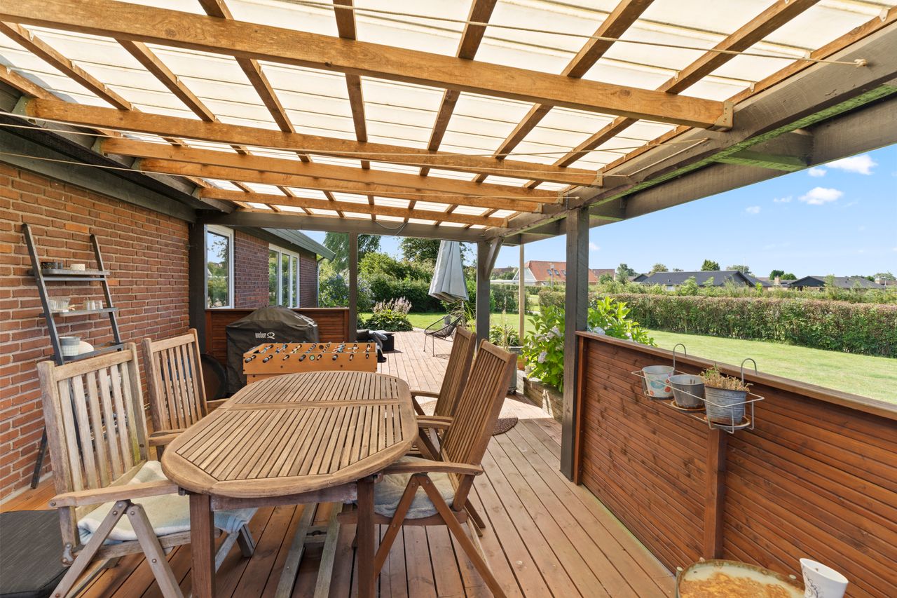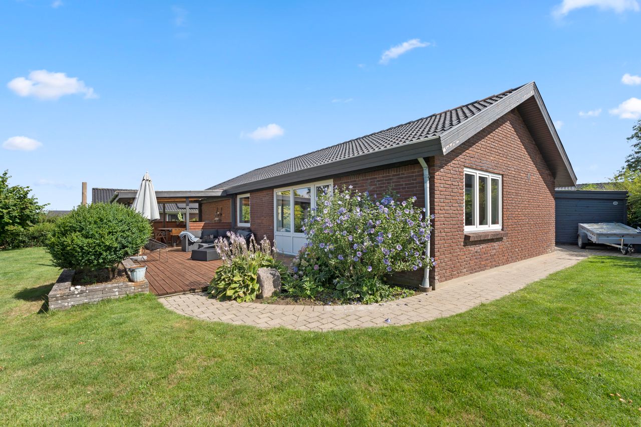 Fra køkken-alrummet er der direkte udgang til haven, som i sommerhalvåret fungerer som et ekstra leverum. Den store træterrasse har både eftermiddags- og aftensol, og herfra kan du nyde nogle af områdets smukkeste solnedgange. Haven er nem at holde, og bag hækken gemmer der sig en praktisk lille genvej – et hul i hækken giver hurtig adgang til busstoppestedet kun 100 meter væk.