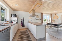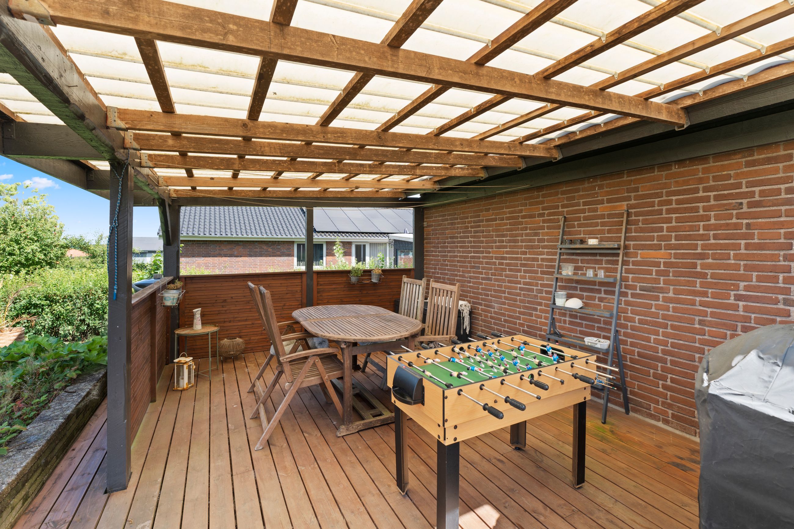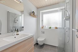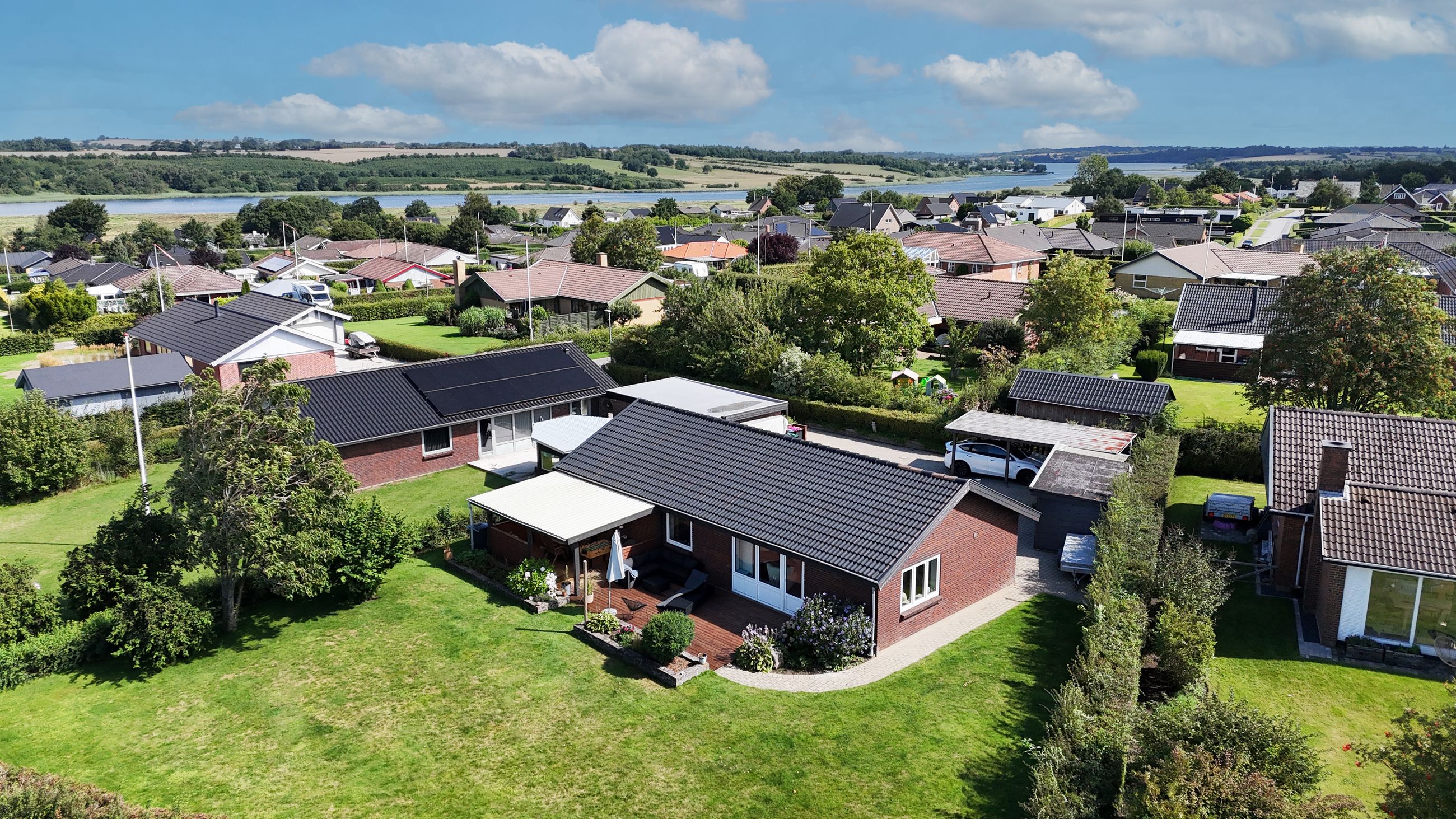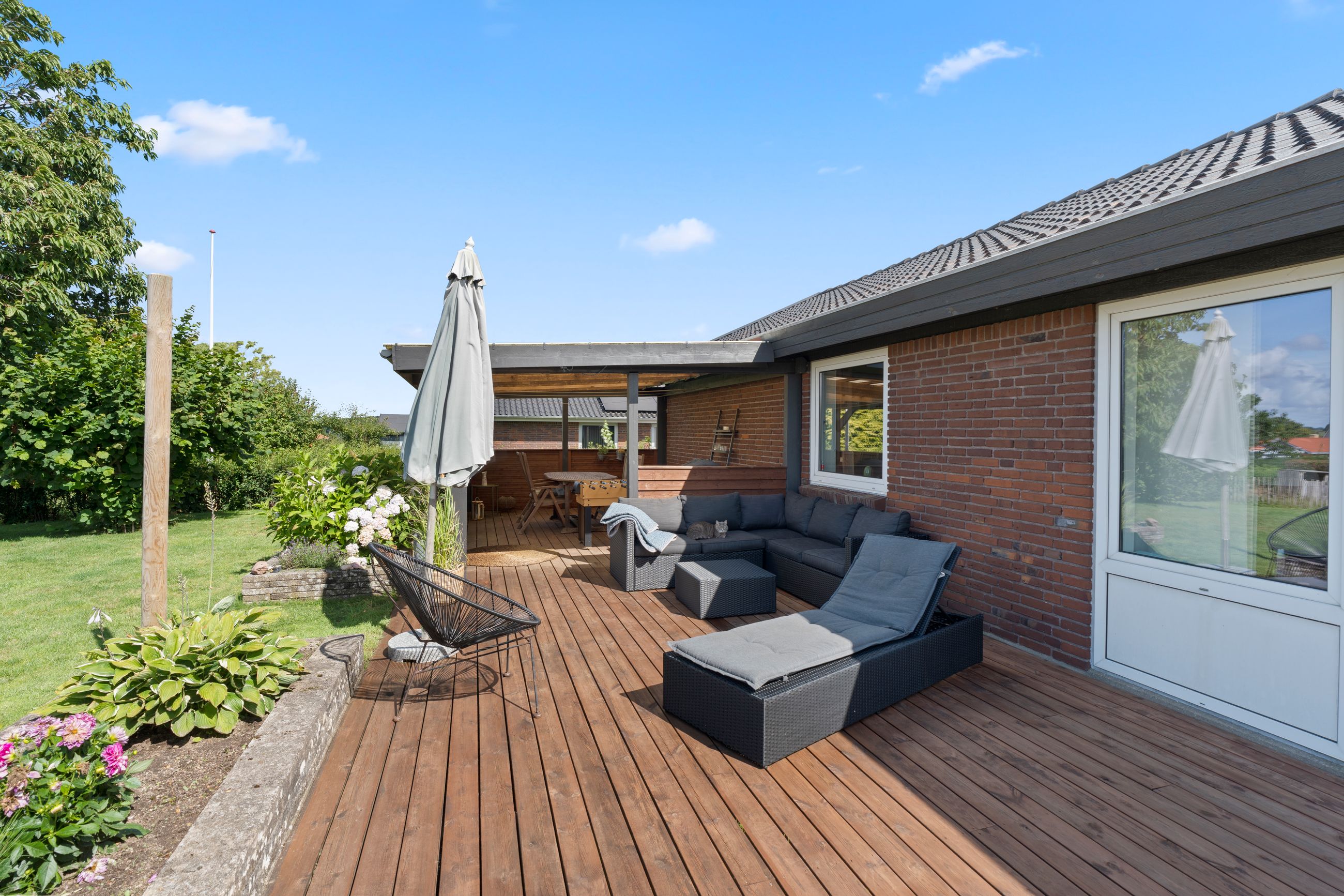 Fra køkken-alrummet er der direkte udgang til haven, som i sommerhalvåret fungerer som et ekstra leverum. Den store træterrasse har både eftermiddags- og aftensol, og herfra kan du nyde nogle af områdets smukkeste solnedgange. Haven er nem at holde, og bag hækken gemmer der sig en praktisk lille genvej – et hul i hækken giver hurtig adgang til busstoppestedet kun 100 meter væk.
