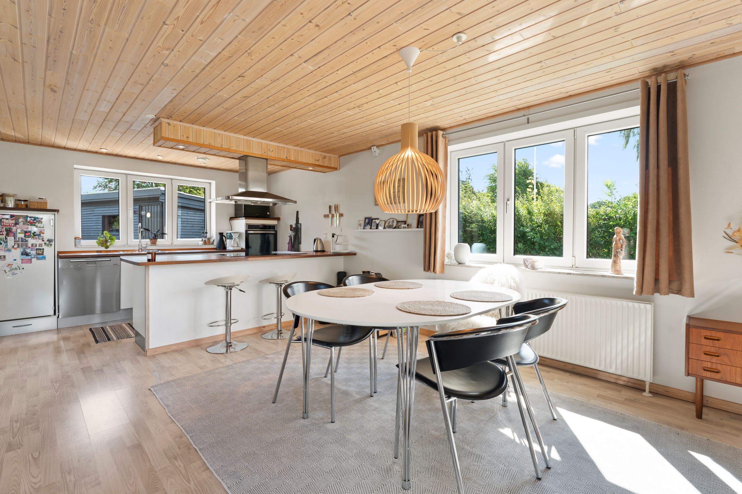 Ejendommen er opført i 1980 og rummer 104 meget veludnyttede kvadratmeter, fordelt på ét plan. Det store leverum – stue og køkken i ét – har et skønt lysindfald fra hele tre sider, hvilket skaber en helt særlig atmosfære. Det er et rum, man får lyst til at opholde sig i – uanset årstiden. Netop dét kombineret med boligens størrelse og indretning giver en charmerende "sommerhusvibe" hele året rundt.