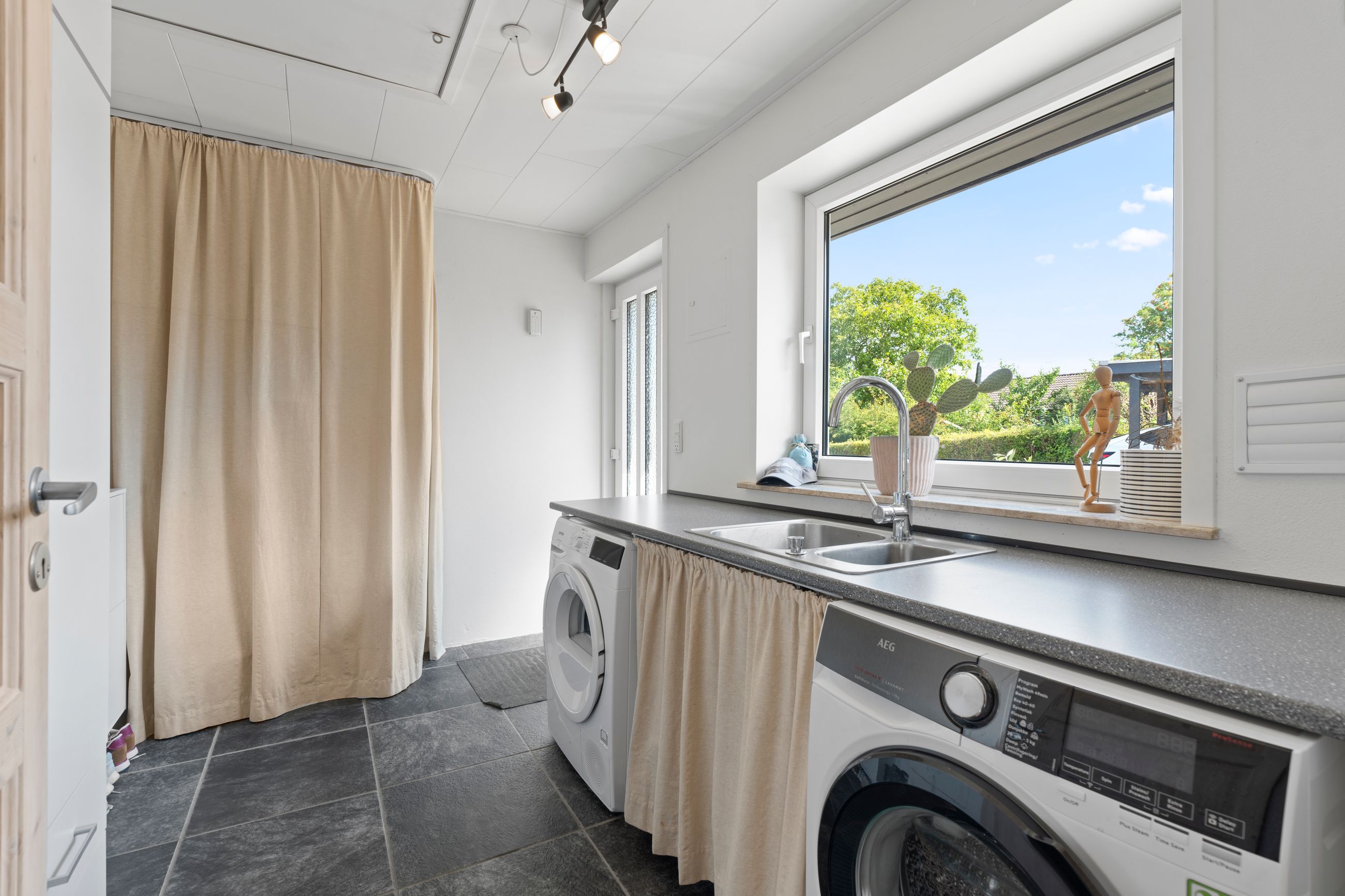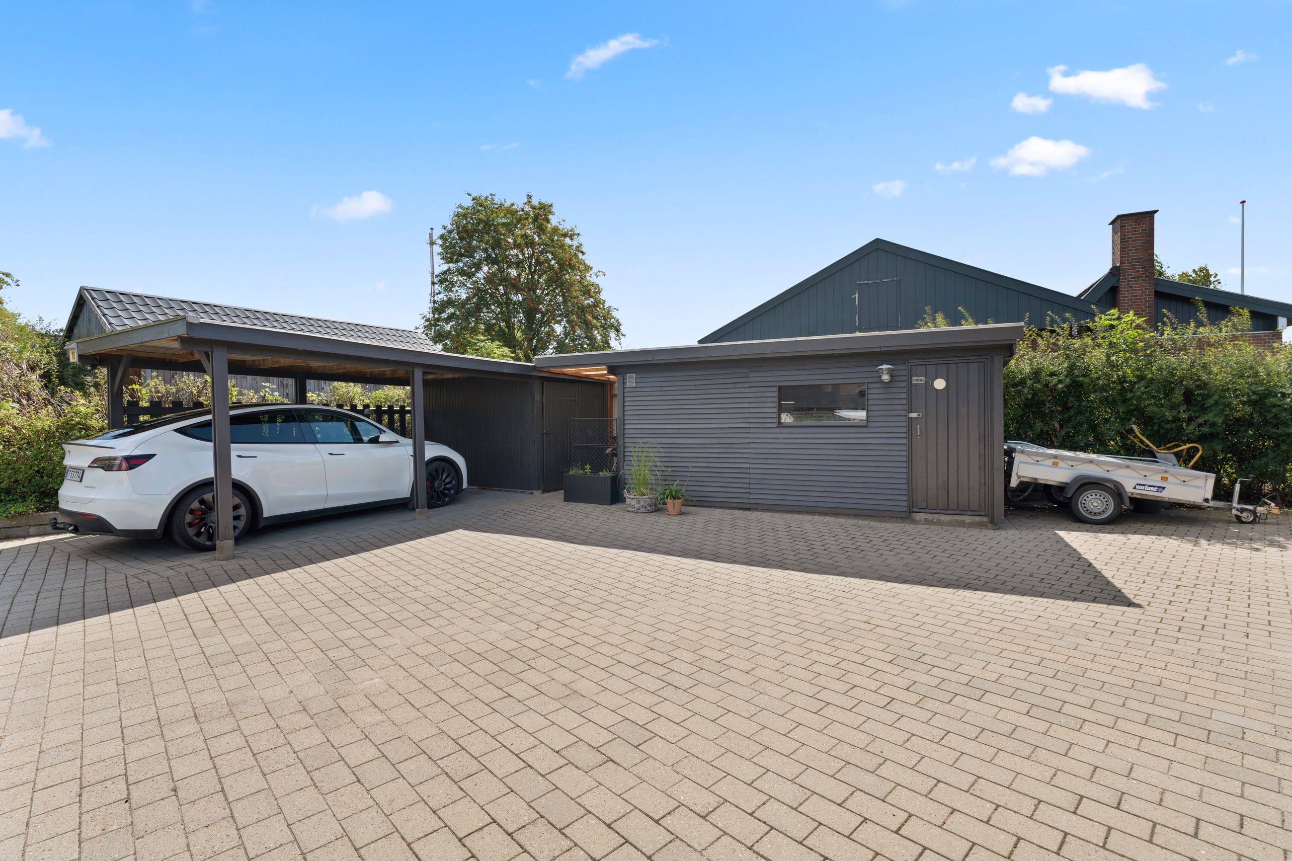 Indkørslen er noget for sig. Da børnene var små, blev den brugt som cykelbane med forhindringer og kridttegninger – og i dag er der plads til både egne og venners biler (op til seks biler uden problemer!). Dertil kommer en carport på 19 m2 samt et skur på 13 m2.