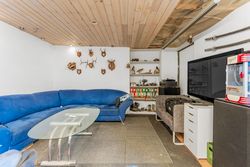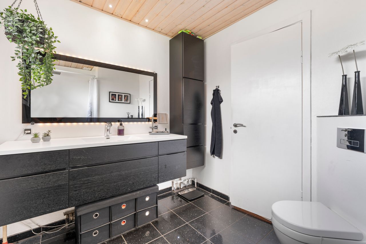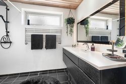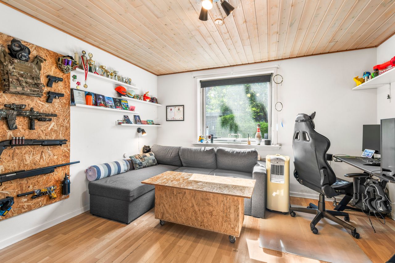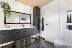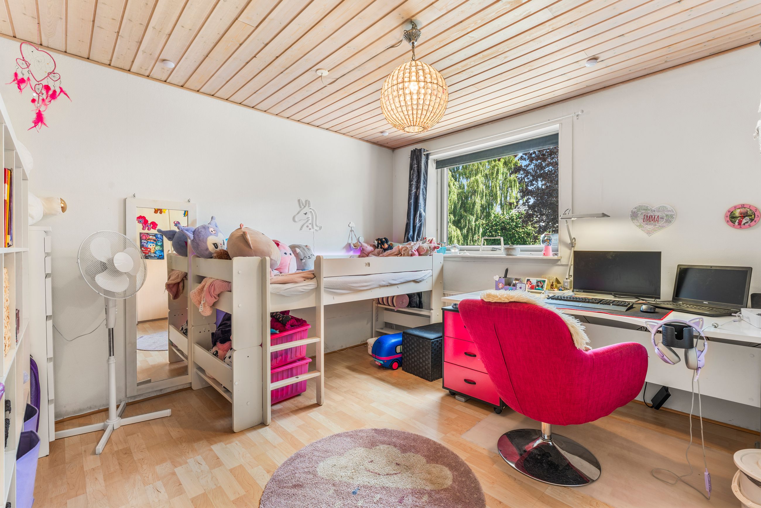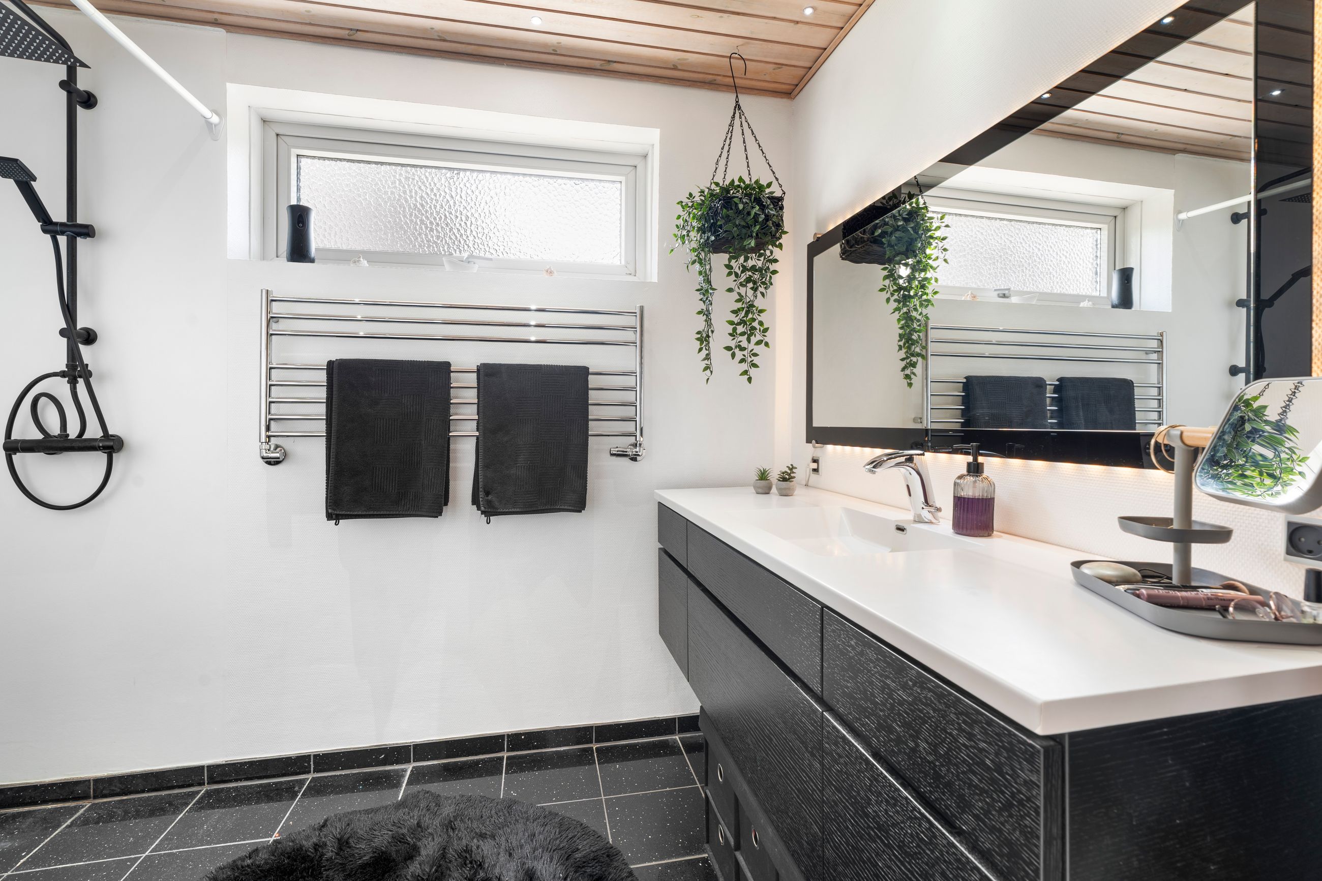 Stuen ligger i åben forbindelse med alrummet og giver rig mulighed for både sofa- og spiseområde. Badeværelset, der blev renoveret i 2013, er placeret praktisk i forhold til værelserne og fremstår moderne og indbydende.