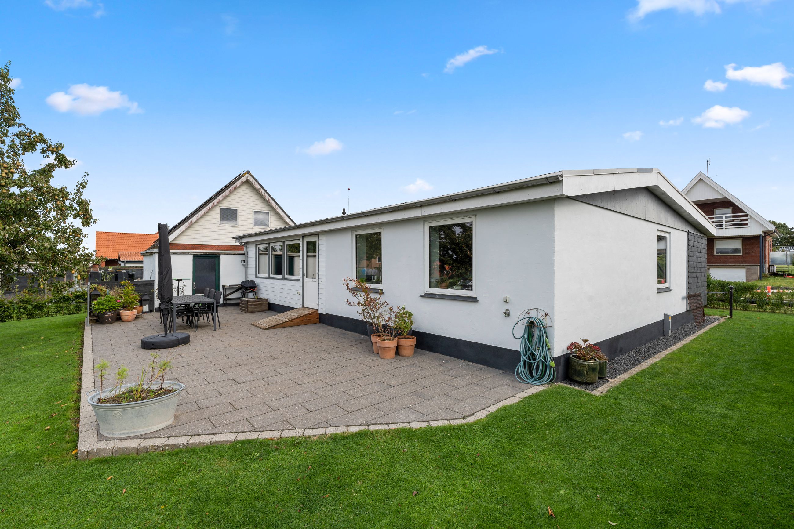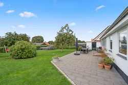 Boligen byder desuden på et praktisk bryggers, som gør hverdagen lettere med vaskefaciliteter og god opbevaringsplads. Udenfor finder du en 25 kvadratmeter stor garage, som både rummer plads til bilen og ekstra opbevaring. Til huset hører også en dejlig terrasse, hvor du kan nyde solens stråler dagen igennem og indrette med loungemøbler eller grillhjørne. Herfra er der direkte adgang til haven, som byder på masser af plads til leg, boldspil og små oaser, hvor du kan trække dig tilbage og slappe af.