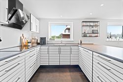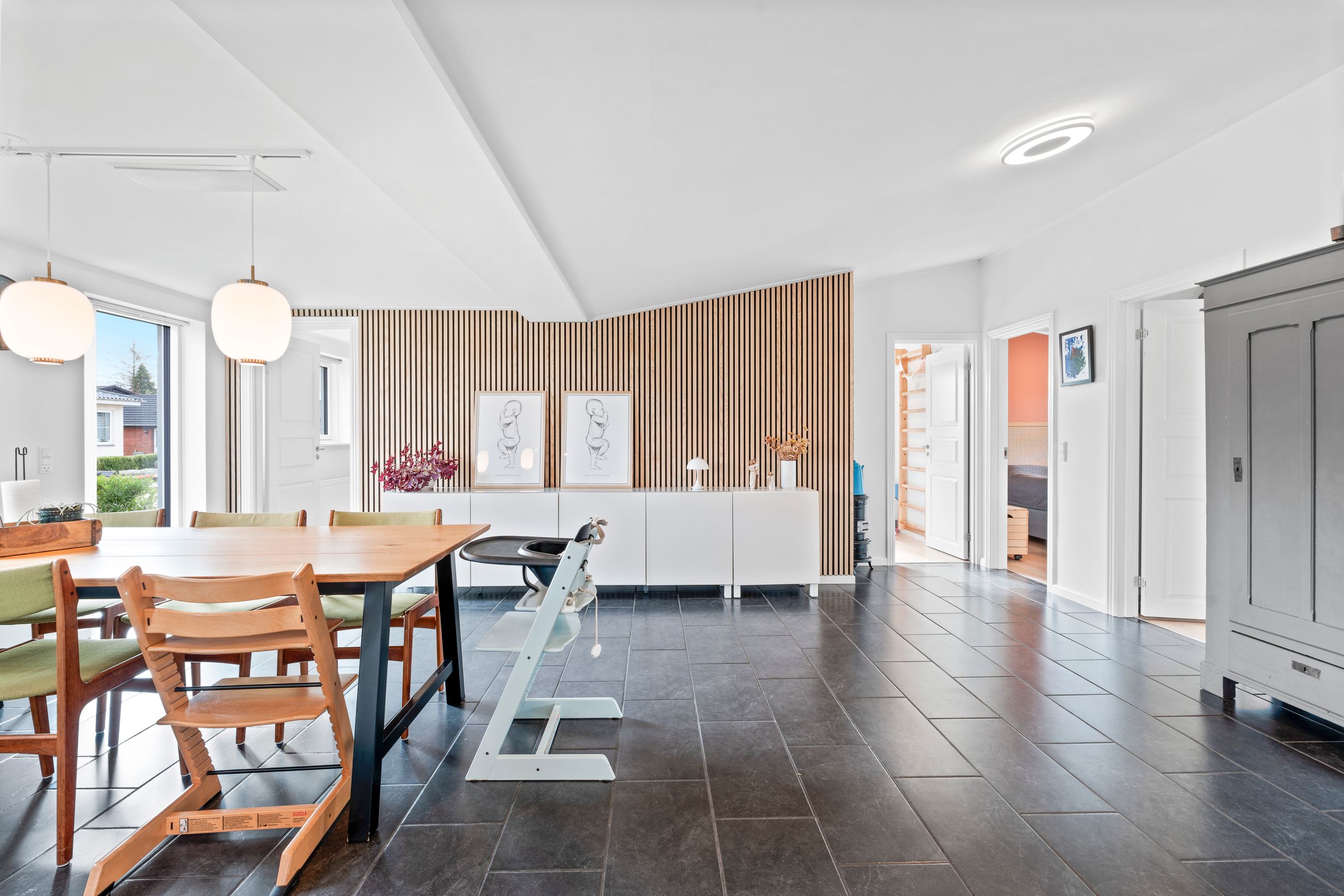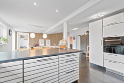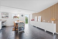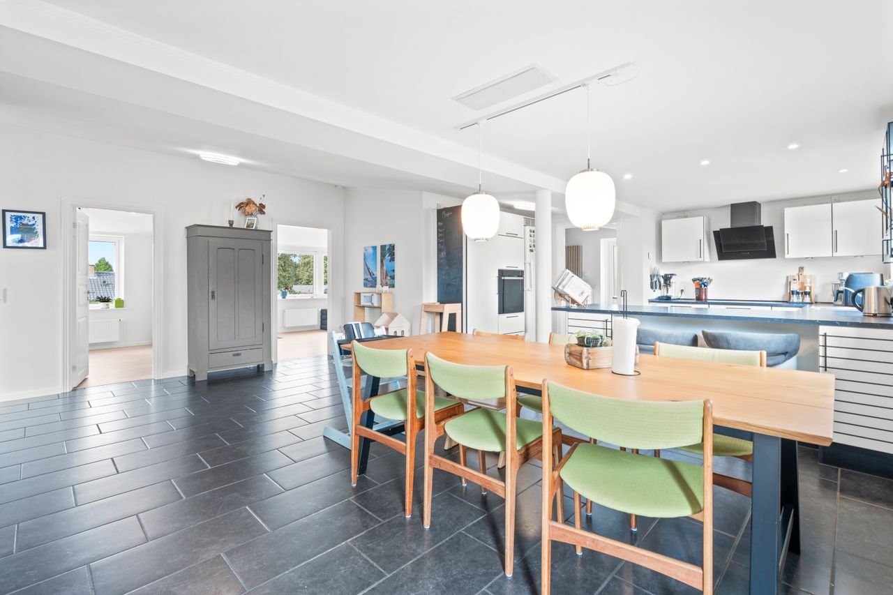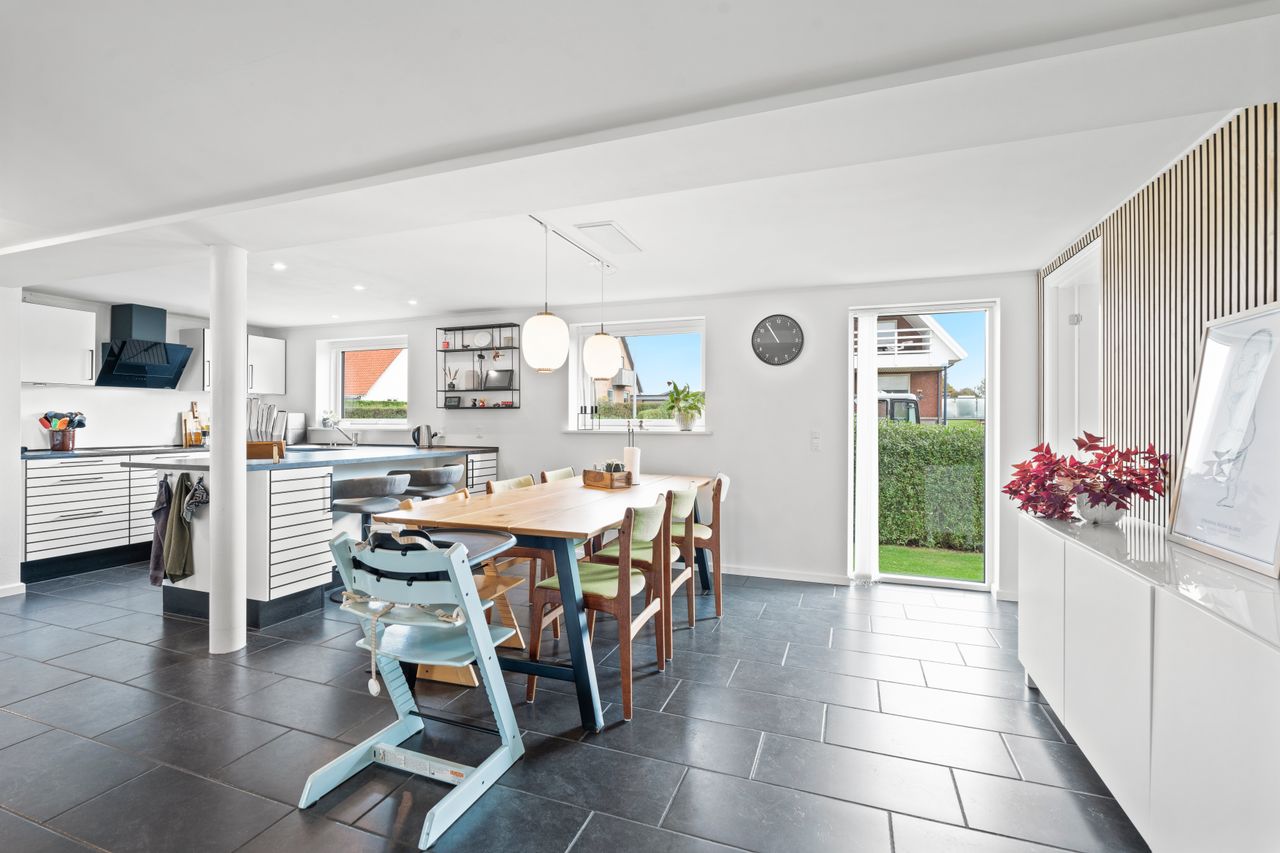 Husets hjerte er det store, lyse køkken-alrum, hvor der er masser af bord- og skabsplads til den madglade familie og samtidig god plads til spisebordet, hvor hverdagen samles. Herfra er der åben forbindelse til den hyggelige stue, der giver en behagelig atmosfære med plads til både sofaarrangement og tv-hygge. De store vinduespartier sørger for et flot lysindfald, som gør rummene endnu mere indbydende.