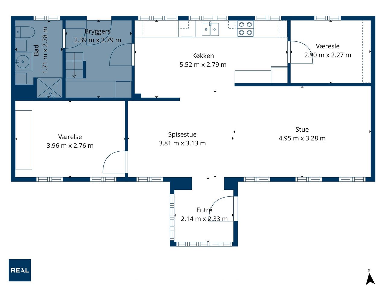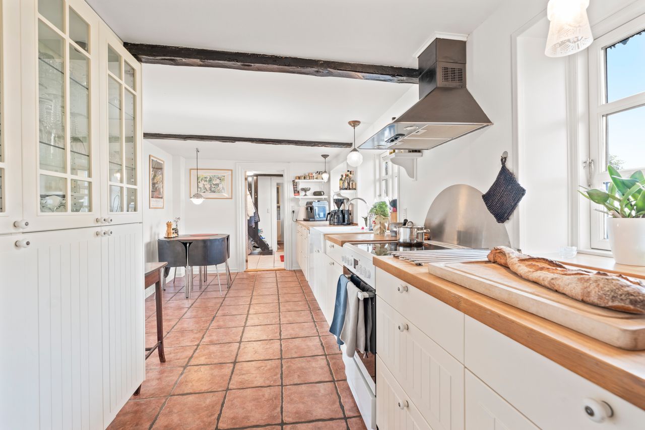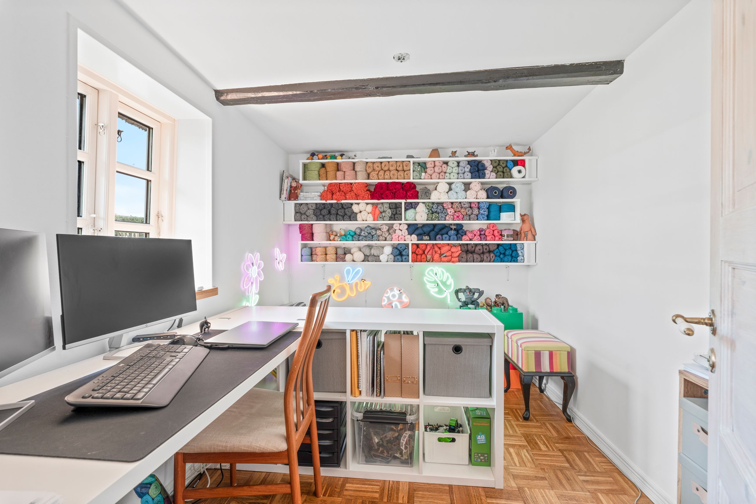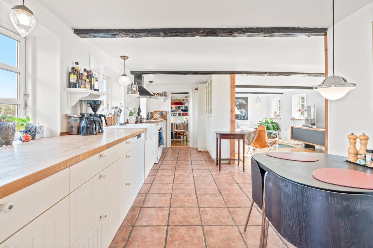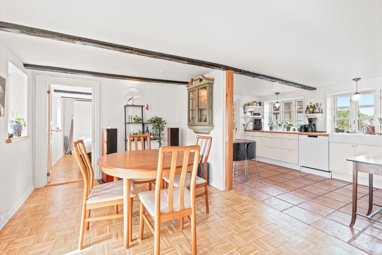 Fra køkken og stue er der et behageligt lysindfald og kig til den store grund, hvor der er god plads til både leg, dyr og udeliv. Ejendommen rummer desuden mulighed for at udnytte førstesalen, hvis du ønsker ekstra værelser eller et kontor med udsigt over landskabet.