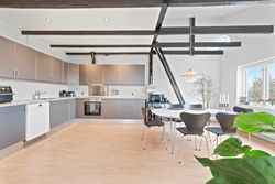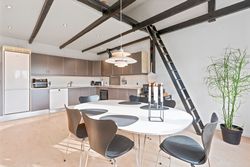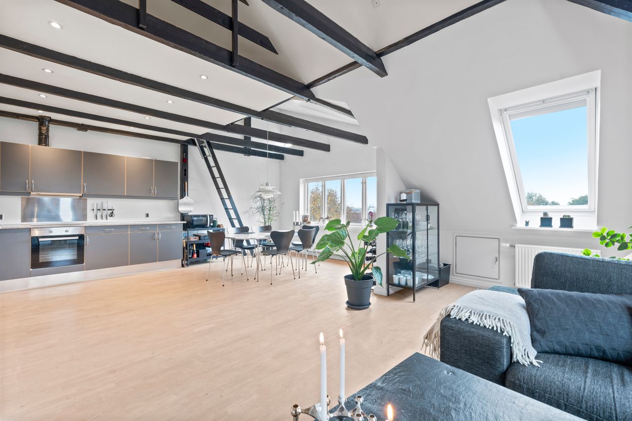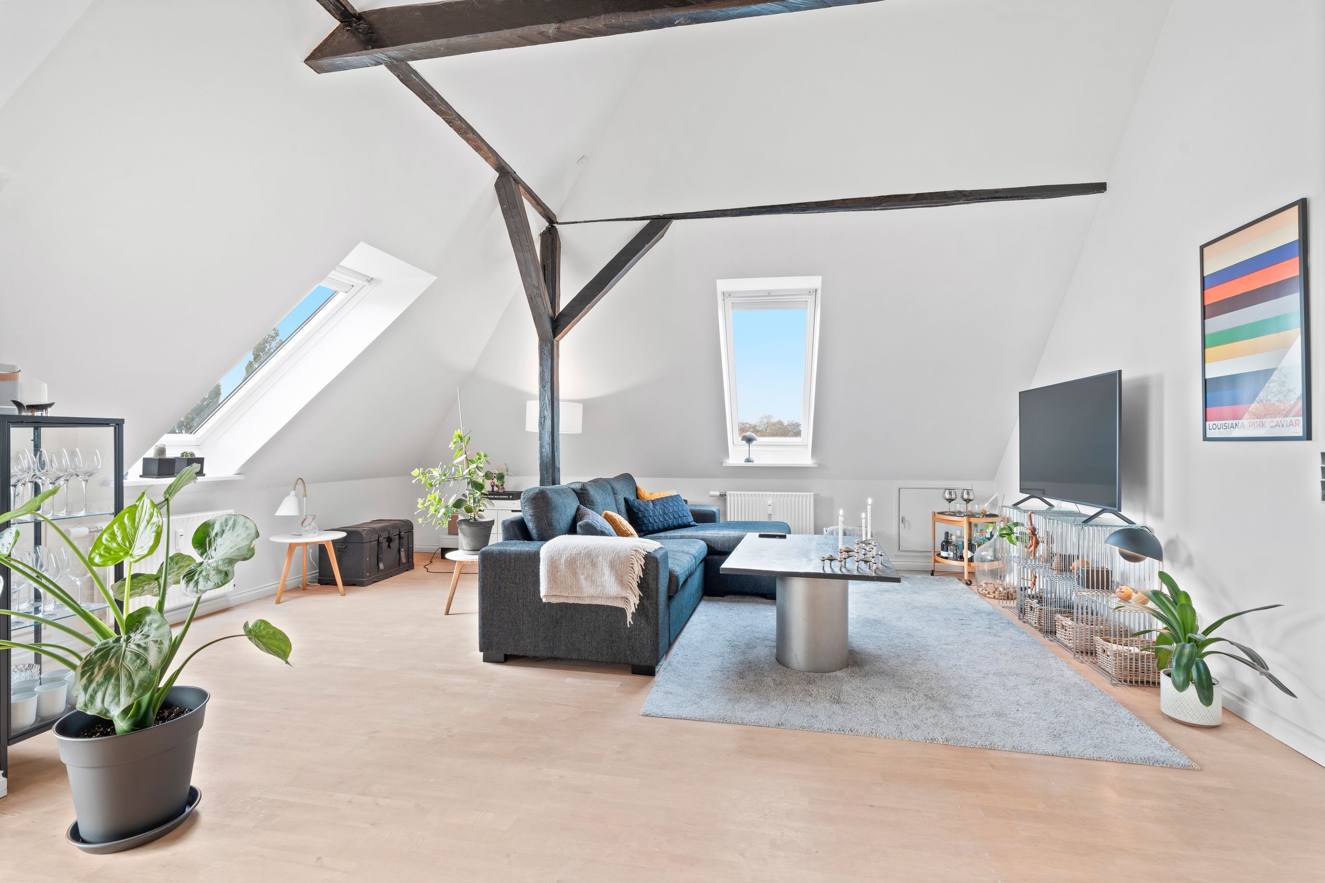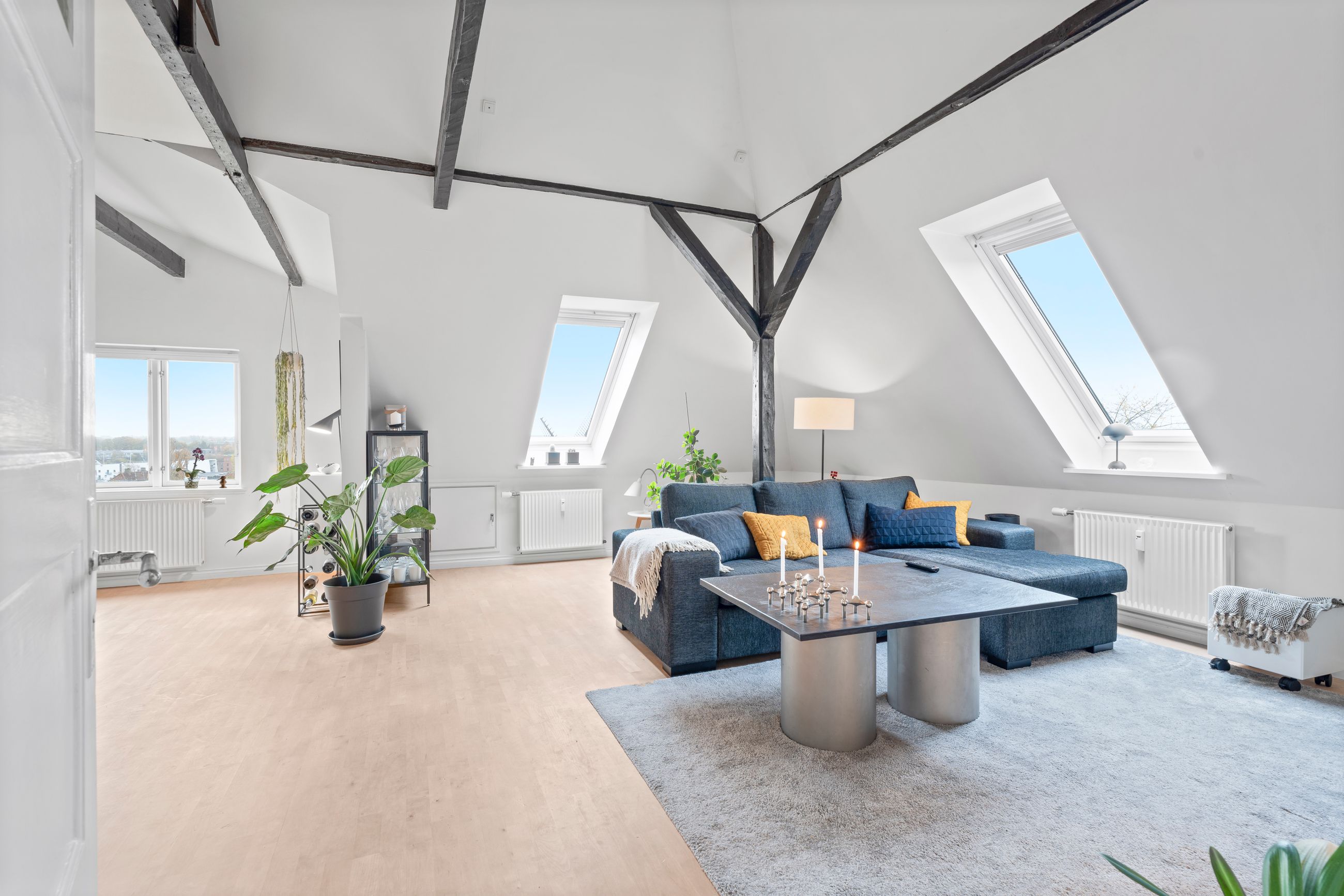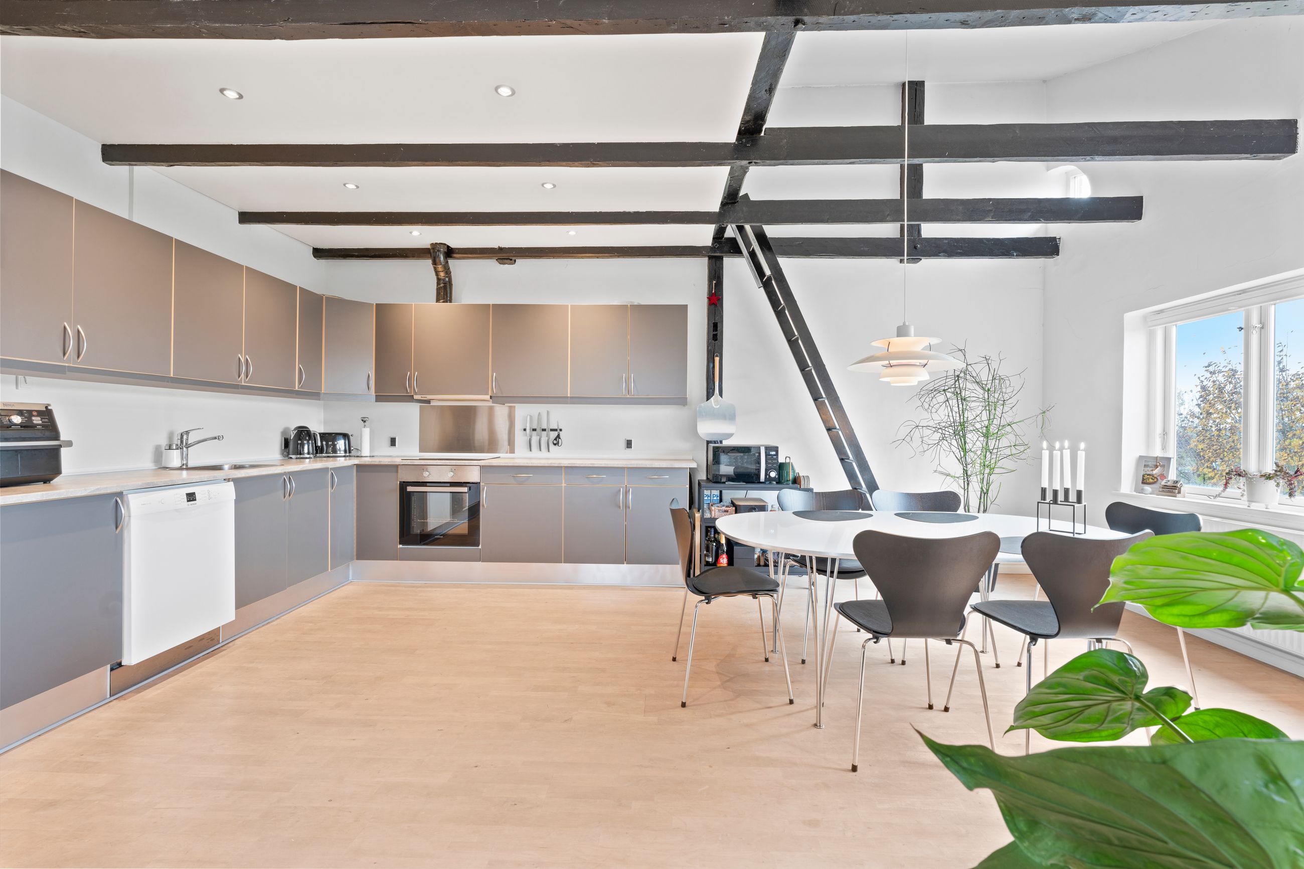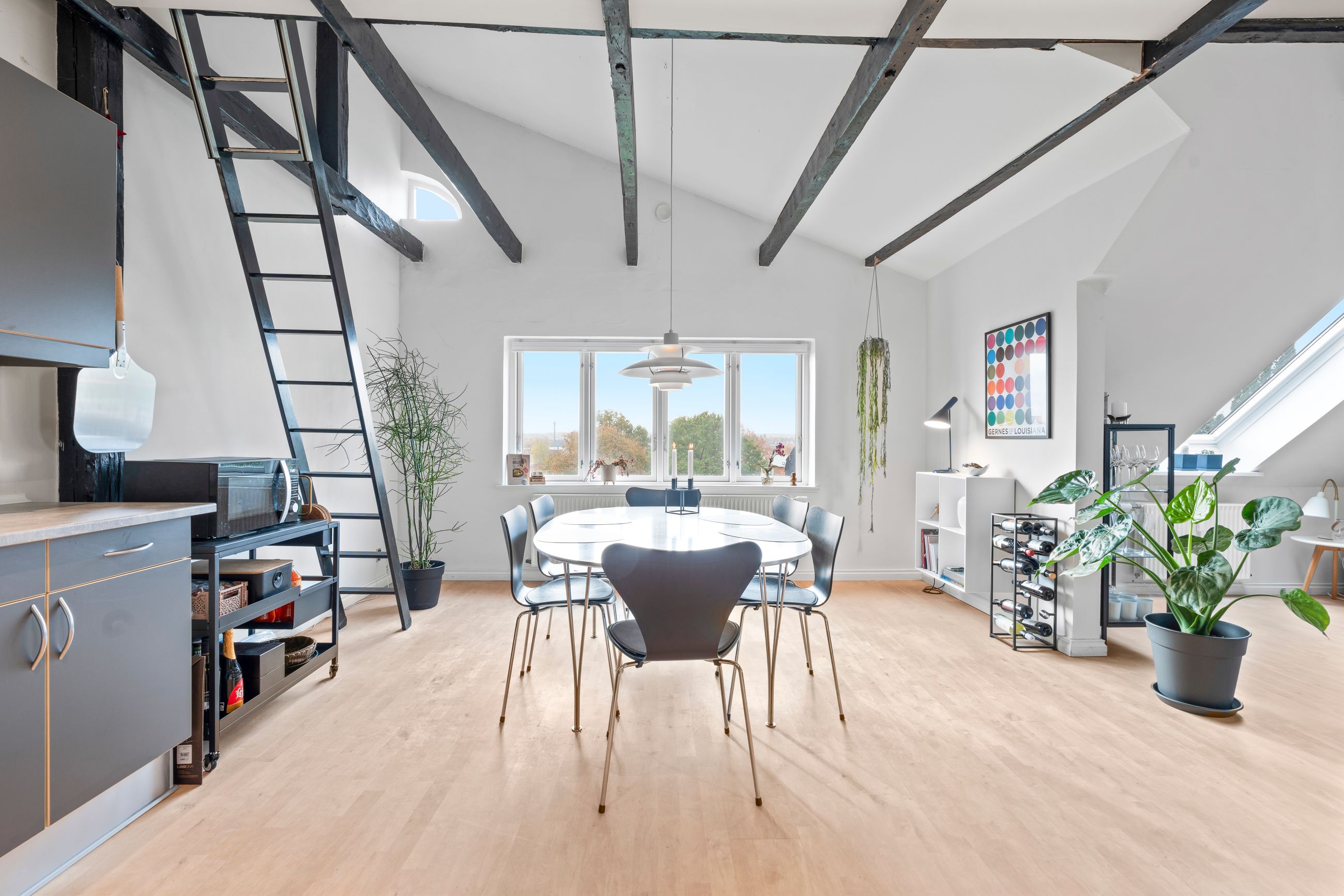 Lejligheden byder på en gennemtænkt planløsning med en rummelig entré, der åbner sig mod et imponerende køkken-alrum med højt til loftet, synlige bjælker og masser af naturligt lys. Her er god plads til både spisebord og sofaafdeling, og rummet fungerer som lejlighedens naturlige samlingspunkt med en varm og hyggelig atmosfære.