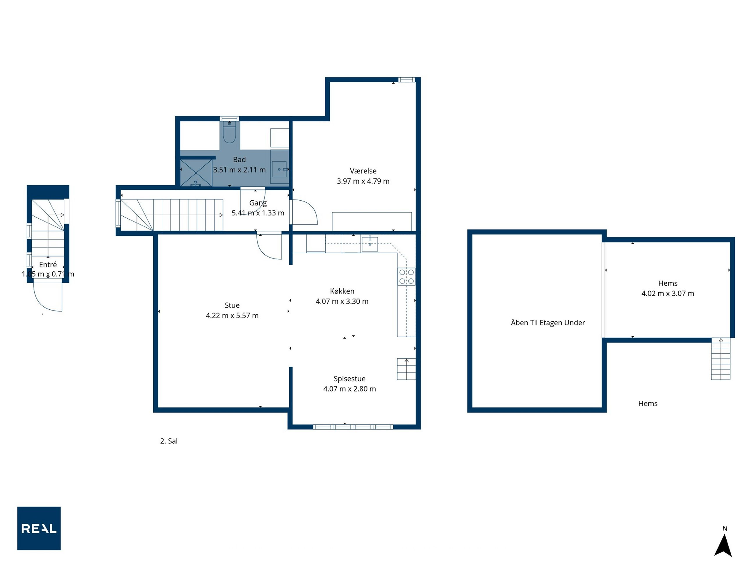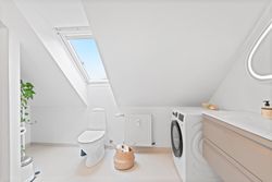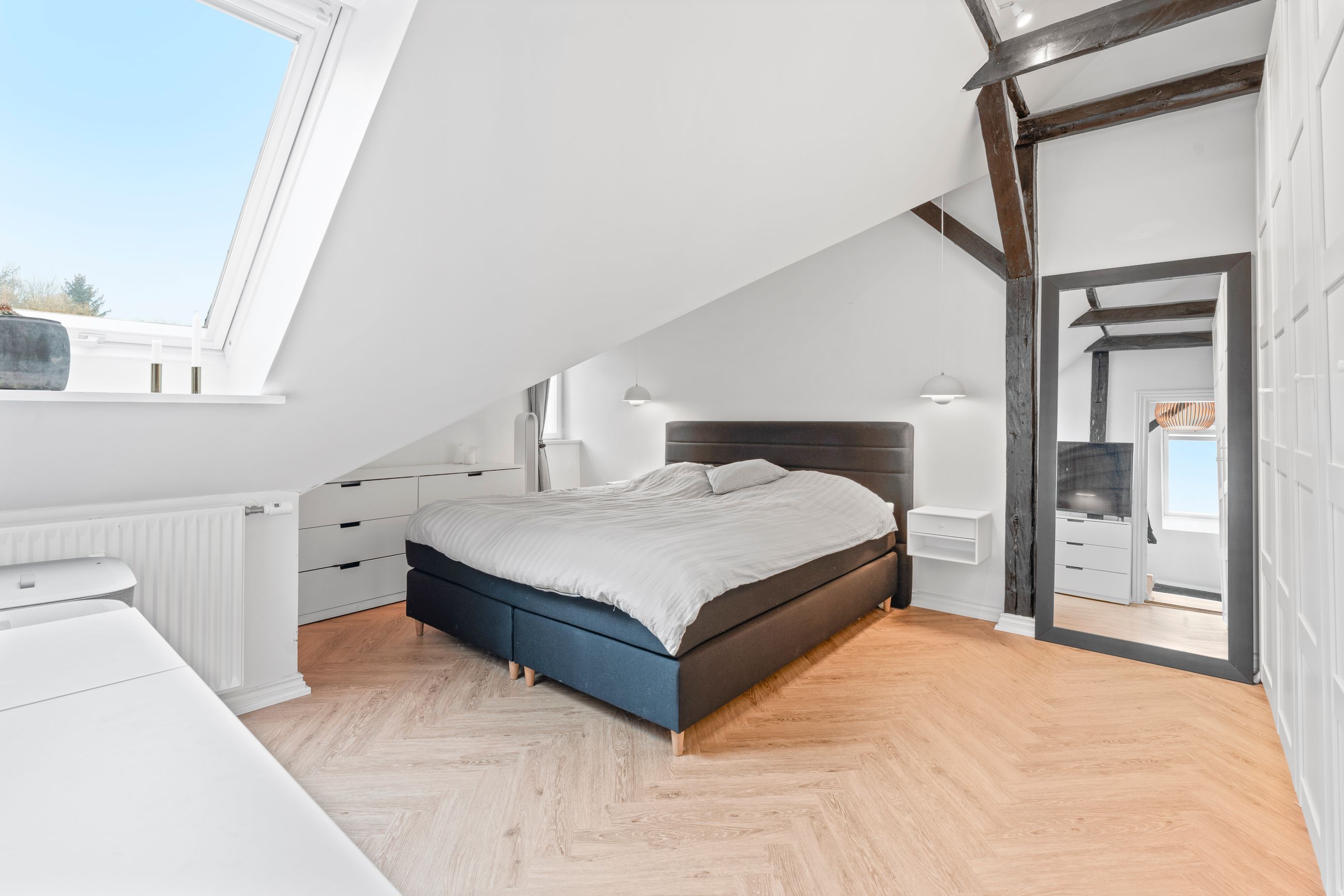 Det store soveværelse har fin plads til både seng og opbevaring, og badeværelset fremstår pænt og funktionelt med bruseniche og vaskefaciliteter. Over alrummet findes en stor hems, som giver ekstra fleksibilitet – ideel som kontor, gæsteplads eller hyggeligt frirum.