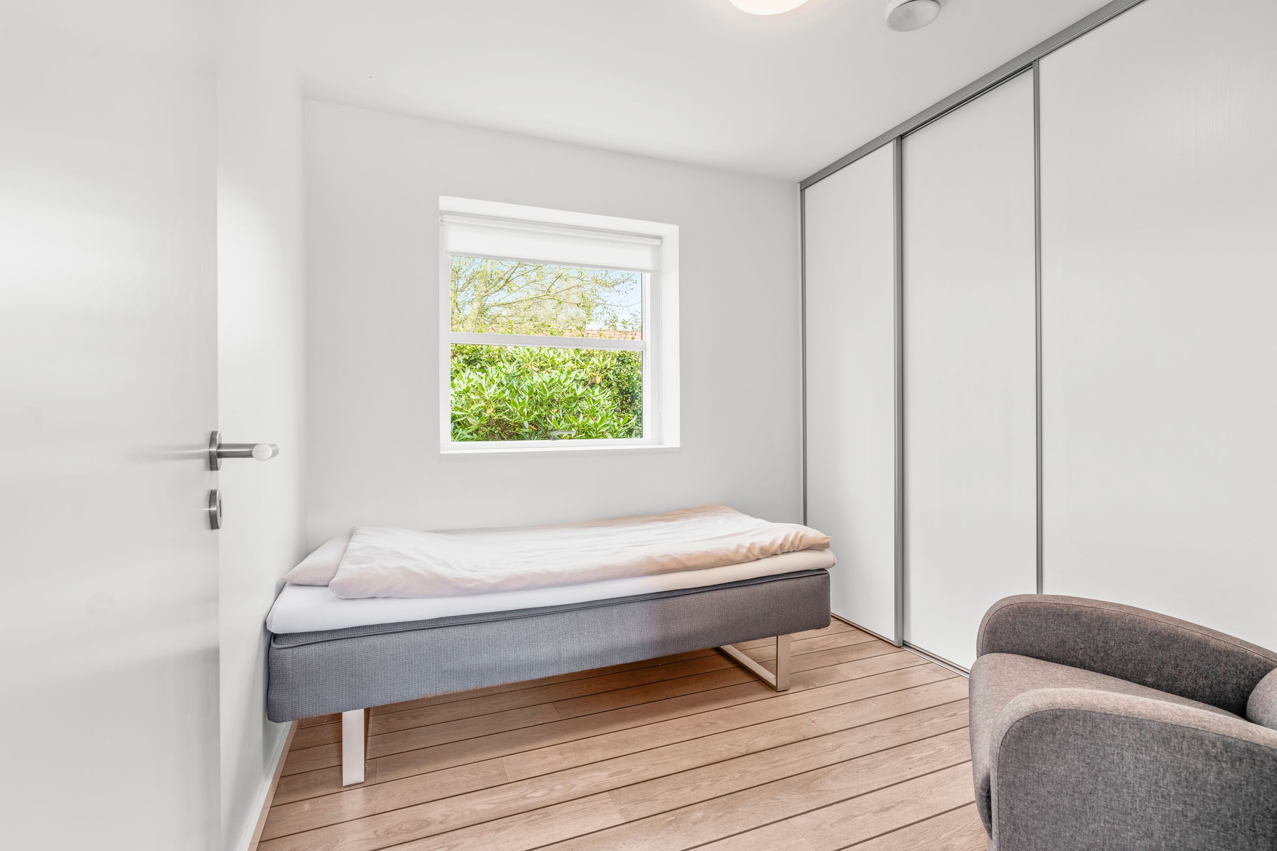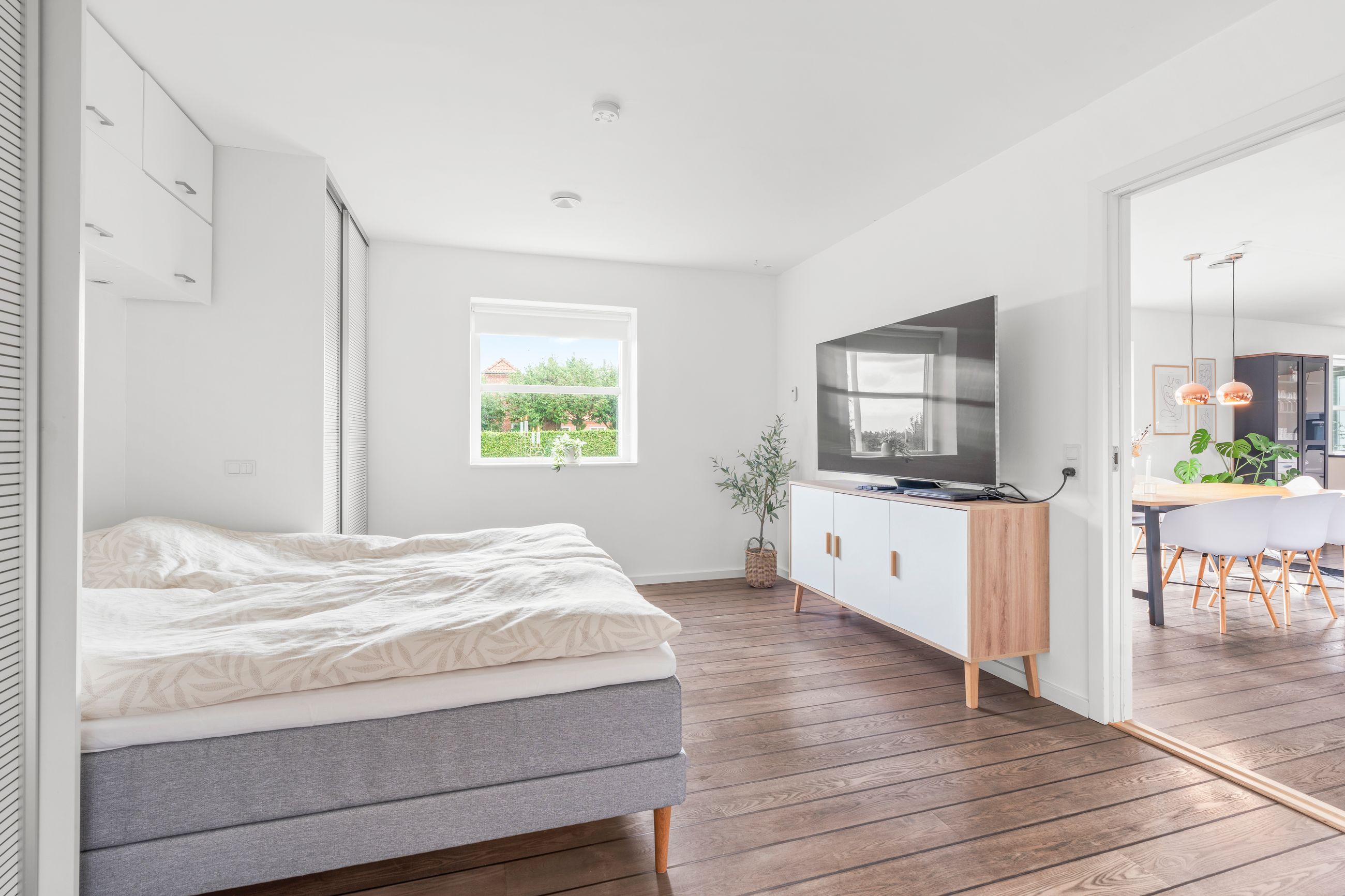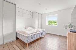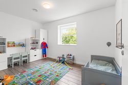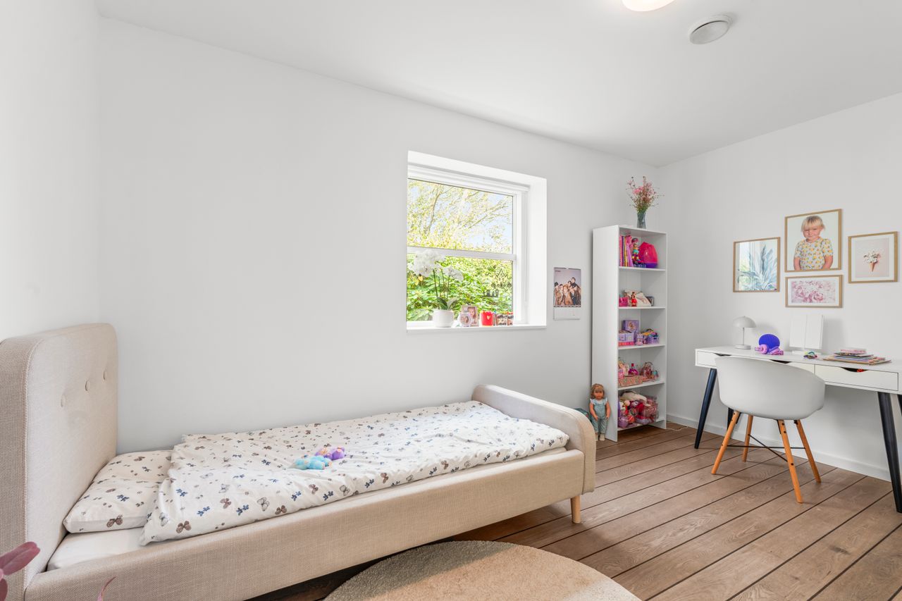 Boligen er praktisk indrettet med en tydelig opdeling i to afdelinger. I børneafdelingen finder du tre gode værelser samt et badeværelse. Midt i huset ligger det store leverum – køkken, alrum og stue i ét – hvor lysindfaldet og den åbne planløsning skaber en naturlig ramme om familiens hverdag. Fra køkken-alrummet ledes du videre til forældreafdelingen, som rummer et rummeligt soveværelse med eget badeværelse.