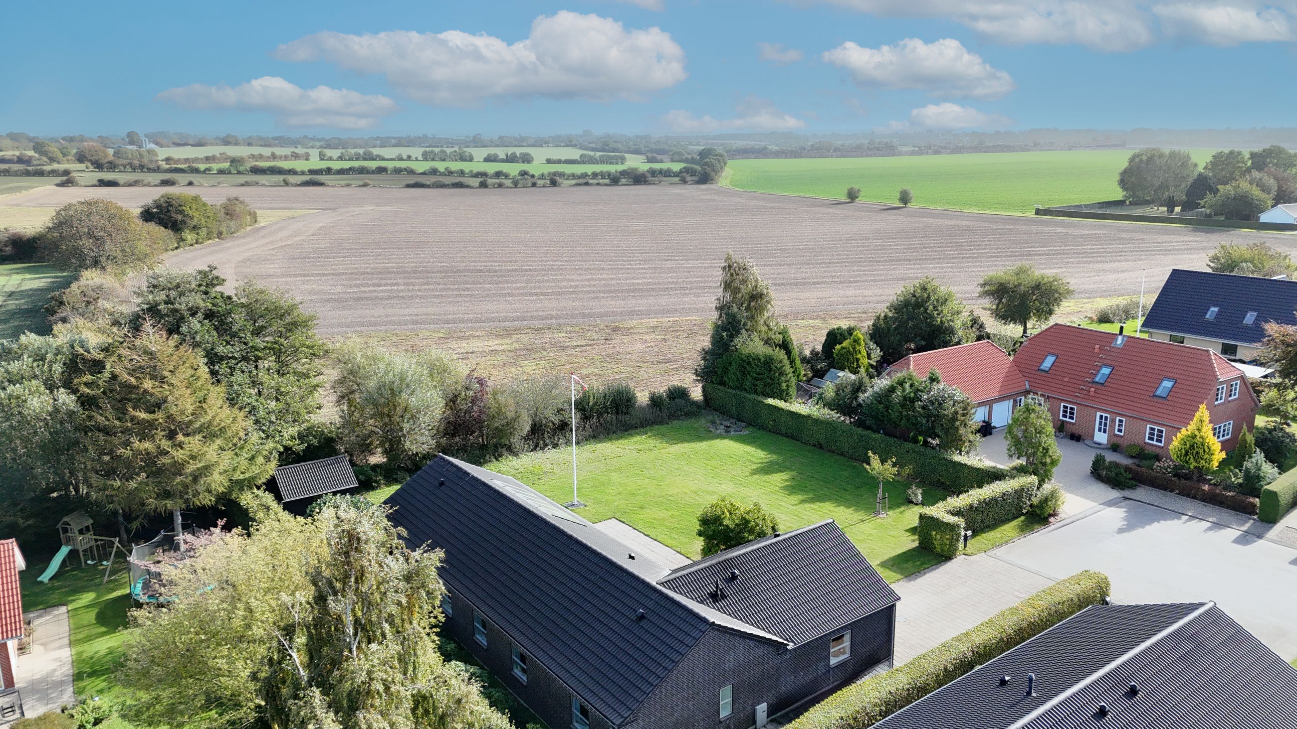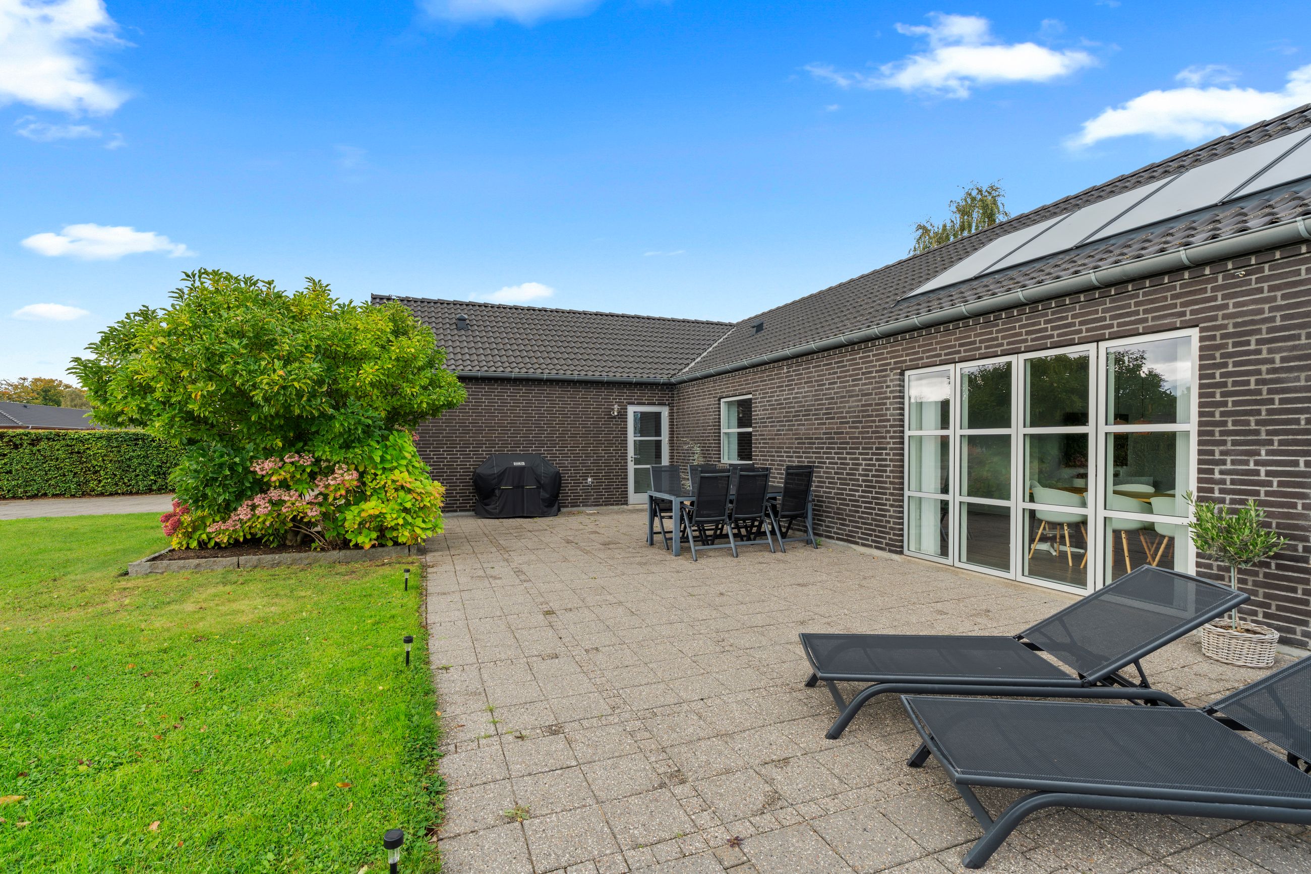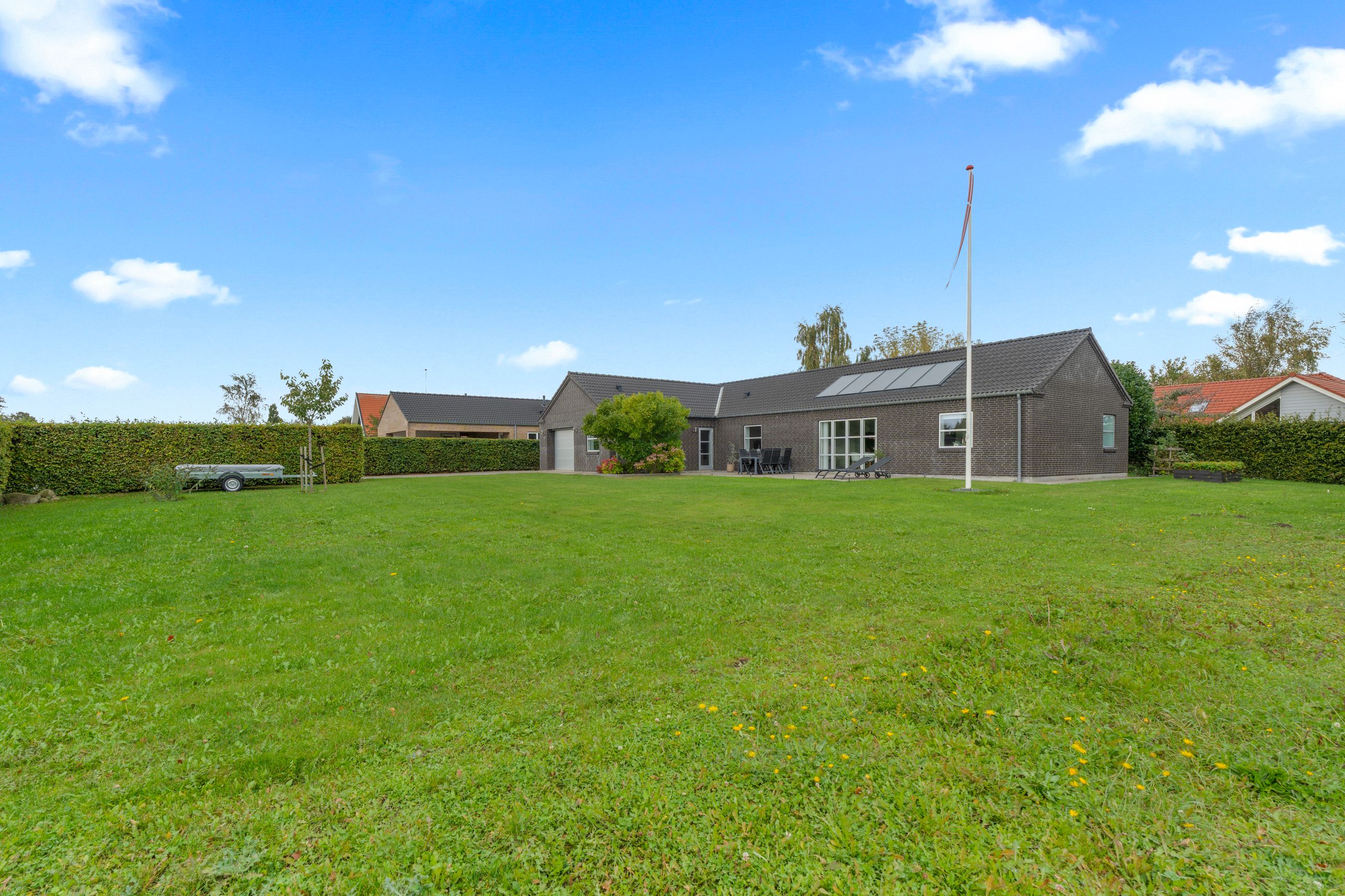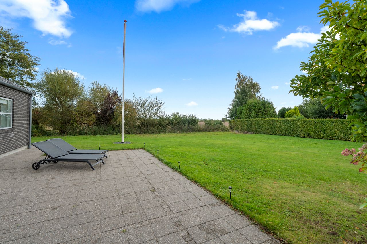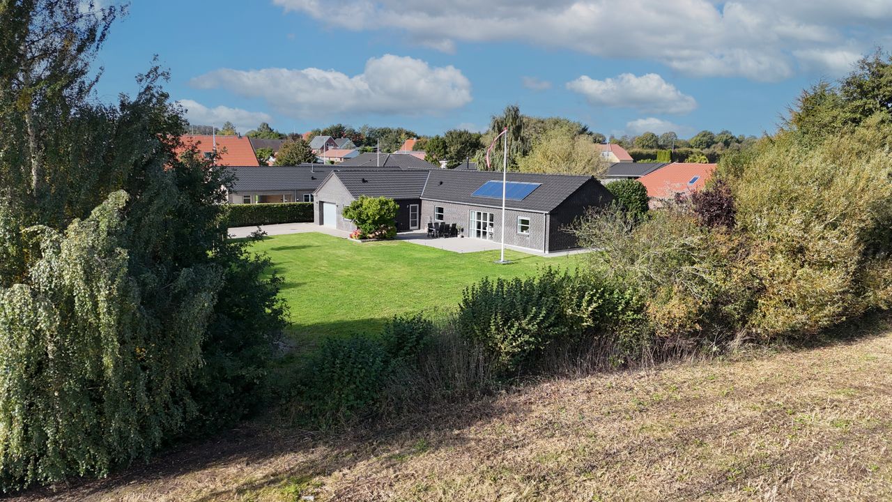 Udenfor venter en skøn have med plads til både leg og afslapning, og fra grunden er der kig til de omkringliggende grønne arealer. På taget er der installeret solceller, som sikrer en lav energiudgift og gør boligen endnu mere attraktiv.