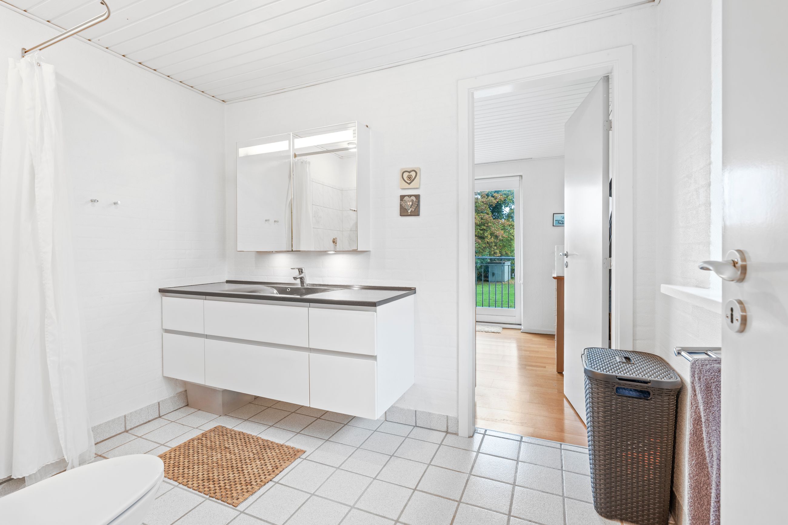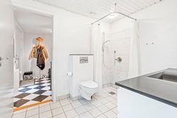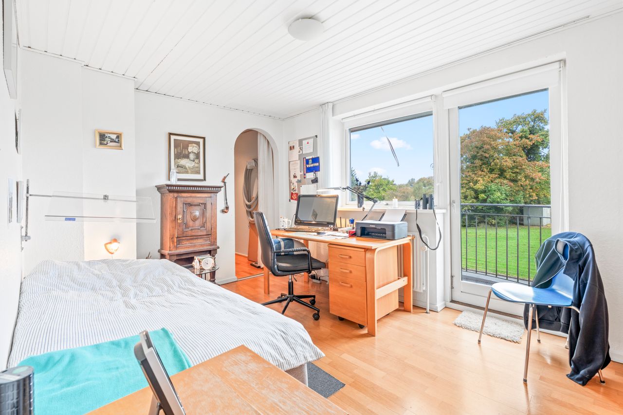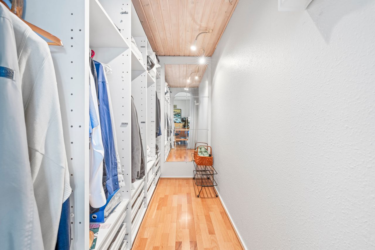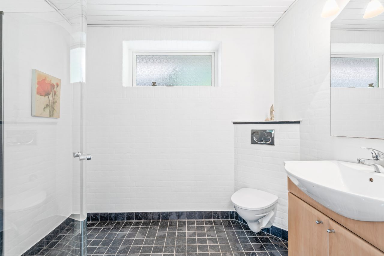 I den anden ende af huset findes forældreafdelingen. Her får I et soveværelse med eget walk-in, ligesom der er adgang til endnu et badeværelse, hvilket gør indretningen særligt funktionel til børnefamilien eller jer, der ønsker ekstra komfort.