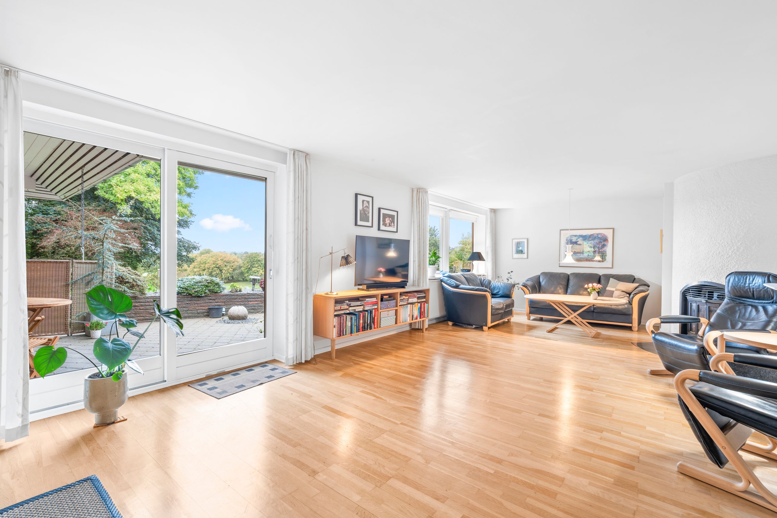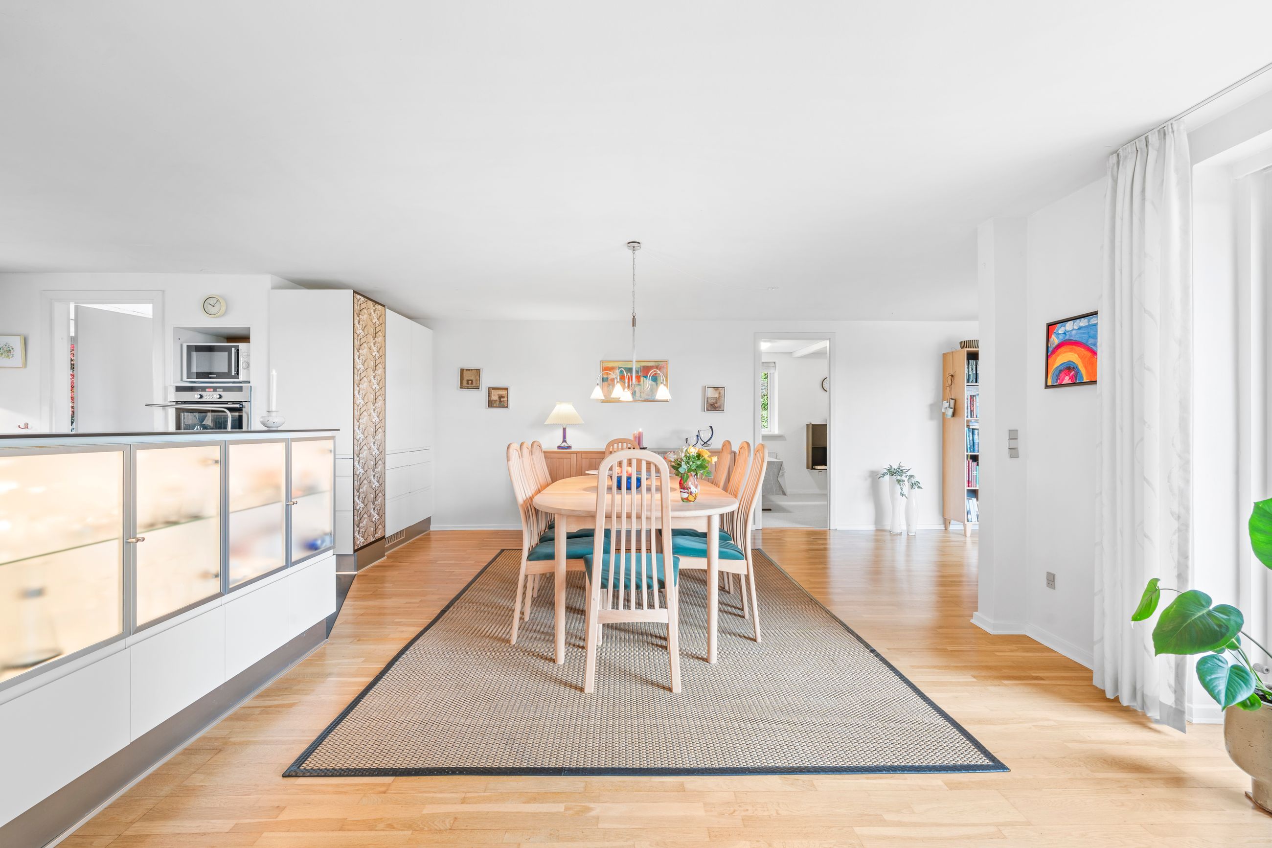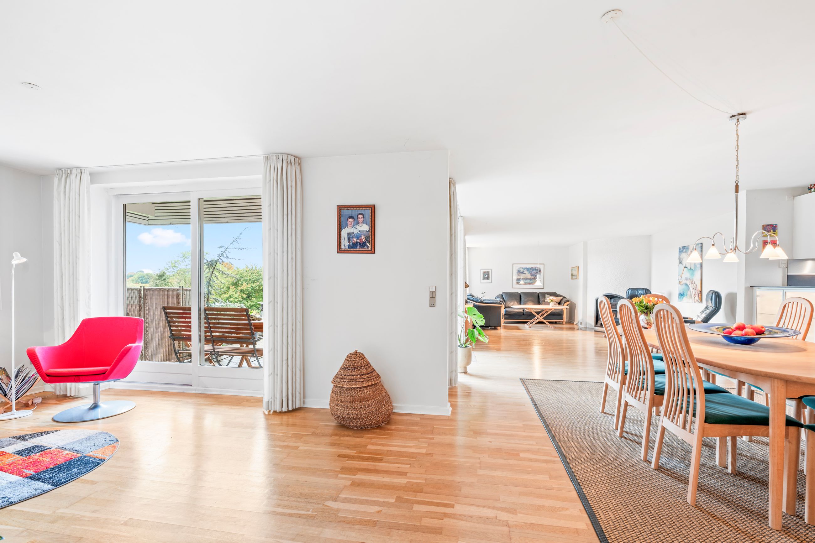 Husets hjerte er de store fælles opholdsrum, hvor køkkenet ligger i åben forbindelse med både spisestue og stue. Herfra er der udgang til et hyggeligt alrum, som gør det oplagt at samles til hverdag og fest. Det store lysindfald giver en dejlig atmosfære året rundt.