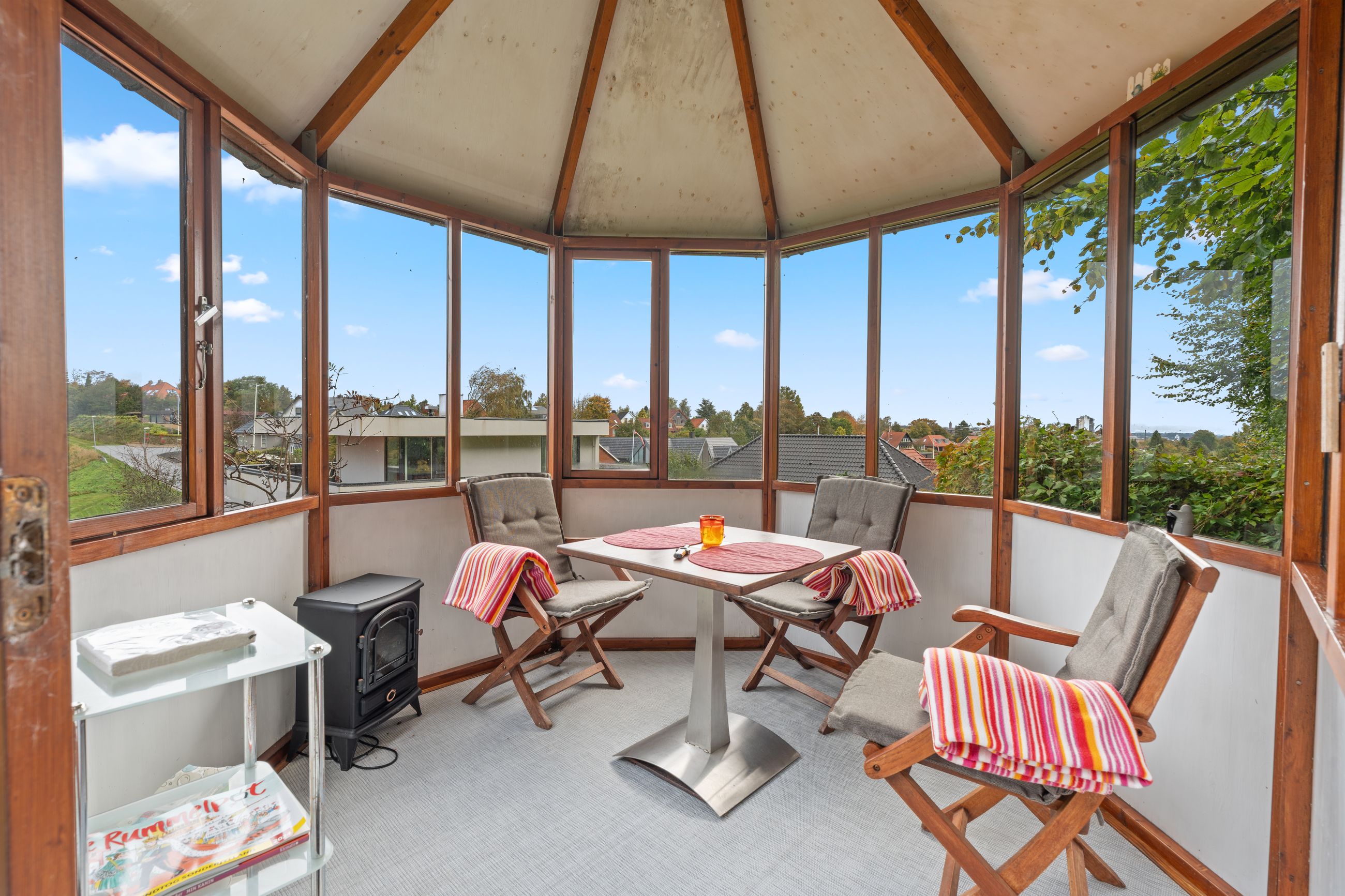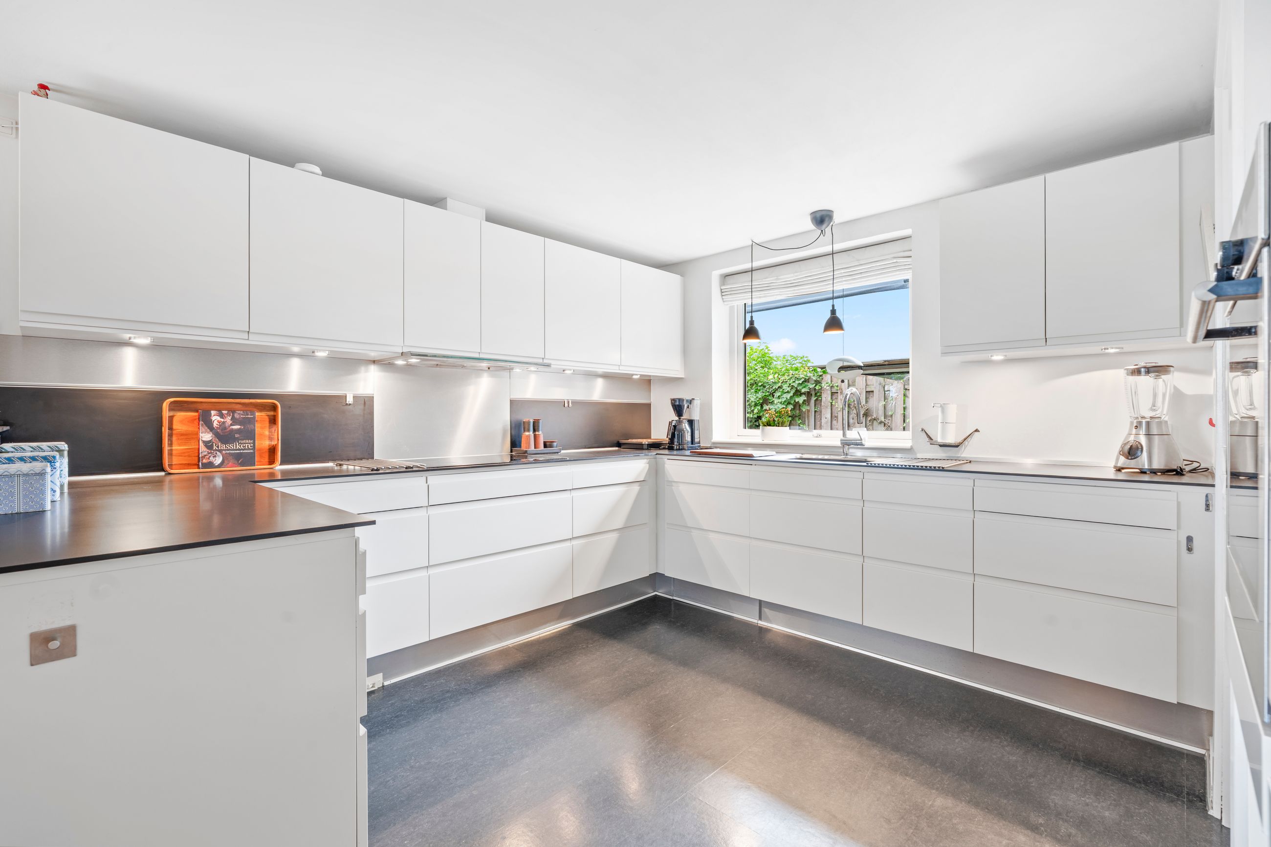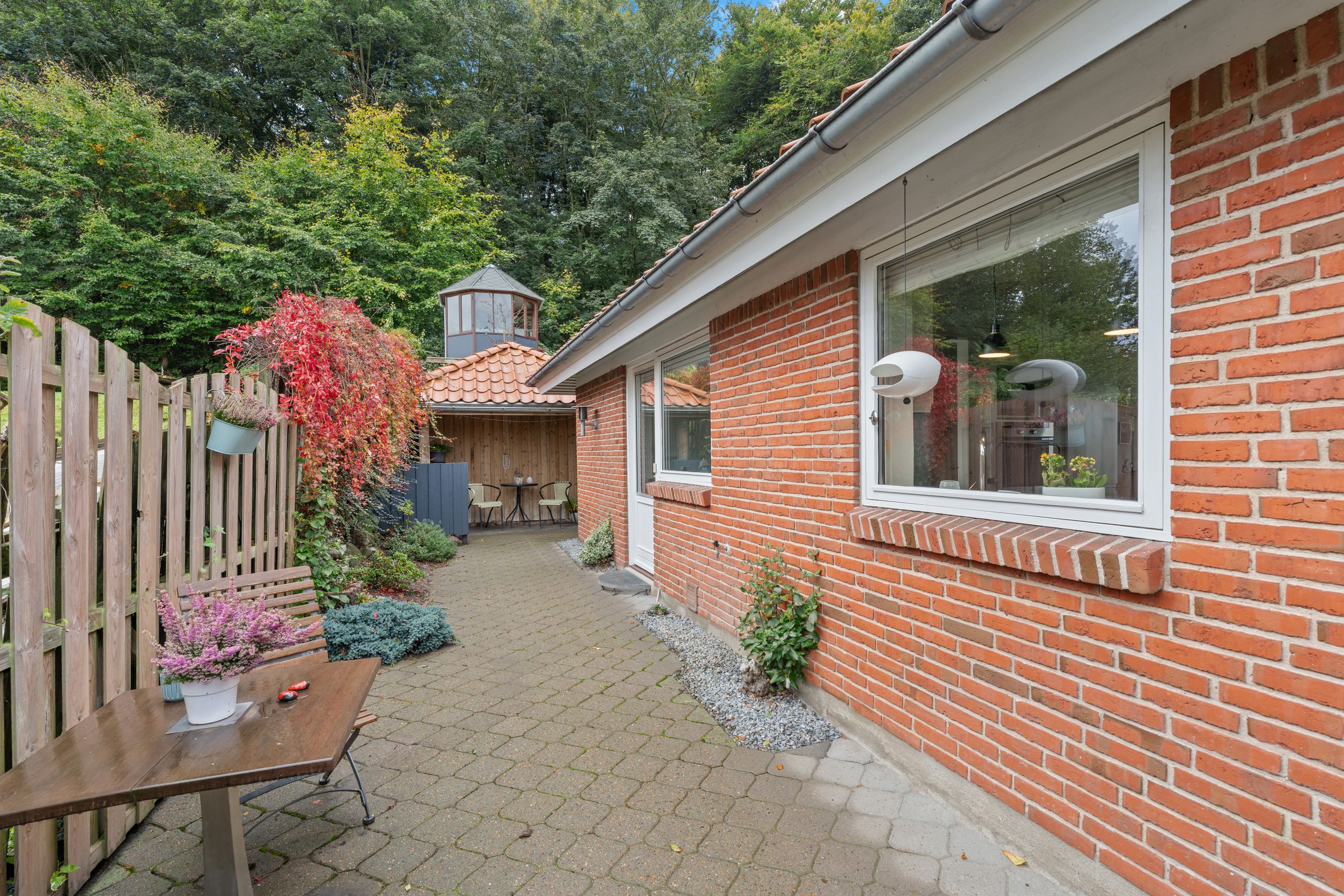 Husets hjerte er de store fælles opholdsrum, hvor køkkenet ligger i åben forbindelse med både spisestue og stue. Herfra er der udgang til et hyggeligt alrum, som gør det oplagt at samles til hverdag og fest. Det store lysindfald giver en dejlig atmosfære året rundt.
