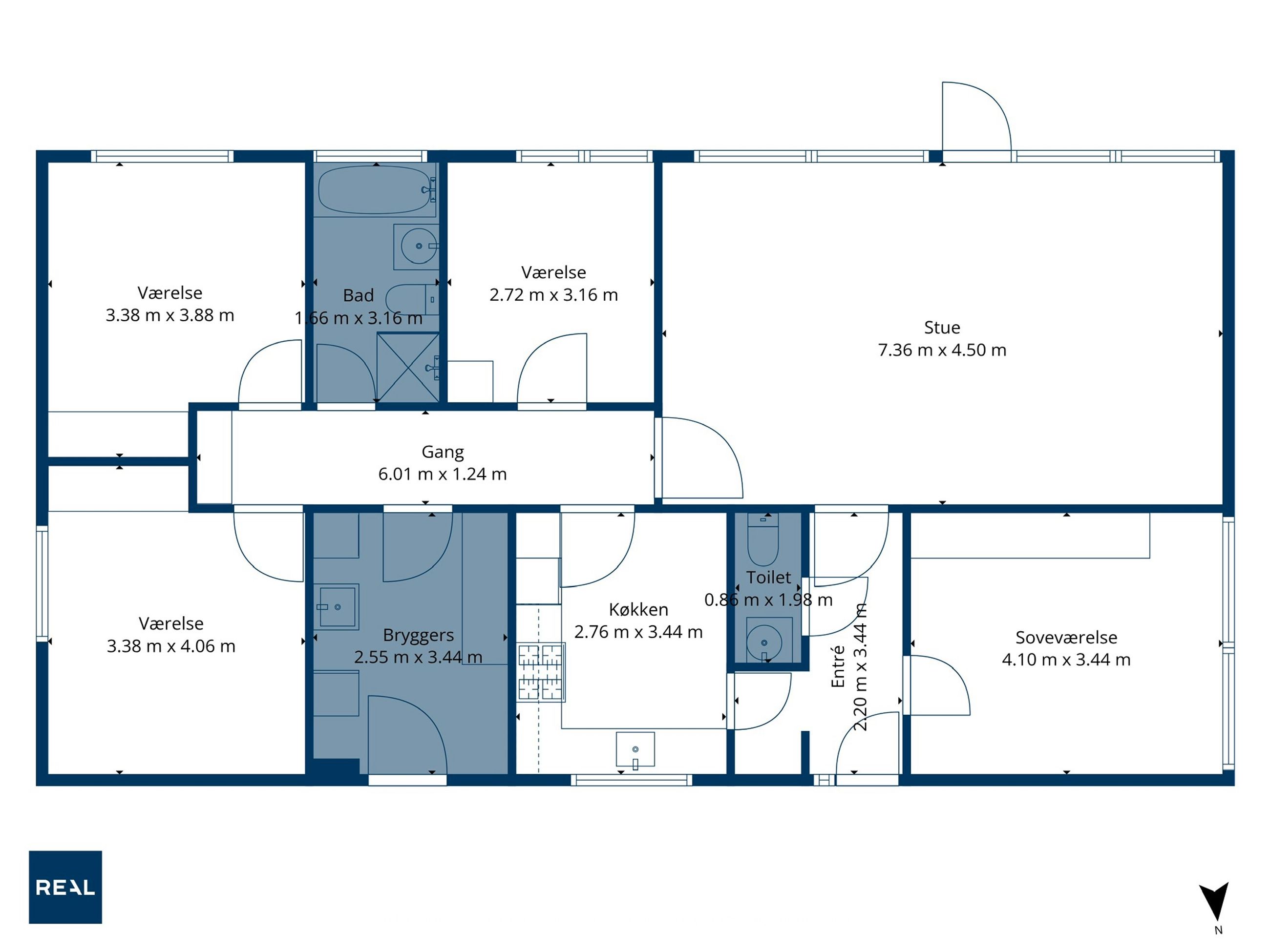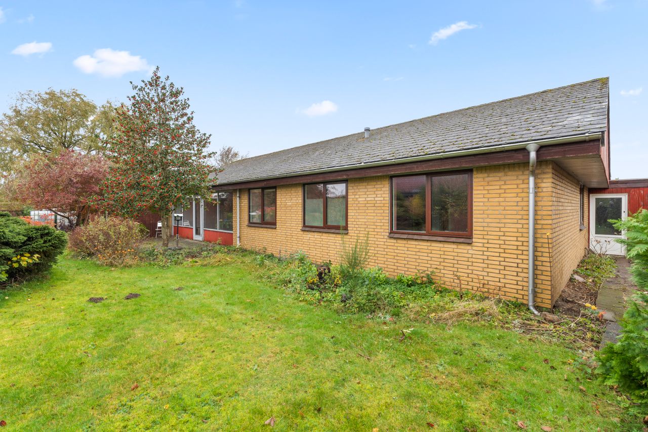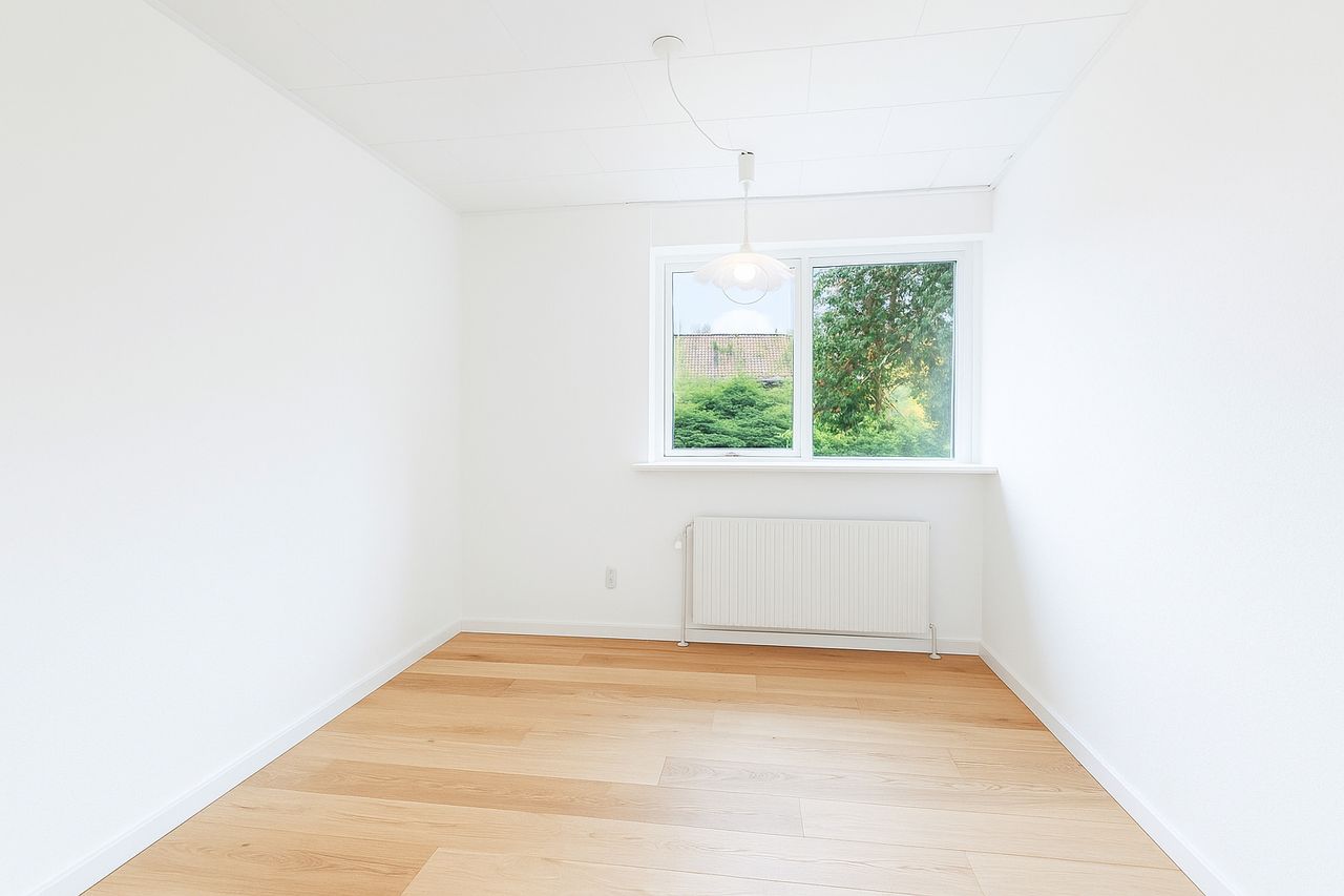 Indretningen er gennemtænkt med hele fire værelser – tre samlet i en soveafdeling og et ekstra værelse placeret for sig selv, oplagt til kontor, gæsteværelse eller teenager. Den store, lyse stue giver plads til både spisebord og sofagruppe, og det pæne køkken ligger praktisk placeret ved siden af. Hjemmet rummer desuden et funktionelt bryggers med egen indgang, en god entré samt både et pænt badeværelse og et gæstetoilet – en stor fordel i hverdagen for børnefamilien.