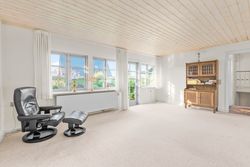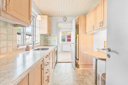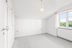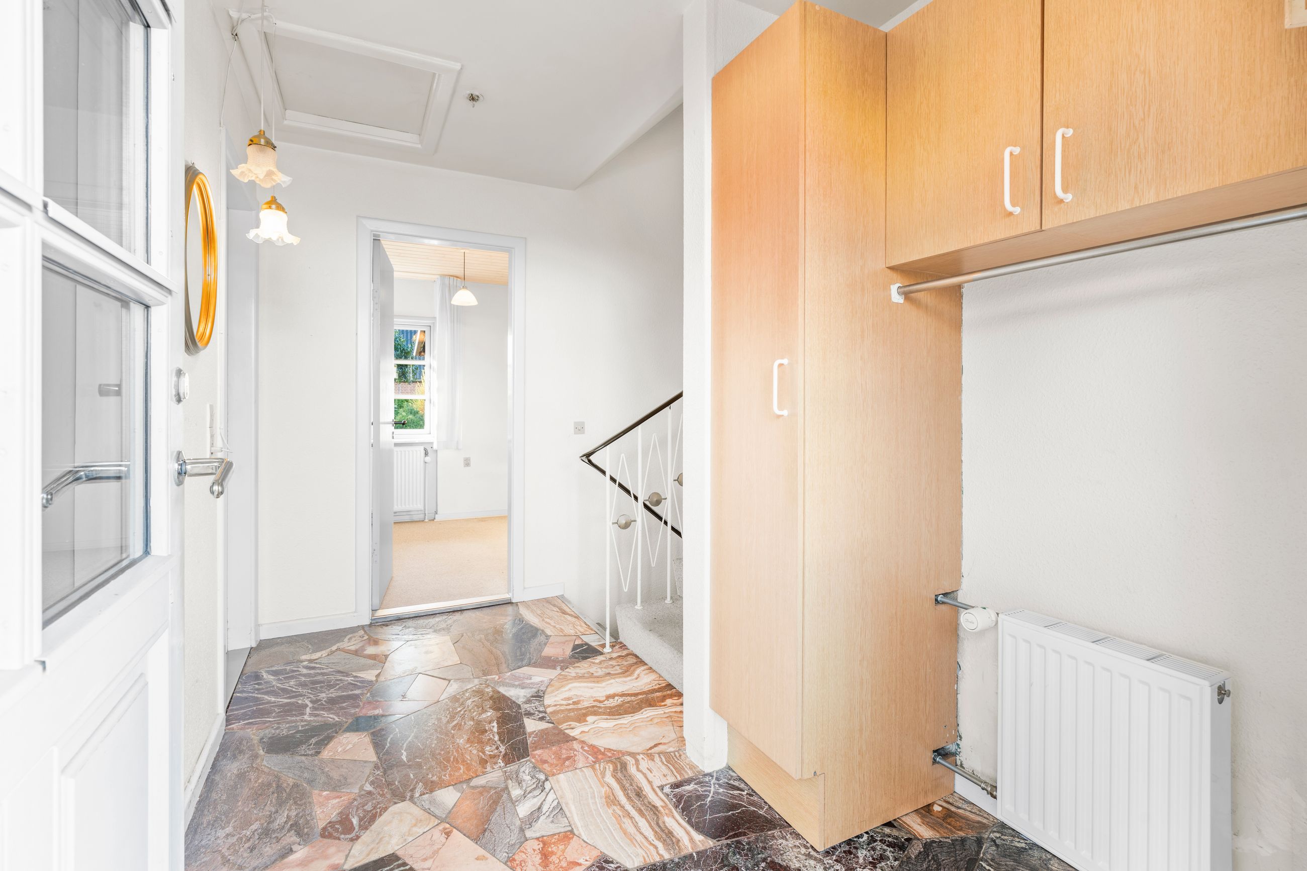 Indenfor træder du ind i en entré med adgang til køkkenet og videre til den lyse stue. Her er god plads til både spisebord og sofa, og ønsker du et moderne køkken-alrum, er der oplagte muligheder for at åbne op. Fra stuen er der direkte udgang til en dejlig terrasse, hvor du kan nyde morgensolen, en kop kaffe eller rolige stunder i det fri. I stueplan findes desuden et værelse og et badeværelse, mens førstesalen rummer yderligere to gode værelser.